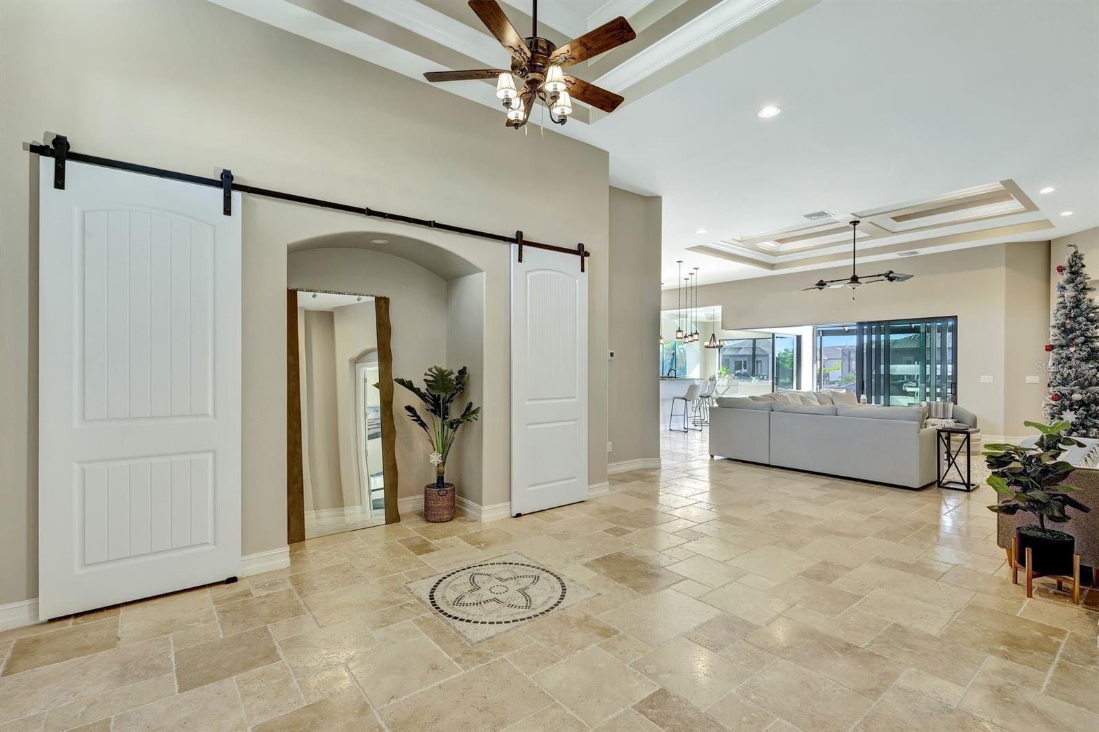2 Owners Suites, Gulf Access, w/Pool, Composite Dock & 16k Boat Lift! Elegant & Modern, Durable & Efficient - Built to last in 2018 using ICF(Insulated Concrete Form) Construction w/STEEL REINFORCED POURED CONCRETE WALLS that reduces noise, are energy efficient, mold &mildew resistant, & most importantly ensures to protect against fires & hurricanes. 4-BR, PLUS den, ICF-built home offers over 3,100 sqft of living space & blends timeless travertine stone, neutral colors & nautical touches throughout. From the moment you pull up you can see this is not like the others. It starts w/the HUGE paver driveway that can accommodate 6+ cars, 3 oversized custom hurricane rated garage doors, stylish flat tile roof & paver walkway that leads to the elegant double door entry. Step inside to a grand foyer w/double-trayed ceiling adorned w/crown molding, decorative niches & tile inlay all creating an immediate sense of luxury. Travertine flooring flows from the front door through the entire home, all the way to the dock area & beyond. Great room boasts 12-foot coffered ceilings w/backlighting, complemented by 90-degree pocket sliding doors that seamlessly integrate indoor & outdoor living spaces. Formal dining area features tray ceilings w/recessed lighting & crown molding. Gourmet kitchen showcases Samsung Smart Connect appliance package, wall oven, stovetop, custom cabinets w/spice rack, dove-tail soft-close drawers, vent hood, tile backsplash and prep island w/ample counter space. Laundry room offers direct access to the owner's suite, featuring granite countertops for folding, upper & lower cabinets, & LG stacked washer & dryer. The spacious primary bedroom offers private lanai access, water views, & tray ceilings w/recessed lighting & crown molding. The ensuite bathroom is a spa-like retreat w/floor-to-ceiling travertine, soaking tub, walk-through shower w/multiple shower heads, & transom windows allowing for natural light. Home offers a second owner's suite w/private lanai access, an en-suite bathroom/pool bath & walk-in closet for added convenience. 3-cargarage is a standout feature, offering 12-foot ceilings (car lift friendly) & tiled floors, providing functionality & aesthetic for the perfect handyman haven. Step outside to your personal paradise. The lanai boasts unobstructed water views through picture window screens, heated custom pool w/sun shelf, lounging bench & cascading spa. Boaters will delight in the newer built low maintenance composite dock featuring tiki hut w/power & lighting &16,000 lb boat lift. Additional features include roll-down shutters, French drains, low maintenance zero scaping, & an outdoor shower on the lanai. This home is a true gem, offering an unmatched combination of elegance, functionality, durability & waterfront living. Assessments paid & furnishings are negotiable making this the perfect combination for YOUR luxury getaway! Don't miss the opportunityto make this stunning property your own!