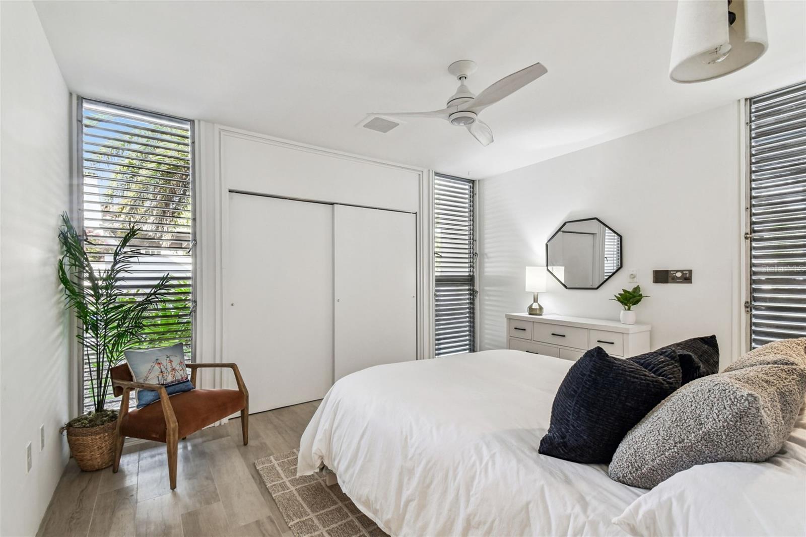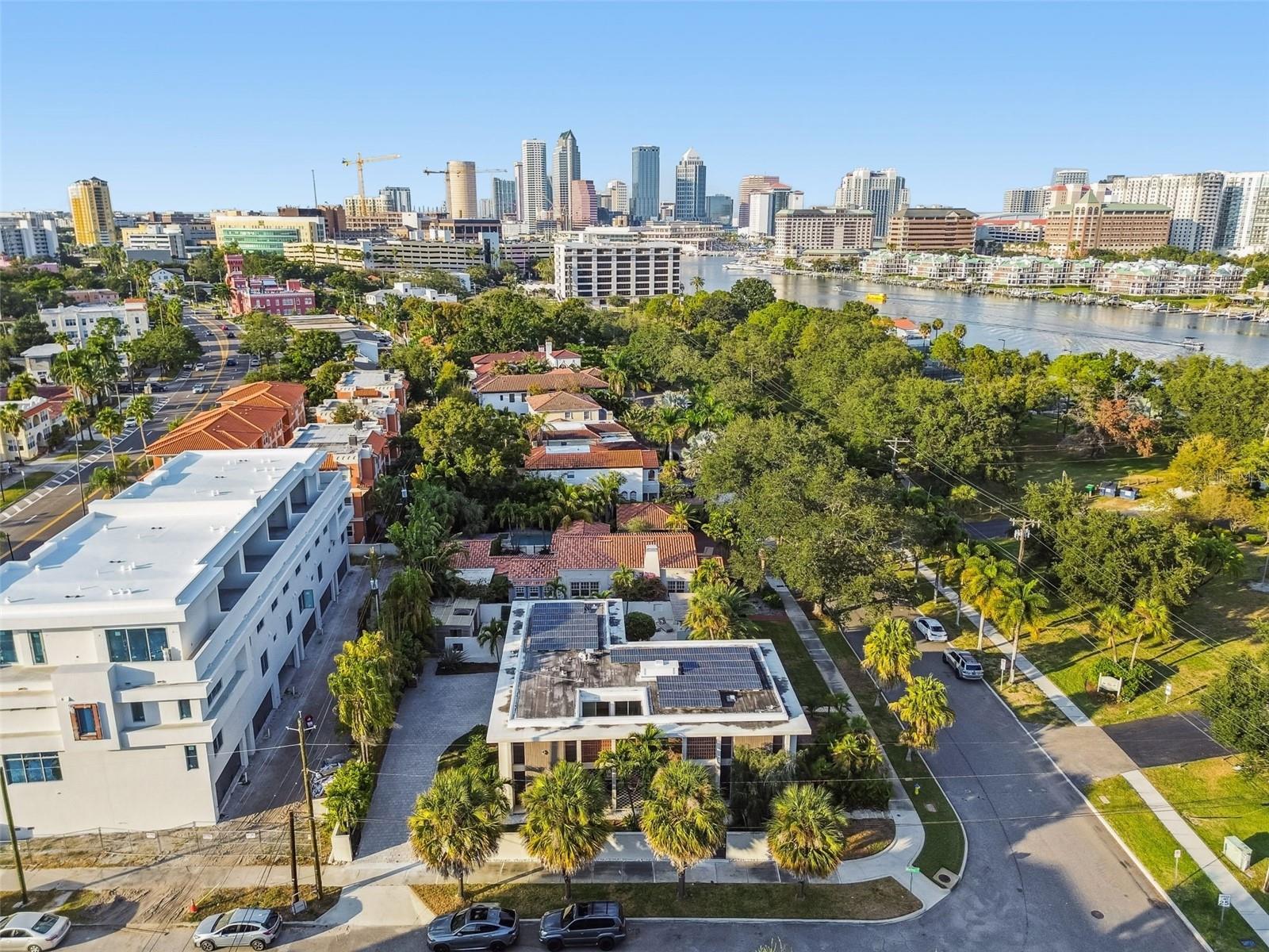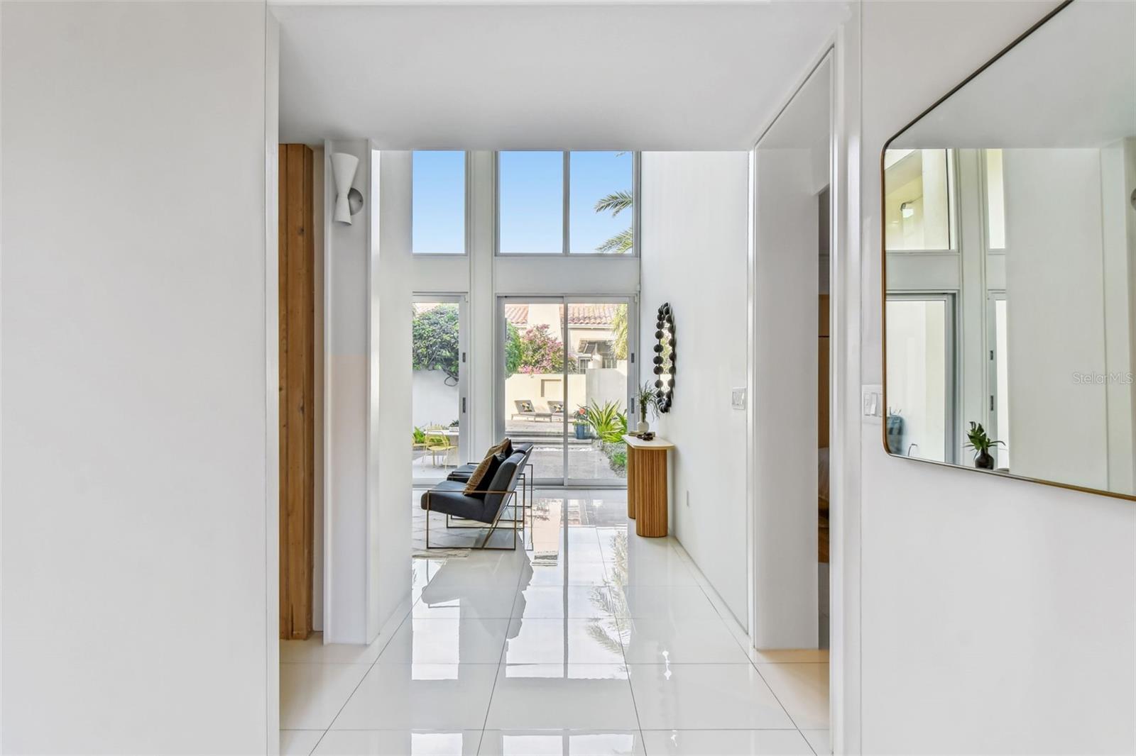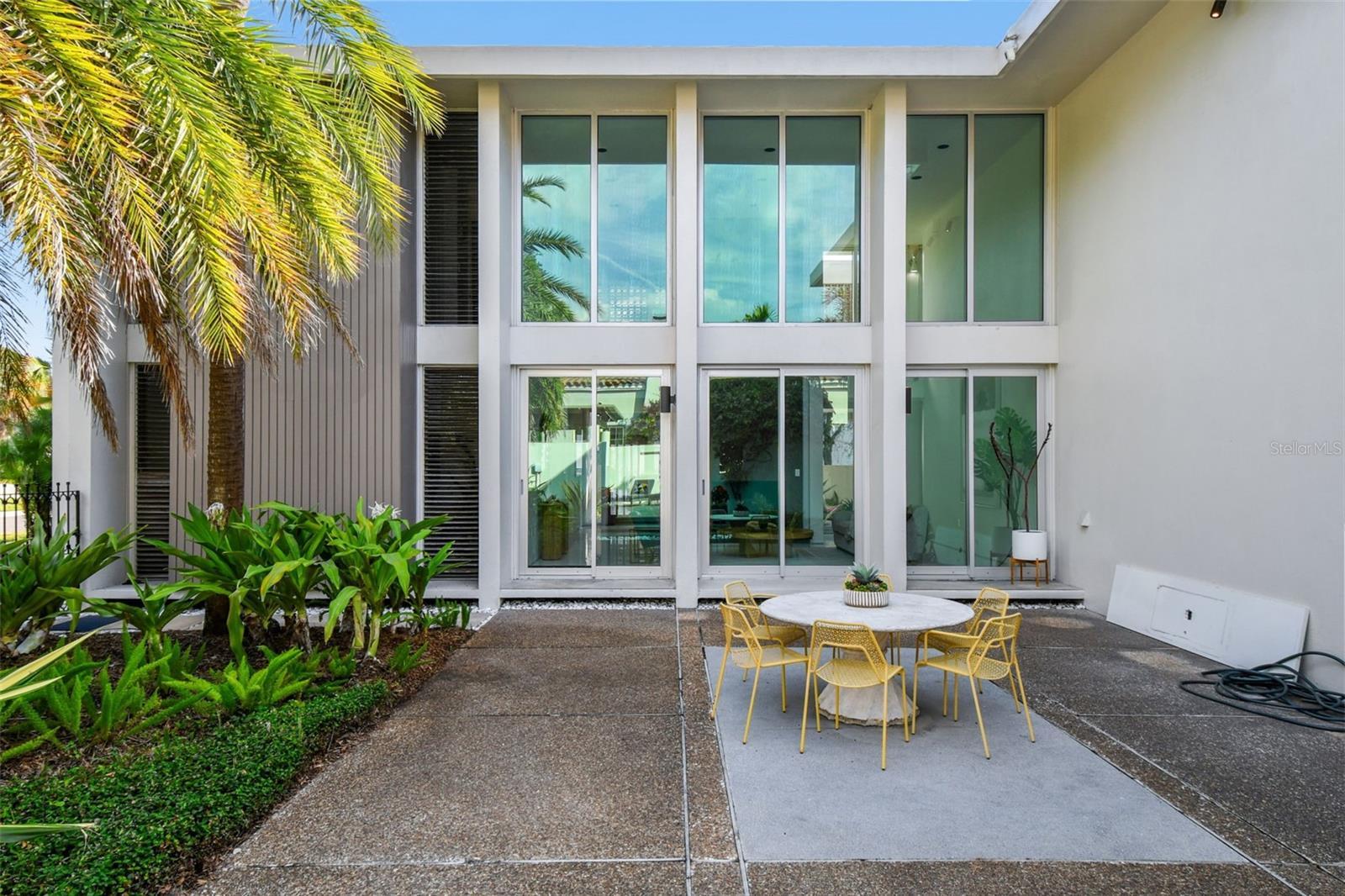 Come discover this Tampa treasure — a rare mid-century modern masterpiece and one of the most significant Florida Art buildings of the 1960s. Designed in 1964 by renowned architect Robert Wielage and recognized by the AIA as one of Tampa Bay’s top 15 architectural landmarks of the era, this walled compound offers an extraordinary blend of art, architecture, and indoor-outdoor living. Conceived to embrace Florida’s subtropical landscape, the residence is constructed of concrete and steel with dramatic floor-to-ceiling glass, creating seamless views of multiple courtyards, lush plantings, and the elevated pool concourse. Enter through Havana-style wrought-iron gates beside a bubbling reflecting pool and step into a breathtaking two-story living room with 20-foot ceilings and an original glass mosaic fireplace—one of the home’s signature design moments. The main level features expansive public spaces with large white porcelain tile floors, a formal dining room with custom built-ins, and a beautifully updated kitchen boasting quartz countertops, brand new custom cabinetry, and an adjacent entertaining bar. A firstfloor bedroom with en-suite bath, plus an additional office/den, offer flexible living options. Upstairs, the private primary suite includes a newly updated bath and an oversized dressing room. Two additional bedrooms share a Jack-and-Jill bath, and a striking ultramodern gym/yoga studio—designed as a true architectural feature—anchors the second wing. Impact-rated Monolithic 9/16" SB70XL Low-E glass was installed throughout, enhancing efficiency and sound performance. Outside, the grounds are simply extraordinary. A 40-foot lap pool, travertine pool concourse, loggia, and a custom slat-wood orchid house create multiple outdoor rooms for entertaining or quiet retreat. The property also includes a gated parking court and an oversized two-car garage with custom doors. A solar system that powers the entire home and newer roof further elevate the home’s modern comforts. Walled on all four sides and set on over ¼ acre, this is a truly exceptional example of Florida-adapted mid-century modern architecture—a residence that inspires a new way of living.