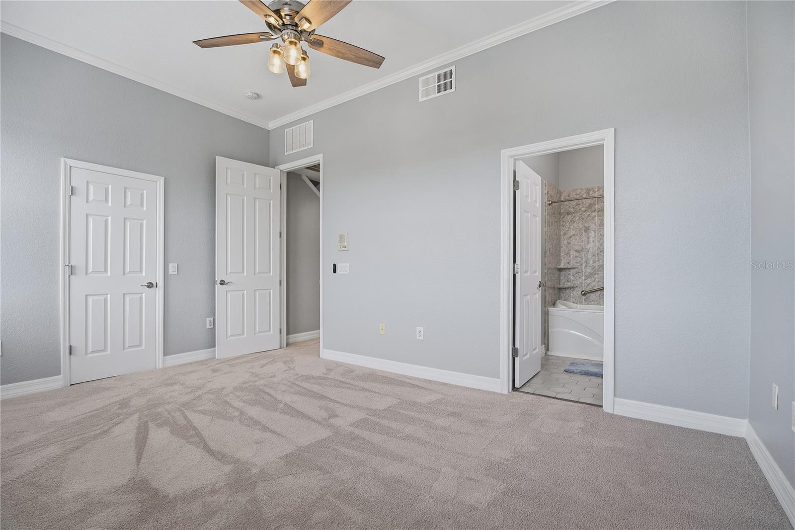 - Accessibility Features, Cathedral Ceiling(s), Ceiling Fans(s), Central Vaccum, Elevator, High Ceilings, Living Room/Dining Room Combo, Open Floorplan, PrimaryBedroom Upstairs, Solid Surface Counters, Solid Wood Cabinets, Split Bedroom, Stone Counters, Thermostat, Walk-In Closet(s), Window Treatments