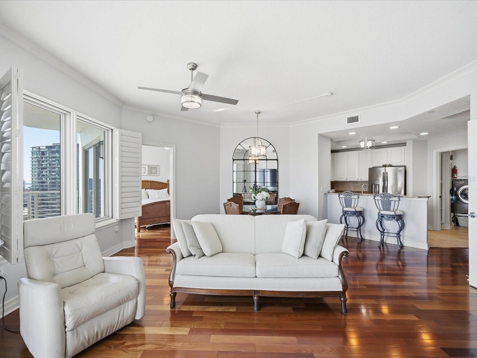We are pleased to present this beautiful property in the Towers of Channelside, located in Tampa's Channel District! A spacious unit with SPECTACULAR VIEWS of Garrison Channel, Sparkman Channel, Sparkman Wharf and Harbour Island, this 2 bedroom, 2.1 bath, 1,165 sq. ft. condominium features a light and bright open floor plan with neutral decor! Upon arriving at the property, you will notice a home that has been impeccably maintained. Features include: an inviting great room well suited for entertaining and with access to a sizeable tiled balcony with gorgeous views; an updated kitchen with newer appliances (refrigerator, microwave, and dishwasher) and granite counter tops; HARDWOOD FLOORS, CROWN MOLDING, AND PLANTATION SHUTTERS; new flooring in the kitchen, foyer, and laundry room; NEW LIGHT FIXTURES; ceiling fans in both bedrooms and in the great room; WALL MOUNTED TV'S; custom built ins; laundry room (not a closet laundry) with raised, full size washer and dryer; recent INTERIOR PAINT; two interior storage closets; custom built office space; TWO ASSIGNED GARAGE PARKING SPACES AND TWO BUILDING STORAGE SPACES; immaculate condition and more! The Towers of Channelside offers 24 hour security, an enormous RESORT STYLE POOL with spa, rock waterfall, and grill station, designated dog walk areas, and SPACIOUS CLUBHOUSE. With easy access to Sparkman's Wharf, Harbour Island, and the Water Street District, Towers of Channelside offers a convenient location for dining, shopping, entertainment, fitness centers, work and more, a fantastic place to call home!