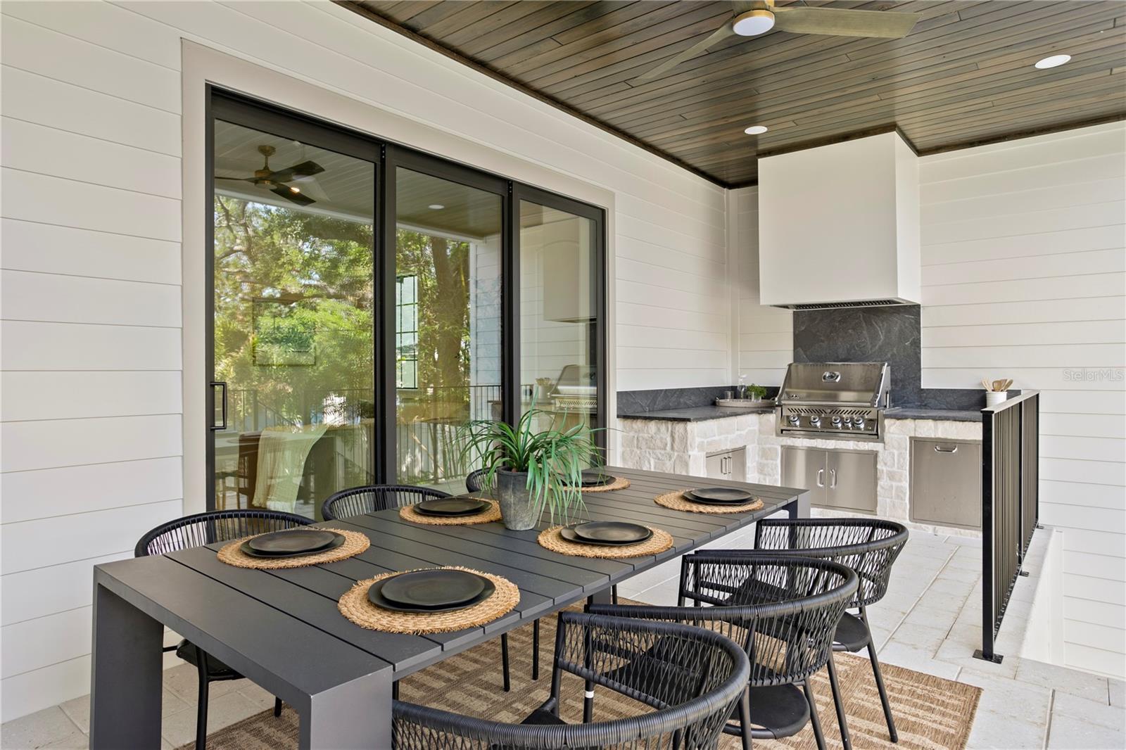 - Lighting, Outdoor Grill, Outdoor Kitchen, Rain Gutters, Sidewalk, Sliding Doors, Storage