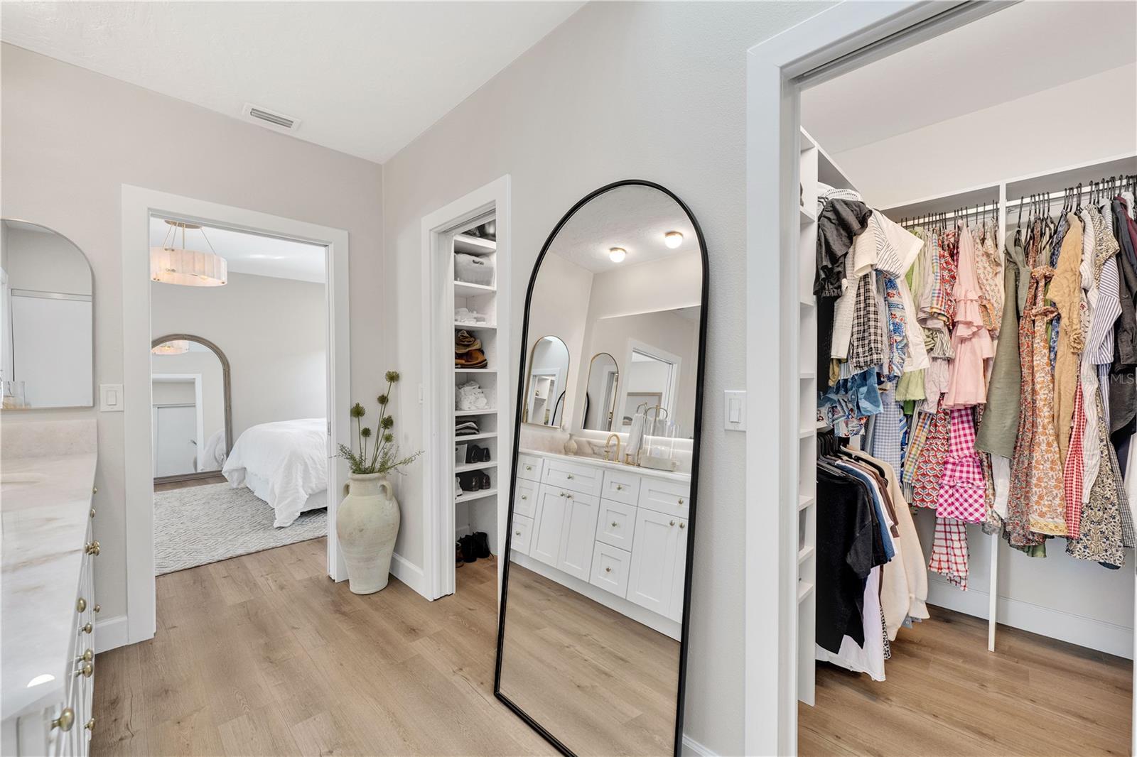 - Cathedral Ceiling(s), Ceiling Fans(s), Eat-in Kitchen, High Ceilings, Kitchen/Family Room Combo, Open Floorplan, Primary Bedroom Main Floor, Solid Wood Cabinets, Split Bedroom, Stone Counters, Thermostat, Vaulted Ceiling(s), Walk-In Closet(s)