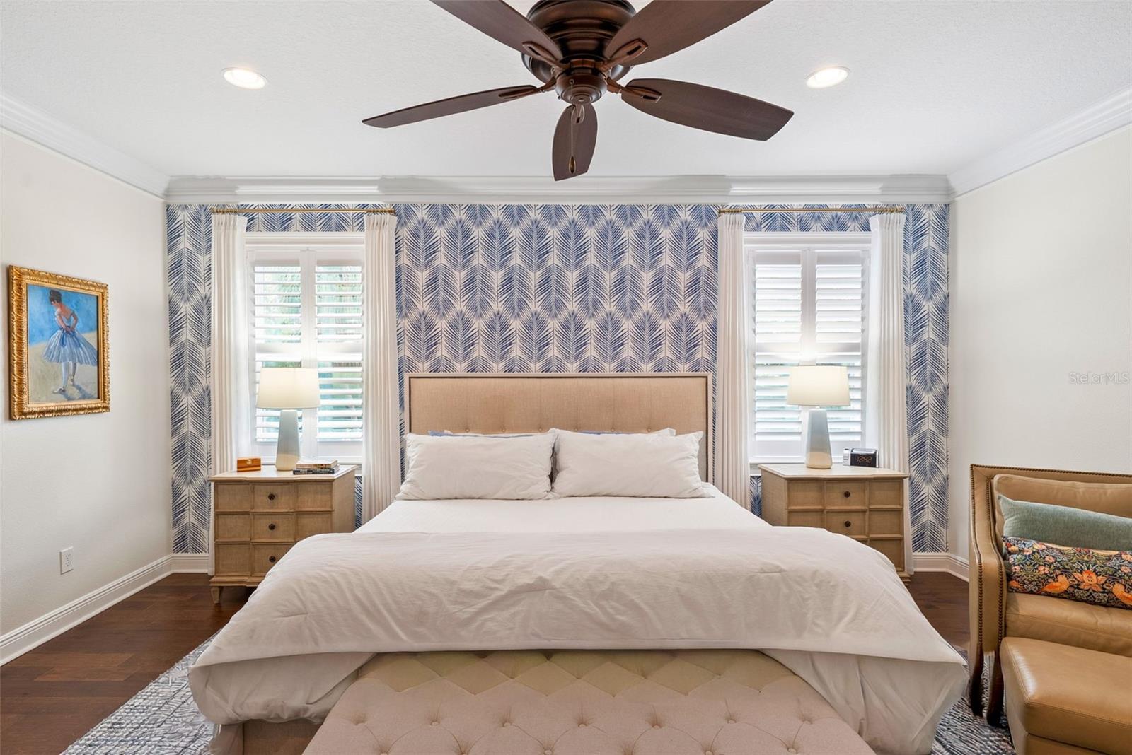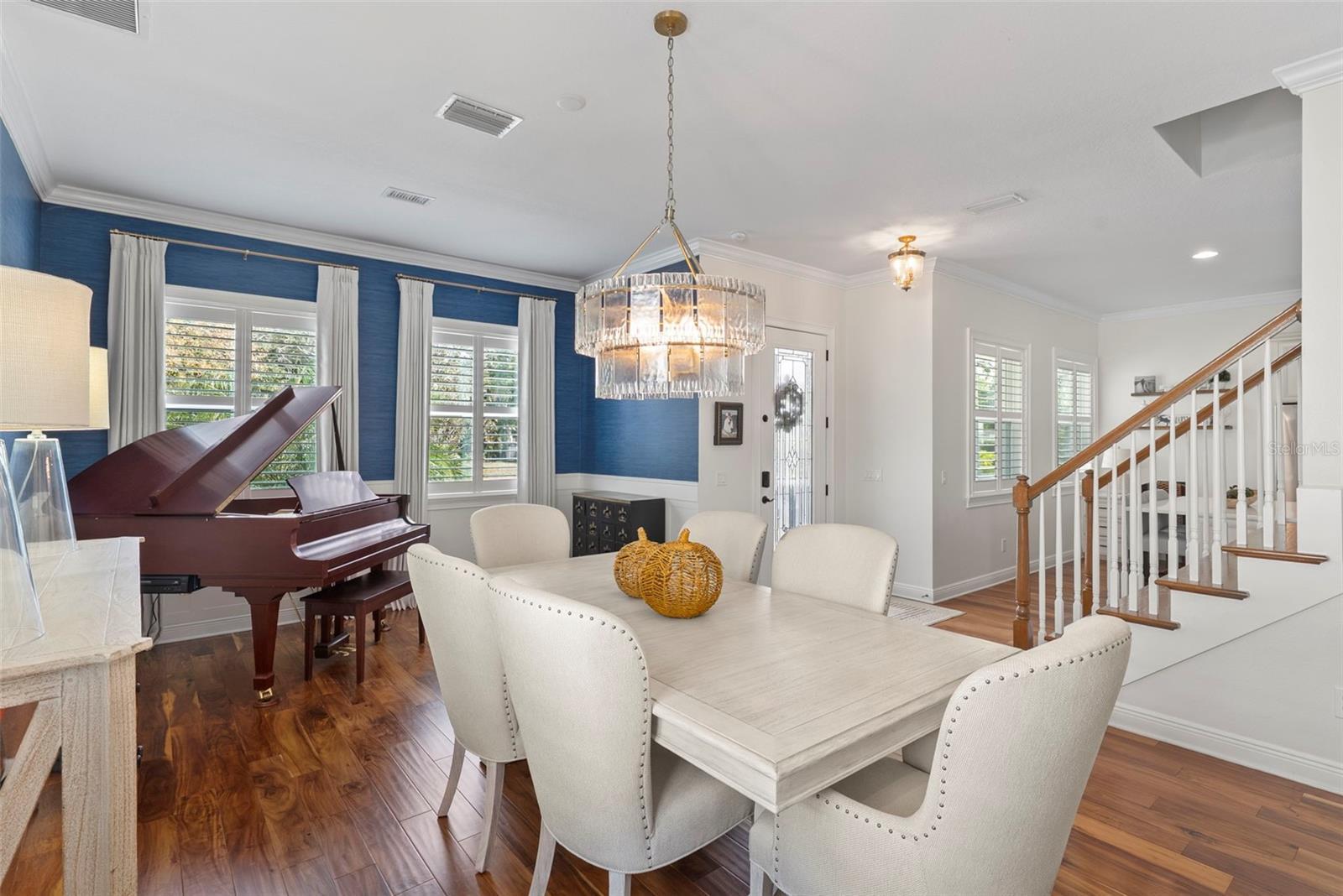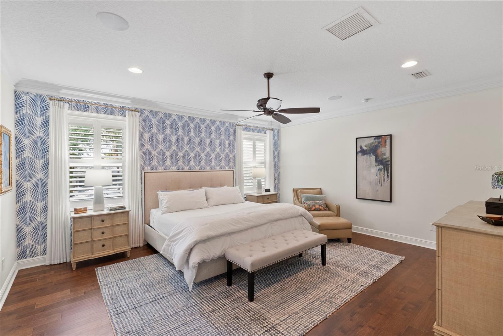 - Ceiling Fans(s), Chair Rail, Crown Molding, Dry Bar, Eat-in Kitchen, High Ceilings, Pest Guard System, PrimaryBedroom Upstairs, Smart Home, Stone Counters, Thermostat, Walk-In Closet(s), Window Treatments
