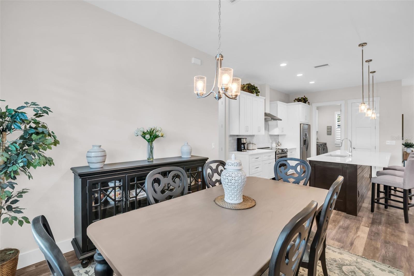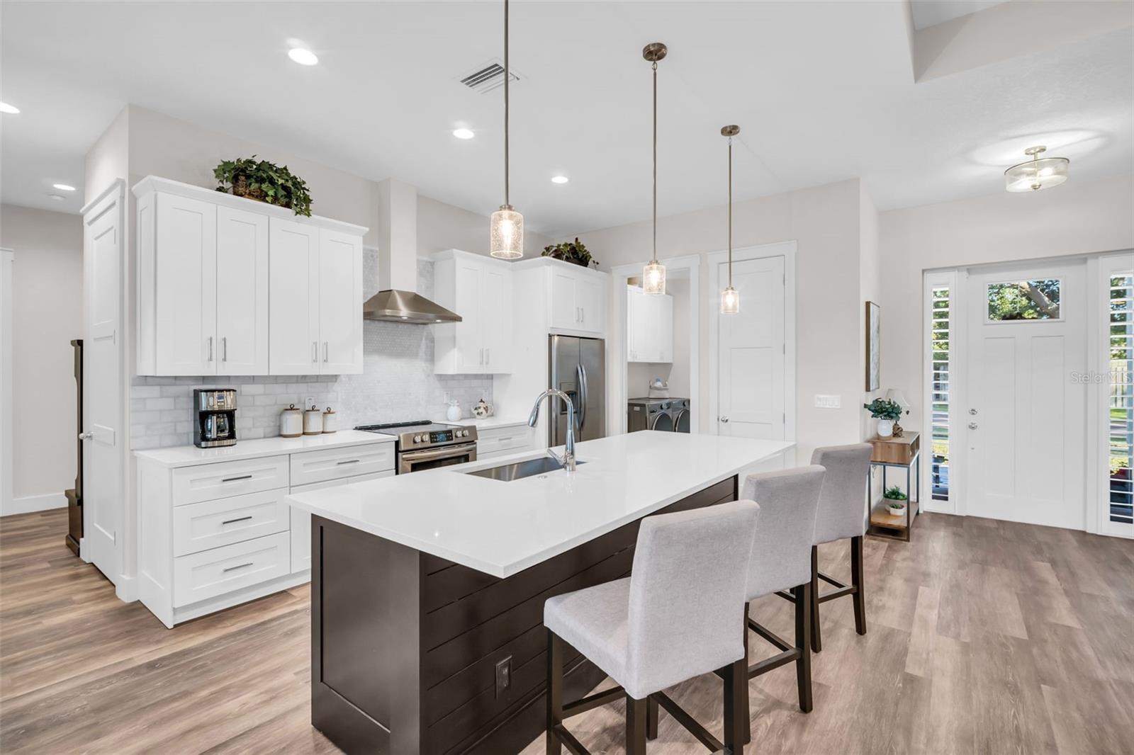 Under contract-accepting backup offers. Built in 2020, this beautifully upgraded 3-bedroom, 2.5-bath home offers 2,093 square feet of thoughtfully designed living space with a 2-car garage, located in the heart of Seminole. From the moment you arrive, you'll appreciate the expanded paver brick driveway and curb appeal that set the tone for what's inside. Step into a bright, open interior featuring soaring 10-foot ceilings, hurricane-impact windows and entrance door, plantation shutters, and a spacious layout designed for both everyday living and entertaining. The main living area is anchored by a custom-built entertainment wall with a large, mounted TV and a striking oversized windmill ceiling fan, creating a stylish and comfortable gathering space. The designer kitchen showcases shaker-style cabinetry, stainless steel appliances, quartz countertops with extended bar seating, and a quiet KitchenAid dishwasher (2025). Built-out closets throughout the home maximize storage and functionality, while retractable screens and paver brick outdoor space extend your living area to the outdoors. Additional highlights include a Whirlpool water softener (2025), LG washer and dryer, newer water heater (2021), newer A/C (2021), and impressively low utility costs. The home blends modern construction with thoughtful upgrades, offering efficiency, comfort, and peace of mind. Ideally located near beaches, shopping, dining, and top Seminole amenities, this move-in-ready home delivers modern Florida living at its finest.