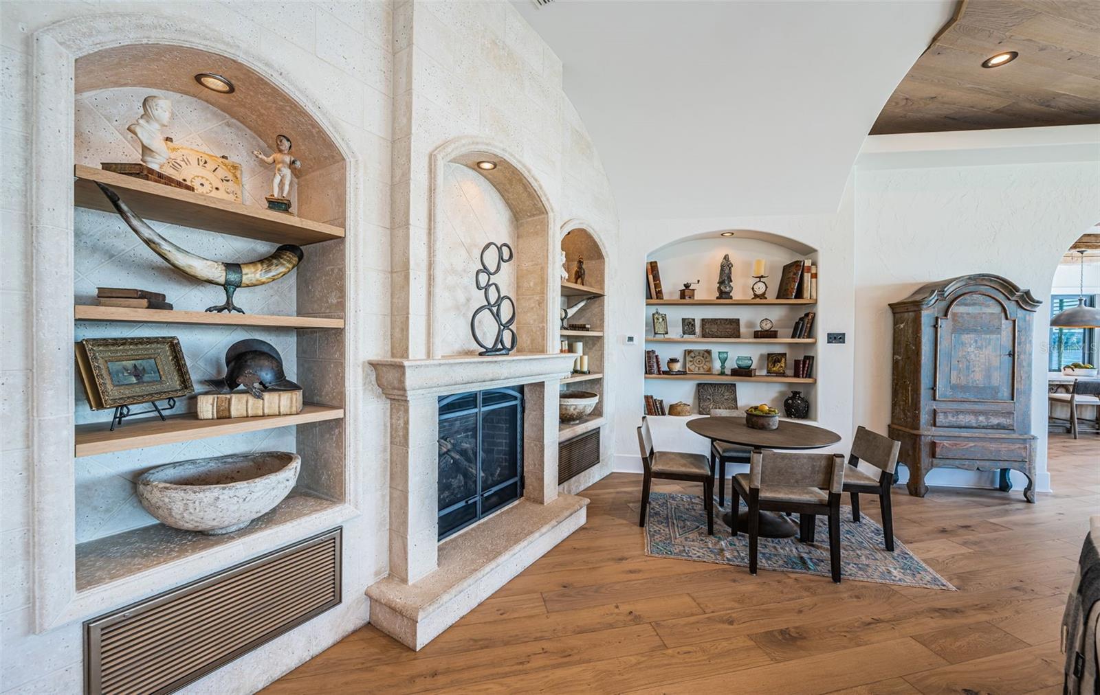 - Built-in Features, Cathedral Ceiling(s), Ceiling Fans(s), Chair Rail, Crown Molding, Dry Bar, Eat-in Kitchen, High Ceilings, Kitchen/Family Room Combo, Living Room/Dining Room Combo, Open Floorplan, Primary Bedroom Main Floor, Solid Surface Counters, Solid Wood Cabinets, Split Bedroom, Stone Counters, Thermostat, Tray Ceiling(s), Vaulted Ceiling(s), Walk-In Closet(s), Wet Bar, Window Treatments