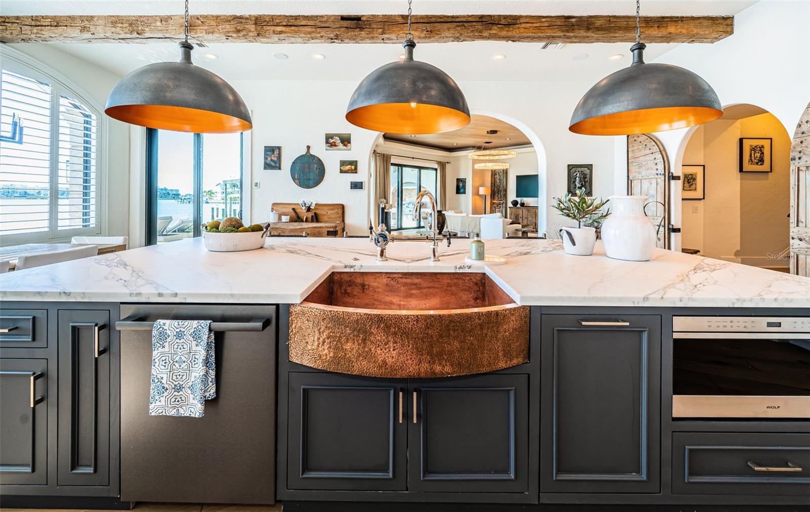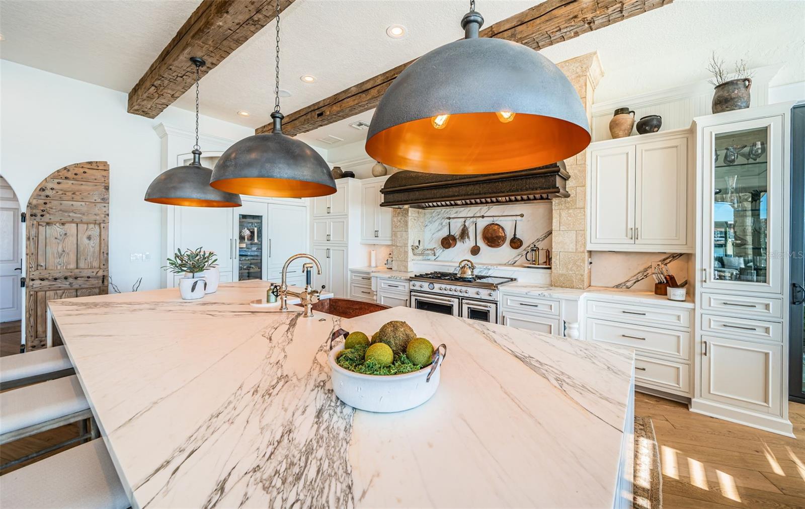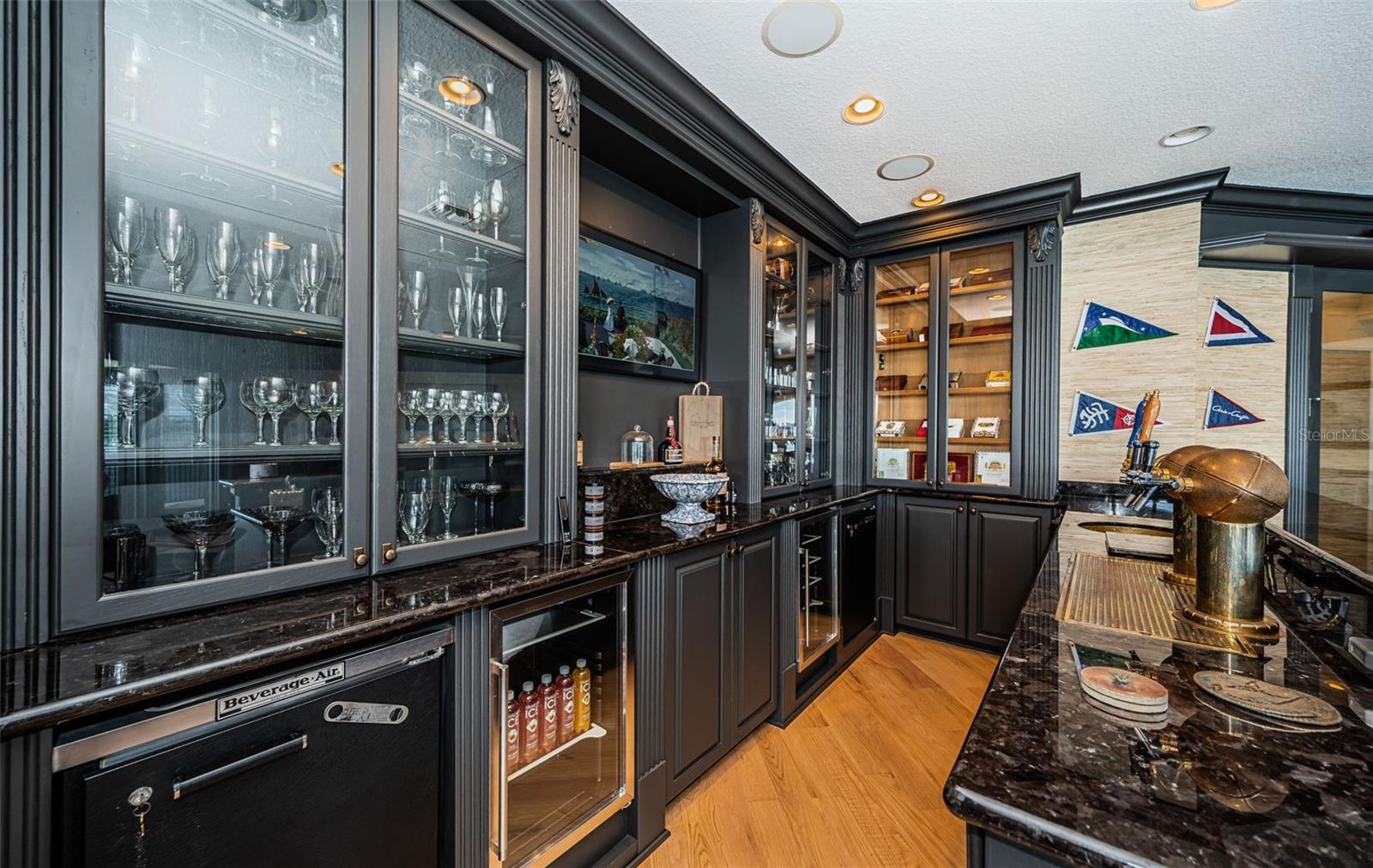 COASTAL CONTEMPORARY LUXURY WITH A UNIQUE TUSCAN APPEAL! Step into a waterfront estate that will raise your senses of sight, sound and touch! Originally built in 1961 but has been rebuilt in 2006. Exquisitely detailed exterior finishes introduce a stately 12ft-high covered entry with splendid arched steel double doors. Inside, discover a spectacular, intricately woven floorplan with dramatic arches, brilliant custom wall finishes, elegant wood flooring, lovely alcoves, superb built-ins and extraordinary woodwork. The expansive great room with its substantial 11ft-high wood ceilings, radiant lighting and cast stone fireplace wall with built-ins, is defined by an amazing wall of 9ft tall sliding glass doors that deliver unforgettable views of the waterfront. The sumptuous open-concept gourmet designer kitchen is a feast of culinary form and function – with aged wood-beamed ceilings, thick Italian marble surfaces, coastal-white raised-panel cabinetry, Wolf/Miele appliances, Bertazzoni gas cooking center, a 3-unit refrigeration wall, full-height wine chiller, huge hammered-copper exhaust, inspired designer lighting, and an incredible island bar with copper farmhouse sink and Italian Marble Waterfall counters (built over a sturdy ancient altar!). You’ll appreciate the fine butler’s pantry and adjacent full-size luxury pool bath. The generous waterfront dining area features two access point to the pool deck. Overlooking the water and opening to a sizable covered deck, the large owner’s suite with dedicated seating area is a welcoming way to begin and end your day. The owner’s bath enjoys beautiful Italian marble surfaces, dual vanities, a dedicated morning bar, an eye-catching all-marble rainshower with digital controls, and a fabulous walk-in closet with built-ins and wonderful center dresser. Upstairs you’ll find an astonishing custom game room with luxurious professional bar; boasting posh wainscoting, rich granite surfaces, custom cabinetry, extensive beverage chilling/refrigeration and surround sound, this will be everyone’s favorite stop to watch the ball game. Step out to the 42ft-wide, 400sqft+ covered balcony and enjoy commanding, panoramic views of the waterfront. Offering an alternative experience, the waterfront fitness room and casual sitting area is a great place to exercise and relax. Two spacious bedrooms share a 20ft-wide waterfront balcony with terrific open water views. A 3rd bedroom is joined to an inviting common sitting area, while the resplendent 4th bedroom provides a Juliette balcony. All bathrooms are lavish in their appointments. Out back you’ll be captivated by a dazzling waterfront setting – a towering 13ft-high 400sqft covered deck with roomy lounging/dining areas and built-in gas cooking center, transitions to a striking Pebbletec pool/spa and your sweeping open water vistas. Impressive travertine paver walkways run the width of the home and are complemented by lush, private subtropical landscaping. You’ll love the dedicated covered waterfront dining area – ideal for large gatherings. The exceptional composite dock features a true rarity, two permanently covered boat lifts with walkway access to both sides of both lifts! Lighting automation, whole house audio, solar electric power and battery backup, and so much more. A magnificent home and tremendous value for all it has to offer. Dimension are estimates, buyer to verify.