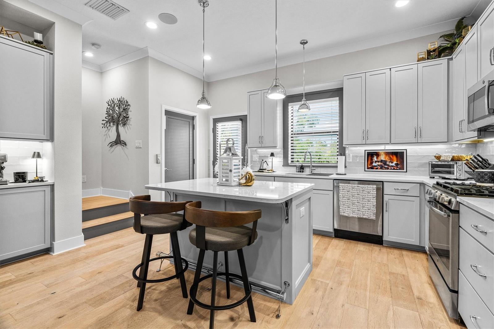 Under contract-accepting backup offers. Welcome to GRAMERCY! This fully furnished townhome in the heart of Downtown Dunedin offers a seamless blend of modern design and relaxed Florida elegance, just moments from downtown shops, dining, and waterfront charm. This sophisticated three-level residence includes 3 bedrooms, 3.5 baths, and over 2,000+ square feet of thoughtfully curated living space. Custom finishes, refined designer details, and a bright, airy aesthetic create an atmosphere that is both stylish and inviting. THE GROUND LEVEL features a flexible office or private guest suite with a full bath—perfect for remote work, hosting friends, or weekend visitors. This flexible space easily adapts to your lifestyle whether that’s a home office, workout zone, or creative studio. A private elevator and two-car garage elevate everyday convenience, such as whisking groceries from the garage straight up to the kitchen. The garage is upgraded with a durable epoxy floor and enhanced with a smart app for easy garage door opening. A built-in pest defense “in-wall system” adds discreet, whole-home protection. The entire home is designed, wired, and ready for connection to modern living features including audio, internet, security, surveillance, and climate control—keeping you connected and comfortable at every level. THE SECOND LEVEL is where life happens. The open concept living space flows effortlessly, featuring engineered oak wood flooring, custom craftsmanship throughout, and a layout designed for entertaining and connection. The gourmet kitchen shines with quartz countertops, premium wood cabinetry, a walk-in pantry, and plenty of space to gather. Step out onto the private balcony to enjoy your dinner outdoors, relax in the Florida sunshine, feel the coastal breeze, and enjoy the vibrant Dunedin energy. THE THIRD LEVEL hosts your laundry room and two expansive primary suites, each offering a peaceful retreat with beautifully updated en-suite baths, walk-in closets, and thoughtfully creative storage. Living at Gramercy Court means being part of one of Dunedin’s most vibrant and welcoming communities. In just a few steps, you’re in the heart of Downtown Dunedin, known for its weekly markets, lively festivals, art walks, parades, live music, community gatherings, award-winning restaurants and breweries, waterfront parks, marina, and the Pinellas Trail. This golf-cart-friendly neighborhood also offers a charming courtyard with inviting seating and tranquil water features, giving you a peaceful place to unwind at the start or end of your day. This home is offered FURNISHED and is truly TURNKEY ready … including a custom “Owners Guidebook” displaying warranties, appliances and furnishings. WELCOME HOME!! Enjoy a stroll downtown, meet your neighbors out for dinner, catch a Blue Jays Game and live the Dunedin lifestyle!