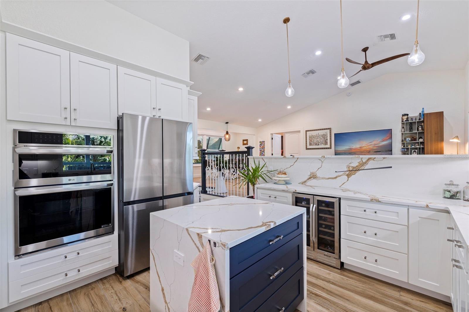 Step into a stunningly transformed, elevated four-bedroom plus office Tierra Verde pool home with additional bonus space, where every detail has been luxuriously reimagined to create a breathtaking island retreat. Meticulously updated throughout—including roof, HVAC systems, flooring, kitchen, bathrooms, ceilings, walls, doors, windows, and more—this residence has truly been touched in every way. It offers the rare opportunity to move into a home that feels entirely new, where thoughtful design, quality craftsmanship, and effortless island living come together seamlessly. Upon entry, the main living space unfolds with soaring ceilings, expansive impact windows, and sliding glass doors that frame the private backyard pool oasis. Contemporary tile flooring provides warmth, continuity, and an elevated sense of style throughout the home. The seamless flow between the living room, dining area, and kitchen creates a beautifully balanced environment—ideal for both everyday living and refined entertaining. With the sliders open, indoor and outdoor spaces connect effortlessly, allowing guests to enjoy the oversized patio, pool, and outdoor living areas as one cohesive retreat. The kitchen is a true showpiece—state-of-the-art, beautifully designed, and highly functional. Solid wood cabinetry, quartz countertops with a matching backsplash, custom hardware, and premium appliances create a refined yet welcoming space. Highlights include a double oven, electric cooktop with a striking statement range hood, beverage refrigerator, and a generously sized center island offering additional storage. A raised breakfast bar provides convenient seating, making the kitchen perfect for gathering and entertaining. The primary suite is a private sanctuary, featuring a spacious bedroom, walk-in closet, and a stunning, resort-inspired bathroom. The spa-like bath offers an oversized walk-in shower, freestanding soaking tub, dual-sink vanity, and elegant fixtures that complement the striking countertops and shower walls, creating a tranquil retreat. An adjacent bonus room—ideal for a home office, nursery, or flexible living space—offers separate access to the outdoor deck, adding both convenience and versatility. On the opposite side of the home, three additional guest bedrooms are thoughtfully positioned alongside a beautifully updated full bathroom and a separate powder room for guests. A comfortable staircase leads to the lower level, where a three-car garage with generous storage opens to an oversized bonus space—perfect for guests, extended family, or a private retreat. Outdoor living is equally impressive. The heated pool and spa have been fully updated and are surrounded by lush, thoughtfully designed landscaping, creating a private and inviting setting. The fully fenced backyard offers ample space for entertaining, relaxation, pets, or future enhancements such as a fire pit. Additional features include an electric vehicle charger, energy-efficient water heater, solar panels, epoxy garage floors, abundant storage, Bahama shutters, and exceptional curb appeal. The coastal blue exterior is complemented by vibrant, low-maintenance landscaping filled with rich color and greenery, making the home as beautiful on the outside as it is within. Ideally positioned, this home is just 15 mins from vibrant downtown St. Pete and minutes to local restaurants, services, bike trails, and Fort De Soto Park.