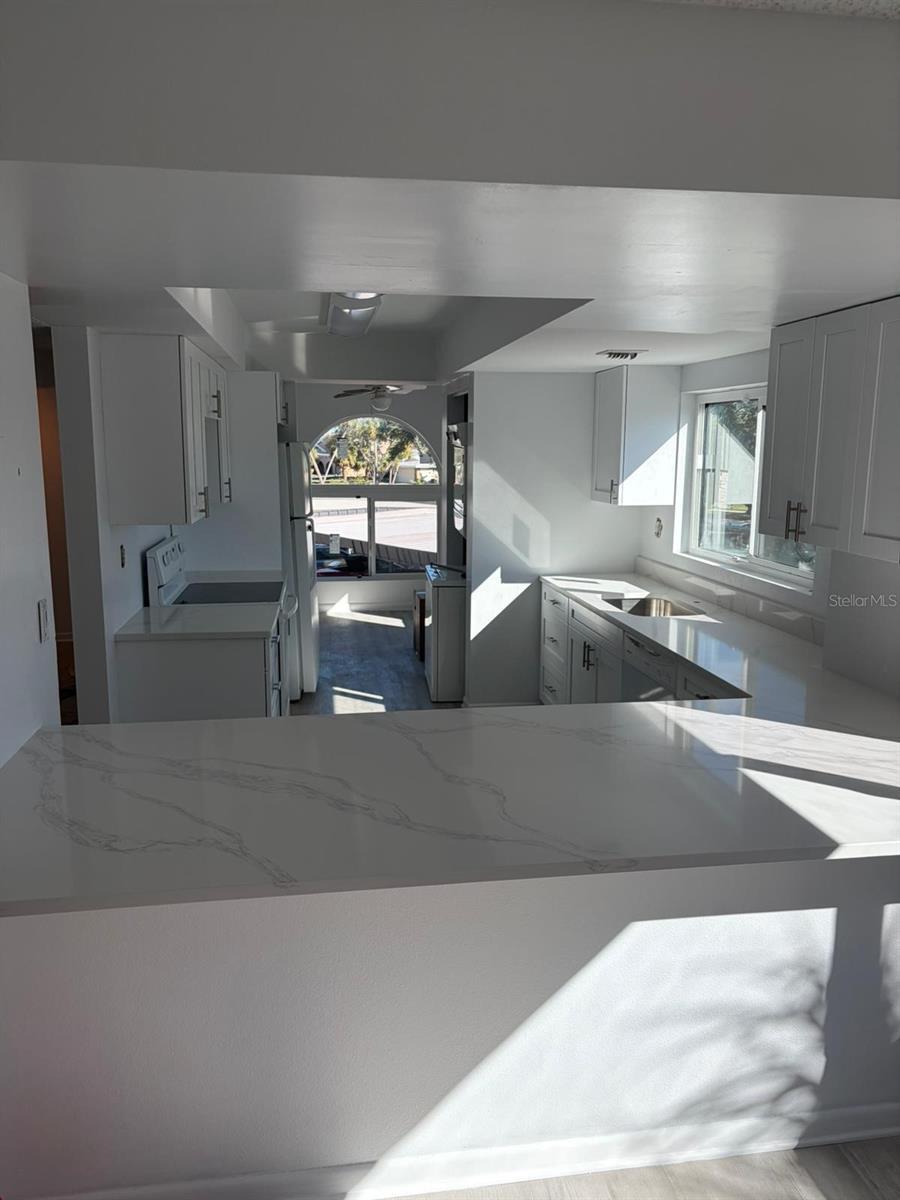 One or more photo(s) has been virtually staged. SPECTACULAR 270 Degree WATER VIEW - END UNIT that offers peaceful views of water. Ready for occupancy beginning Februarywhen renovation will be complete. Condo has ALL NEW HURRICANE RATED WINDOWS AND SLIDERS. Enjoy SUNSETS & SUNRISES from your covered balcony. Be the first to enjoy the updates, BRAND NEW KITCHEN, of this open floor plan that offers great space -Livingroom/diningroom combo and a separate room off the kitchen for dining or use as a den/office area. Luxury Vinyl plank floors throughout for easy maintenance and comfort. Split bedroom plan. Primary bedroom has intercoastal views with NEW SLIDERS to the balcony. Includes ensuite bathroom with shower and commode; separate sink area. Walk in closet. 2nd Bedroom is spacious and has access to the main bathroom. Washer and dryer closet inside the unit. Ceiling fans throughout. This unit offers a 270-degree view!! Has assigned Covered parking #, heated pool, tiki hut and BBQ grills for your everyday enjoyment. Min lease period is 7 months. First month & security deposit and renter's insurance policy required. Have a preview of this for your next rental. updated pictures showing open plan with newer kitchen, are now provided of and new windows pics and doors to follow once completed in January. Great opportunity for waterfront living with many benefits of Island Estates; restaurants, Publix and more, only 1 mile from Clearwater Beach with quick access to the mainland.