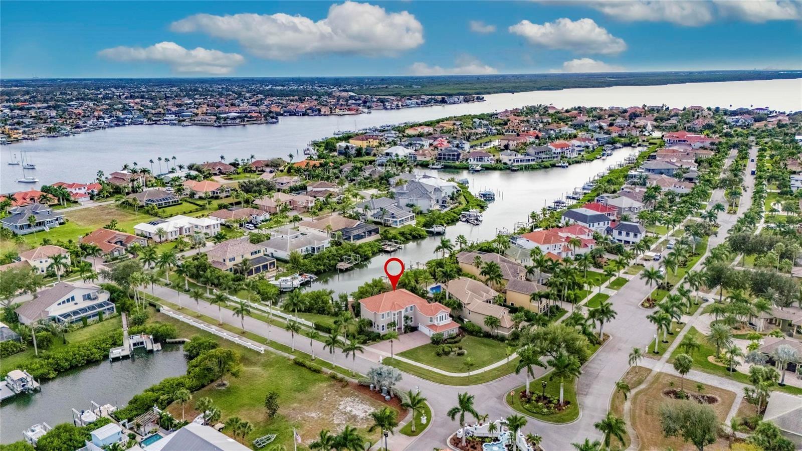 6317 Marbella Blvd, Apollo Beach, FL is a 5-bedroom, 4-bath, 4,013 square foot pool home situated on a private corner lot in the gated waterfront community of Andalucia. Built in 2004, this custom home has been thoughtfully updated, including a new tile roof in 2025, fresh interior paint, several updated windows, and updated flooring, making it move-in ready. Inside, the home features, flexible spaces, soaring ceilings, crown molding, and a gas double-sided fireplace shared between the living and family rooms with an additional glass fireplace in the primary bedroom. The kitchen has maple cabinetry, granite countertops, stainless steel gas appliances, and a pantry, with an open layout and easy pass through access to the large covered lanai, well suited for everyday living and entertaining. A downstairs guest suite is conveniently located near the pool area, providing a comfortable setup for visitors or multigenerational living. Upstairs, an oversized bonus loft room has a dry bar and large French doors that open to a balcony with bayfront views Sunset. The primary suite features a private balcony, sitting area, triple-sided fireplace, an oversized walk-in spa shower, and a Jacuzzi tub positioned to capture views toward Tampa Bay. Outdoor living includes a screened in and heated pool and spa, a covered lanai, and an outdoor summer kitchen. The property also features a deepwater dock with a 20,000-lb boat lift, providing quick access to open water on Tampa Bay. Additional features include a private well for irrigation, propane tank for gas appliances and a large three-car garage with extra storage space. Andalucia is a private, gated waterfront community with a bayfront clubhouse, community pool, tennis courts, pickball, private marina and sunset jetty access. This home provides space, function, and direct boating access in a quiet, upscale neighborhood with convenience to Tampa, Sarasota, and St. Petersburg by vehicle or boat.