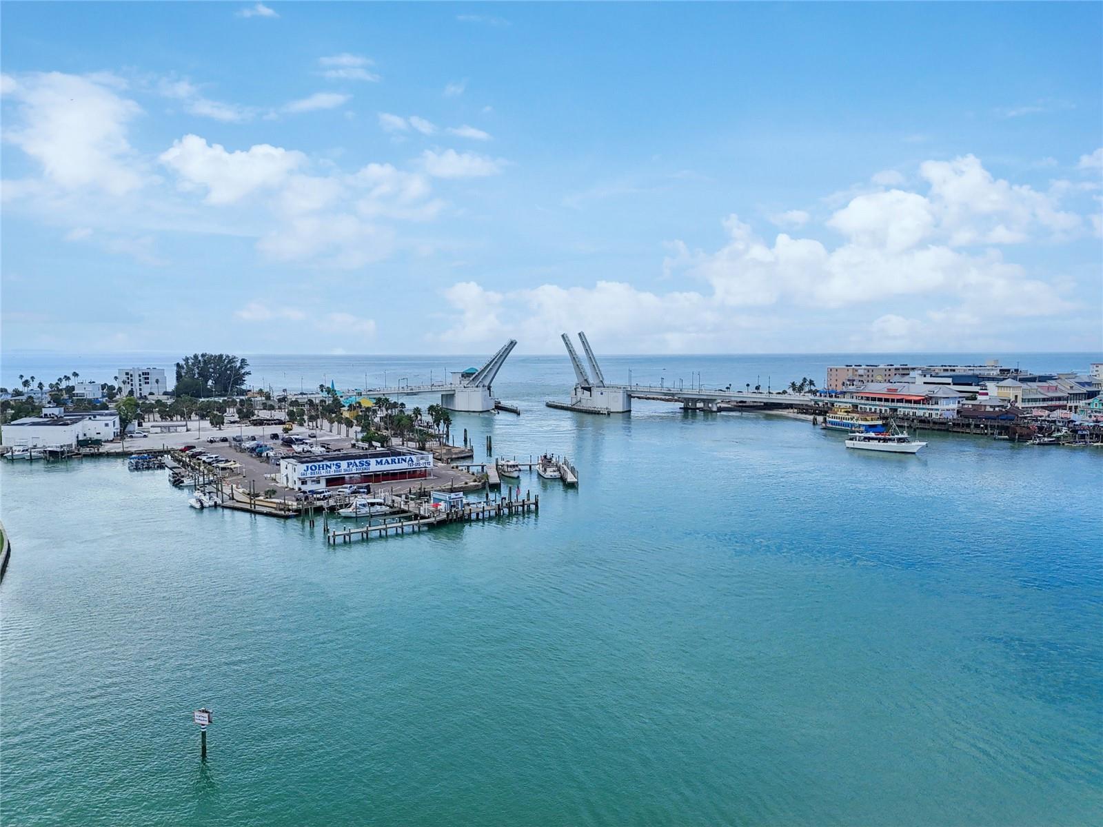 Waterfront price improvement! This beautiful condo with stunning water views is now offered at $699,000. Welcome to a rare, renovated corner-unit condo offering breathtaking 180 degree open water views of Boca Ciega Bay and Iconic John's Pass - beautifully illuminated at night and alive with dolphins just beyond your balconies. One of only 28 corner units in this community, this residence was thoughtfully redesigned to create an expansive, open-concept living area. Originally a three-bedroom floor plan, it now lives a spacious two-bedroom, two-and-a-half bath retreat, maximizing water views, natural light, and indoor-outdoor living.Spanning approximately 1,470 square feet, this stunning condo features luxury vinyl plank flooring throughout, crown molding, an updated kitchen with quartz countertops, stainless steel appliances, and plenty of cabinetry. Custom built-in wall unit anchors the living area and includes an electric fireplace that provides both ambience and heat. Enjoy three private balconies-one off the kitchen with a laundry closet including a full-size washer/dryer, one off the main living area, and one off the primary suite, each offering captivating water views and gentle coastal breezes. The Primary bedroom is a true sanctuary with balcony access and serene bay vistas. The unit is equipped with hurricane shutters (2023), AC (2024), water heater (2018), The unit comes with under garage parking space and private storage unit. The well-maintained, gated community is fully funded, with new roofs completed in 2023, and offers exceptional resort-style lifestyle. Amenities include a heated pool and spa, sauna, fitness center, tennis and pickleball courts, shuffleboard, putting green, grilling areas, fishing pier, marina with 40+ boat slips (waitlist available), Kayak storage (waitlist available), billiards room, social room, craft room, and library. HOA fees include everything except electricity. Perfectly situated just steps from the beaches, dining, shops, and entertainment. Within 15 minutes of downtown St. Petersburg and approximately 40 minutes to Tampa International Airport. This hidden gem delivers luxury, convenience, and an unparalleled waterfront lifestyle.