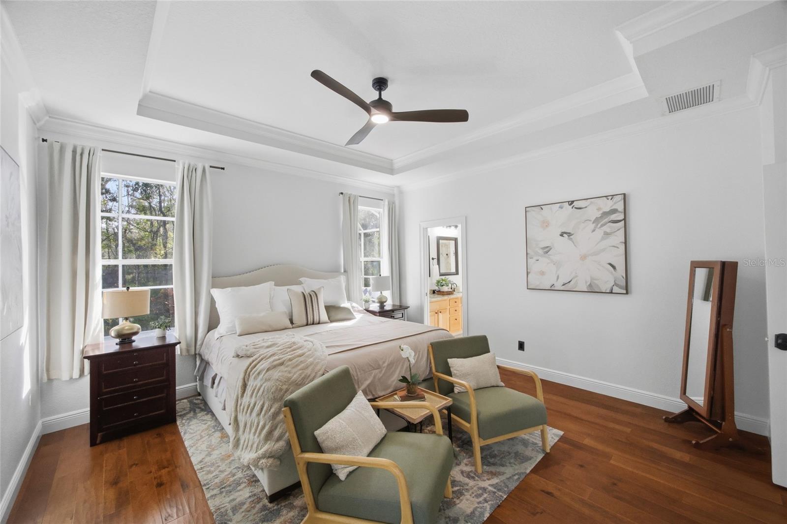 - Ceiling Fans(s), Crown Molding, High Ceilings, Open Floorplan, Primary Bedroom Main Floor, Window Treatments