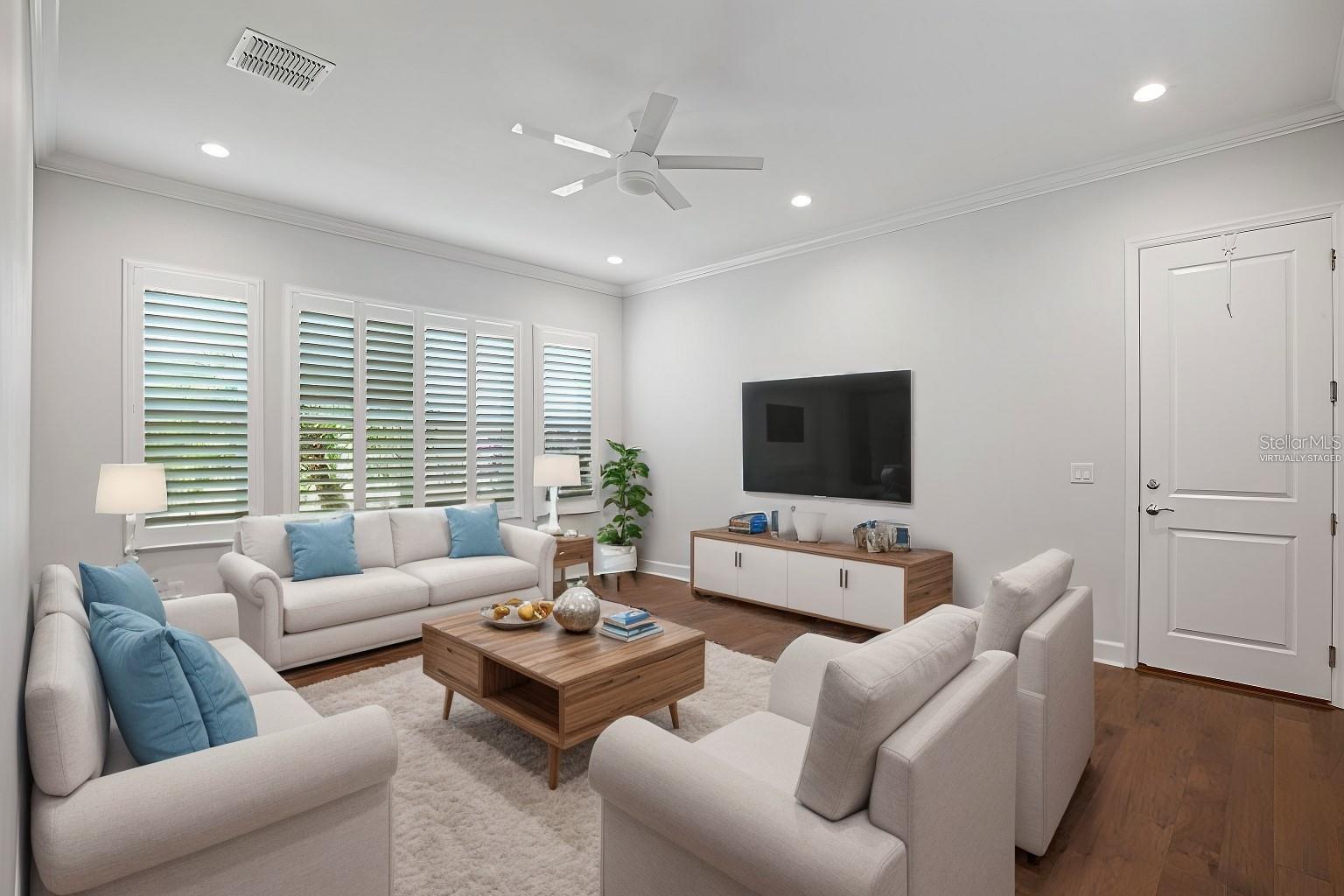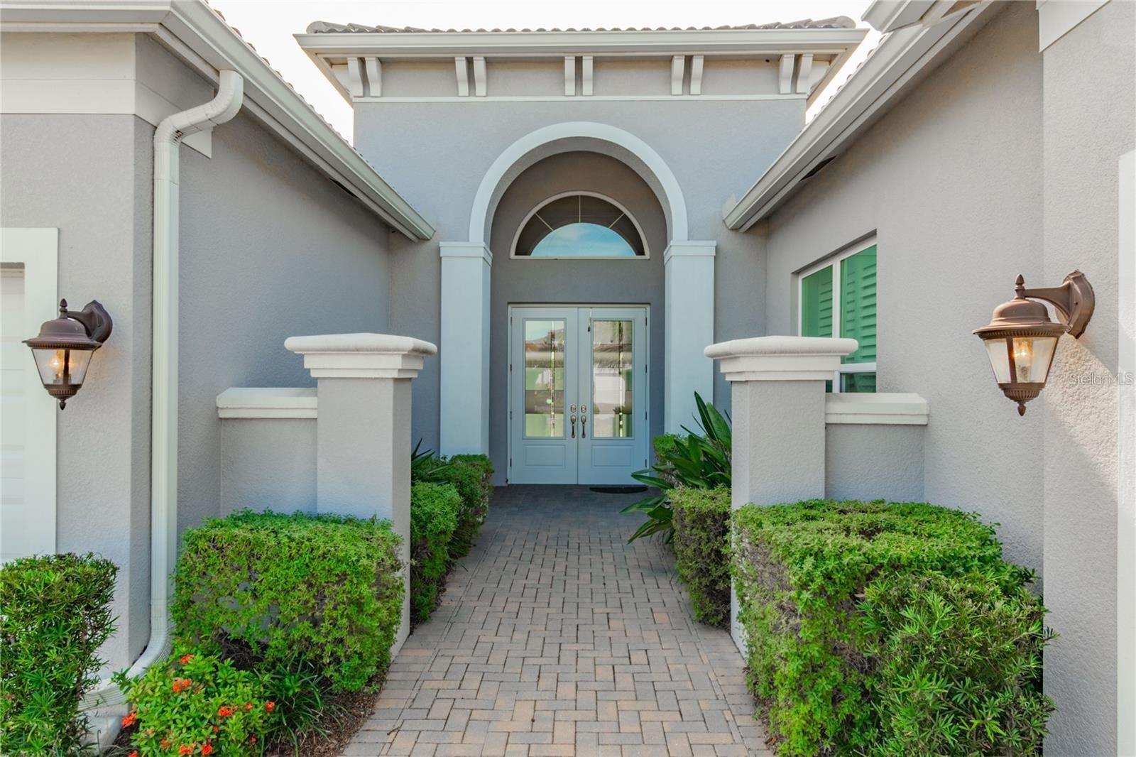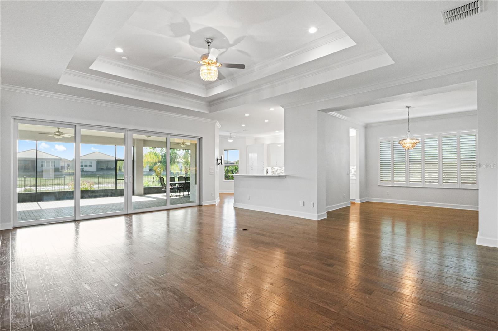One or more photo(s) has been virtually staged. This luxurious Carlyle model home in the prestigious Valencia Del Sol 55+ resort-style community offers an exceptional blend of comfort, elegance, and thoughtful design. Spanning 3,072 square feet, the residence features three spacious bedrooms, a generous club room, three-and-a-half bathrooms, and a three-car garage, all ideally situated within walking distance of the community’s impressive 25,000-square-foot clubhouse and amenities. Upon entering through decorative double impact glass doors, you are welcomed by dramatic 16-foot coffered ceilings, a designer chandelier, crown molding, and engineered hardwood flooring throughout the main living areas. The open-concept layout seamlessly connects the great room with the gourmet kitchen, casual dining, and formal dining spaces, creating an inviting setting for both everyday living and entertaining. The great room is highlighted by a double-coffered ceiling and expansive 8-foot impact glass sliders that open to an extended, covered, screened lanai featuring serene water views, ceiling fans, and lighting. Designed into the roofline for maximum indoor-outdoor living, the lanai also includes an outlet for a future spa, making it a truly unique and functional space. The chef-inspired kitchen showcases a large center island, quartz countertops with an 18-inch serving bar, 42-inch high-gloss cabinetry, a designer backsplash, and stainless steel appliances. Adjacent to the kitchen, the formal dining room is ideal for hosting special occasions and is accented by a stunning crystal chandelier. The primary suite serves as a private retreat with a coffered ceiling, two walk-in closets, a sitting bay, and an exterior door that opens to peaceful water views. The spa-like ensuite bathroom features separate vanities with quartz countertops, a walk-in shower with a built-in seat and frameless glass, and a Roman tub with a panel surround. Designed with privacy in mind, the second and third bedrooms each have their own bathrooms, while the spacious club room offers additional living space and direct access to the third-car garage. The well-appointed laundry room includes abundant storage, a utility sink, and a folding counter with cabinetry. Additional highlights include solar panels that keep the average monthly electric bill around $25, impact glass windows and doors, a fenced backyard, tankless gas water heater, central vacuum system, custom window treatments, and an epoxy-finished garage floor. Valencia Del Sol delivers an unparalleled 55+ resort lifestyle with a saltwater pool, state-of-the-art fitness center, tennis and pickleball courts, bocce ball, dog park, arts and crafts studios, live shows, a bistro, and more. A tour of the community clubhouse is a must to fully appreciate the extraordinary amenities and lifestyle this home offers.