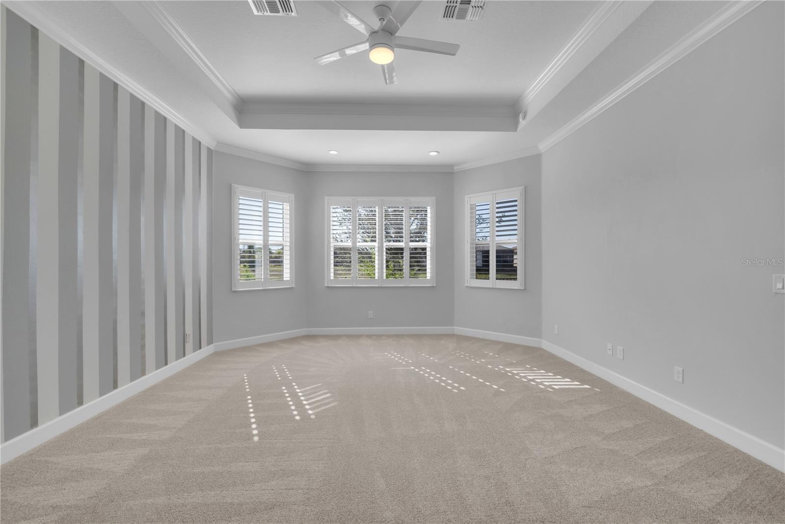 - Ceiling Fans(s), Central Vaccum, Coffered Ceiling(s), Crown Molding, Eat-in Kitchen, High Ceilings, Open Floorplan, Solid Surface Counters, Thermostat, Walk-In Closet(s), Window Treatments