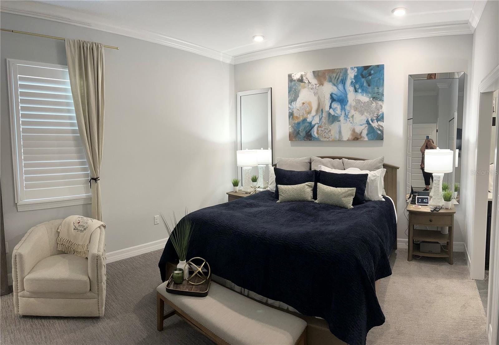 - Ceiling Fans(s), Crown Molding, High Ceilings, Living Room/Dining Room Combo, Open Floorplan, PrimaryBedroom Upstairs, Solid Surface Counters, Window Treatments