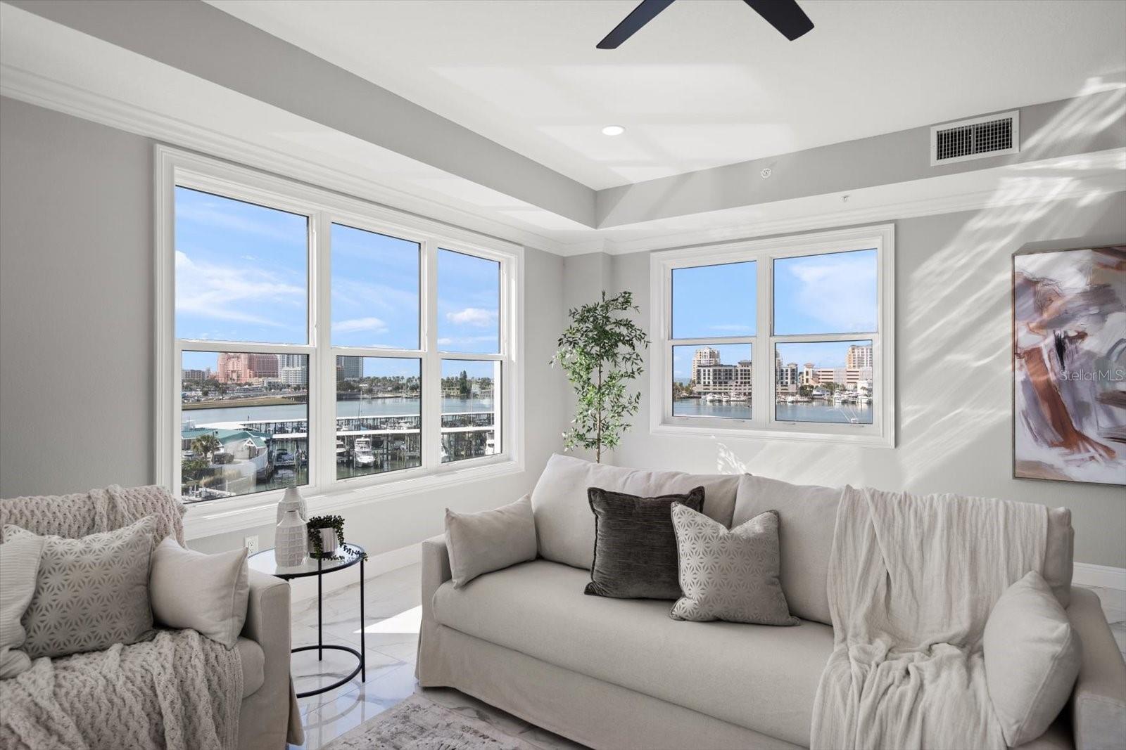 Introducing the penthouse residence at La Brisa Del Mar, the final opportunity to own the top-floor home in this boutique luxury condominium in Clearwater’s highly sought-after Island Estates, where refined coastal modern living meets expansive Intracoastal water views. This move-in-ready, new construction 2,760-square-foot penthouse features an oversized living area and expansive terraces that frame stunning waterfront vistas and create seamless indoor-outdoor living. The open-concept interior showcases elegant tile flooring and a beautifully appointed kitchen with quartzite countertops, an extra-large island, and stainless-steel appliances, anchoring the main living space with modern sophistication. Offering four bedrooms and two baths, the primary suite is a tranquil retreat with a spacious walk-in closet and a spa-inspired ensuite featuring double vanities, a private water closet, and a luxurious walk-in shower with a rain-style shower head. Built on 110 pilings and featuring PGT impact resistant hurricane windows, this quality new construction offers exceptional peace of mind. The penthouse includes two under-building assigned parking spaces. Residents enjoy a waterfront pool and the rare opportunity to purchase a deep-water Intracoastal boat slip. Ideally located just minutes from shopping, dining, and world-famous Clearwater Beach, this last remaining penthouse delivers elevated, private, and polished waterfront living in an intimate setting.