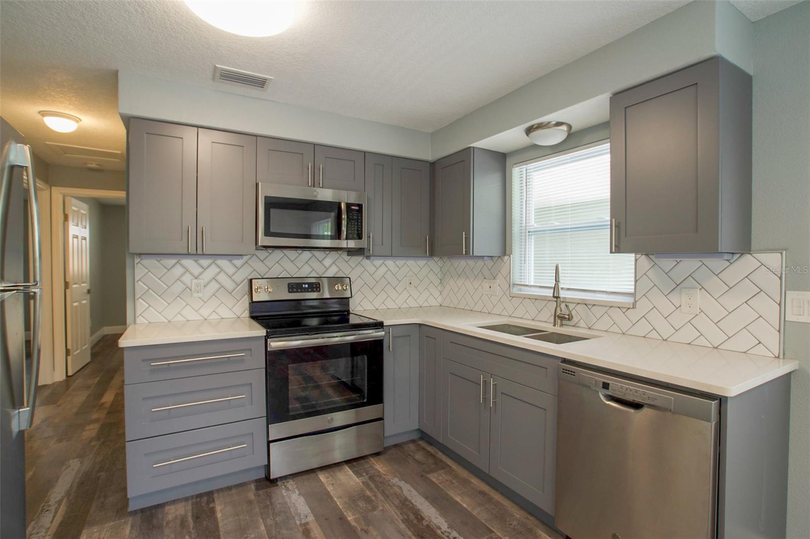 - Ceiling Fans(s), Eat-in Kitchen, Living Room/Dining Room Combo, Solid Surface Counters, Solid Wood Cabinets, Stone Counters, Thermostat