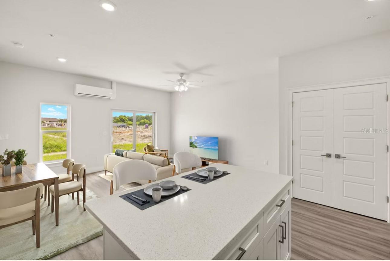 - Ceiling Fans(s), Eat-in Kitchen, High Ceilings, Kitchen/Family Room Combo, Living Room/Dining Room Combo, PrimaryBedroom Upstairs, Solid Surface Counters, Stone Counters, Thermostat, Walk-In Closet(s)