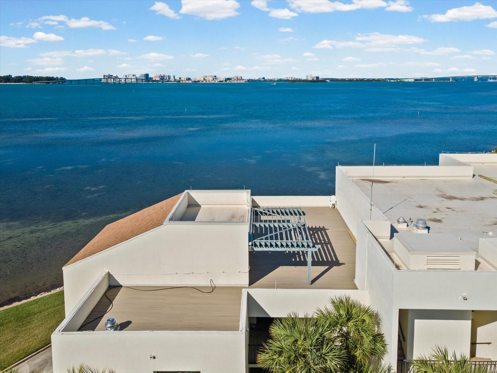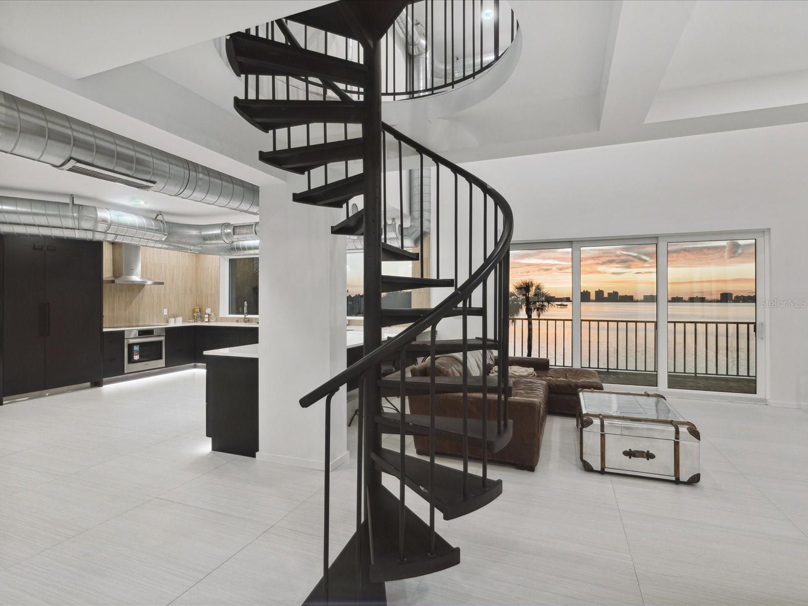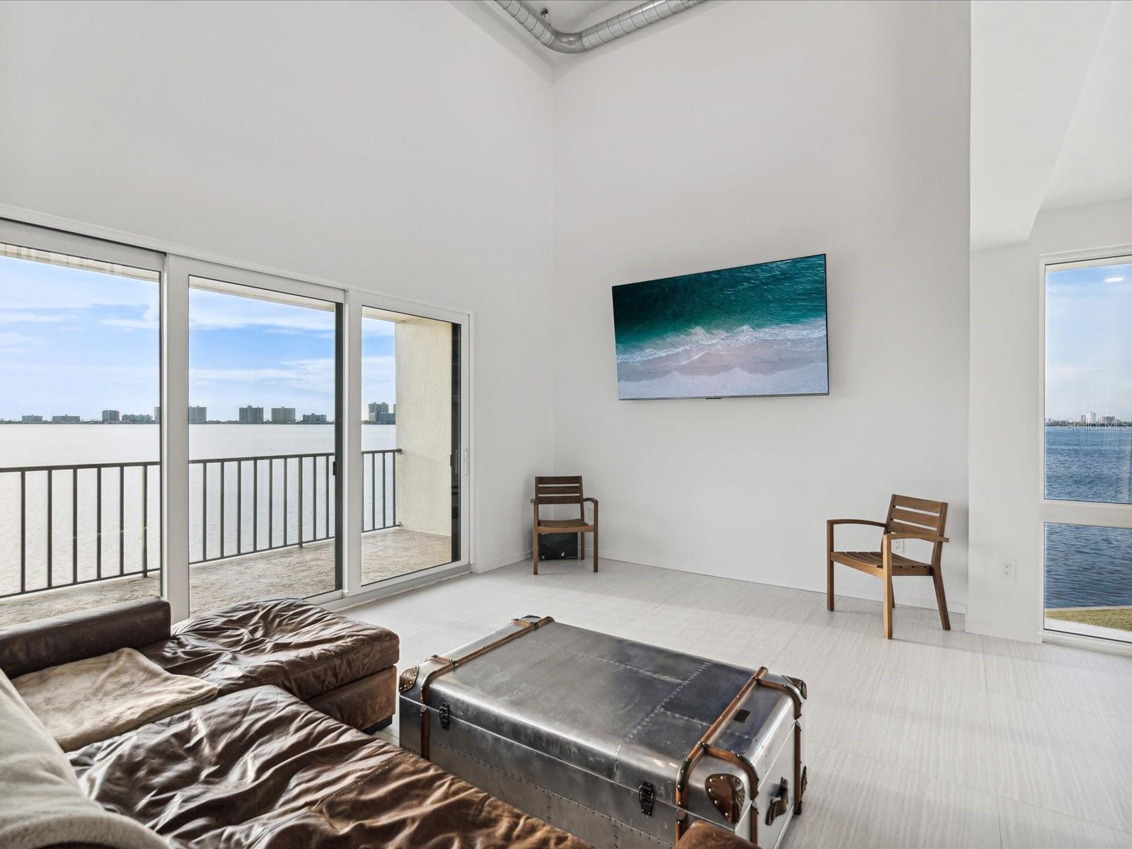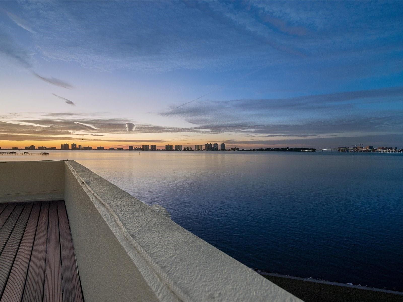 One or more photo(s) has been virtually staged. Welcome to this exceptional top-floor waterfront penthouse in sought-after Belleair, offering breathtaking 180-degree panoramic views of the Intracoastal Waterway and unforgettable sunsets from nearly every room. This fully renovated corner residence features 2 bedrooms, 2 bathrooms, a spacious loft, and an expansive private rooftop deck, creating a rare blend of luxury, design, and lifestyle. The open-concept floor plan is framed by hurricane-rated windows and sliders, filling the home with natural light and sweeping water views. Professionally designed interiors showcase exposed ductwork, refined finishes, and a modern coastal aesthetic throughout. The chef’s kitchen is equipped with all-new Bosch appliances, bar seating, and ample storage—perfect for entertaining or everyday living. A full-size washer and dryer add convenience. A striking spiral staircase leads to the versatile loft, ideal as a guest retreat, home office, or bonus living space, complete with a wet bar, beverage refrigerator, and direct access to the private rooftop entertainment deck—an incredible setting for hosting, relaxing, or enjoying the waterfront scenery. Additional highlights include two private balconies, two assigned parking spaces plus ample guest parking, TVs in every room, and smart home features including thermostat and security cameras. The community offers a heated pool and clubhouse, with utilities included except electricity. Ideally located within walking distance to Belleair Country Club, The Belleview Inn, and Morton Plant Hospital, and just minutes from some of America’s most beautiful beaches, this penthouse delivers an unparalleled Florida waterfront lifestyle.