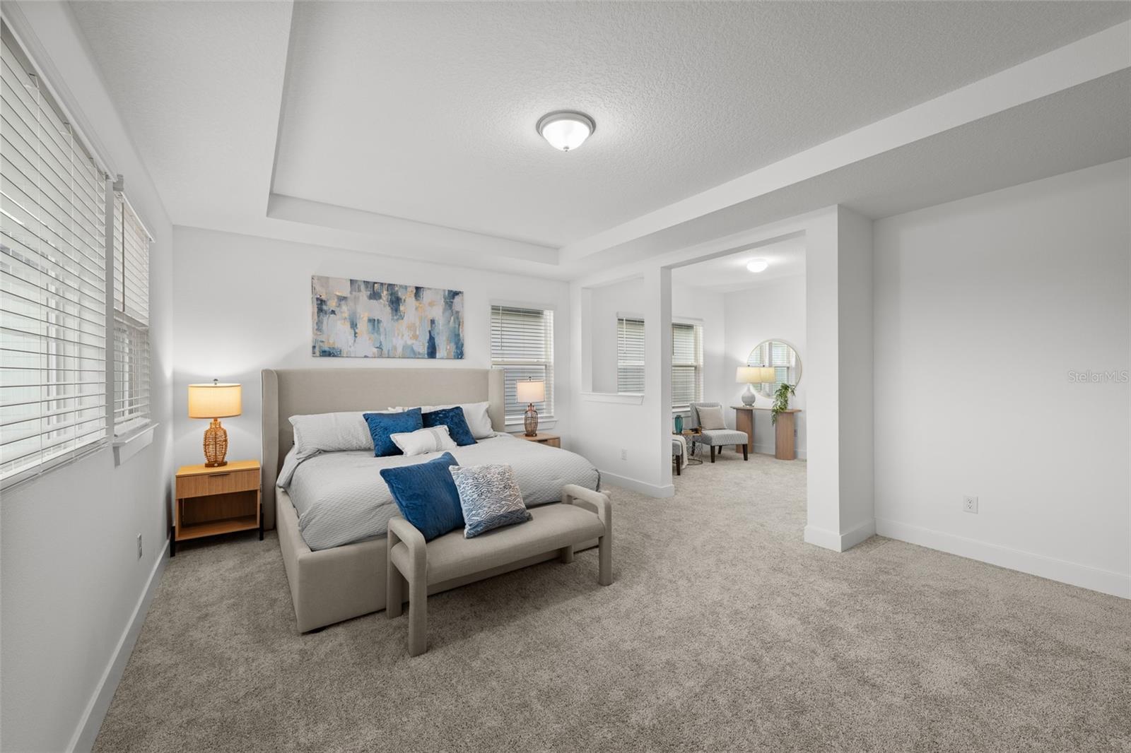 - High Ceilings, Open Floorplan, PrimaryBedroom Upstairs, Stone Counters, Thermostat, Tray Ceiling(s), Walk-In Closet(s), Window Treatments