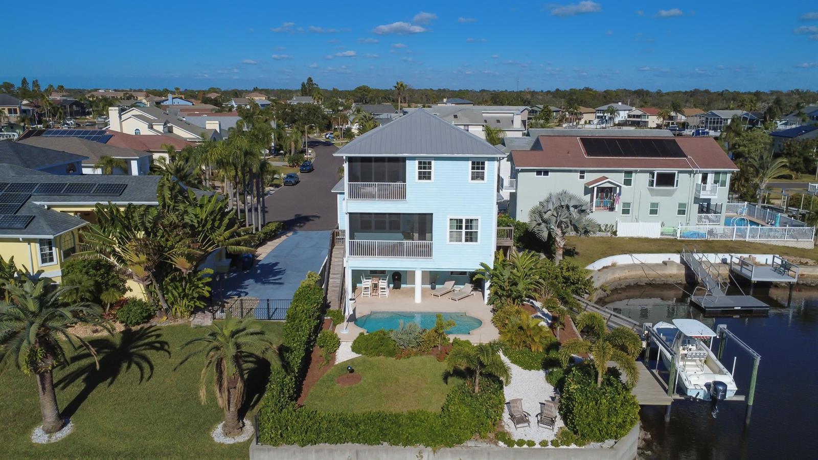 Under contract-accepting backup offers. Welcome to refined waterfront living in the sought-after Gulf Landings community! This beautifully renovated home built in 2016, pairs top-of-the-line finishes with effortless Florida living, offering expansive water views, a private pool and direct boating access, all just minutes from historic downtown New Port Richey. Enjoy over 100 feet of seawall on a large canal basin with stunning views from nearly every window of the conservation area and bird sanctuary. Inside, the home has been thoughtfully reimagined with high-end materials and a clean, modern aesthetic throughout that brings in that coastal charm. The open living spaces flow seamlessly to the outdoors, creating an ideal setting for everyday living and entertaining. You’ll enjoy two screened-in patios that overlook the pool and offer a spot to enjoy your morning coffee or a sunset happy hour. The designer kitchen serves as the heart of the home, featuring premium finishes and a layout made for gathering. The living room and dining room provide even more space for entertaining, and you’ll love all the natural light that pours in from the back of the property. The living space on the second level also provides a generously sized guest room with en-suite bath. Upstairs, you’ll enjoy a loft area for extra space to relax or work from. Sliders take you to the second screened-in patio, and the primary bedroom also has a door connecting to the patio so you can enjoy a leisurely morning. Your primary with en suite is oversized and features a fully updated bath with dual vanity sinks, tiled shower and walk-in closet with custom shelving. The final guest bedroom offers the ideal set up for office or additional bedroom with another full bath and laundry room down the hallway. Outside, you’ll find your private waterfront retreat, where a sparkling pool, spacious patio and private boat dock invite you to enjoy the best of the Gulf Coast lifestyle. Native vegetation and a mixture of hardscaping and green space make this the ideal tropical setting to enjoy outdoor living. The garage provides parking for three cars, plus a ton of storage and even your own cabana room with half bath as the complement to the pool. Two docks provide space for all your waterfront activities, including an aluminum boat lift and kayak launch. In Gulf Landings, residents enjoy access to a community pool, public boat ramp and recreational facilities, enhancing ease and appeal of waterfront living. For a low fee of $200 annually, residents can use the community’s private beach with outdoor grilling and cabanas to rent for a fun day in the sun. You’re only a short boat ride from the preserve at Robert Crown Wilderness and the beach at Robert Rees Memorial Park. With downtown New Port Richey’s dining, shops and events just minutes away as well, this home offers a balance of tranquility and convenience. A rare opportunity to own a newer-built, storm-rated, completely turnkey waterfront home in one of New Port Richey’s desirable communities. Call to schedule your private showing today.