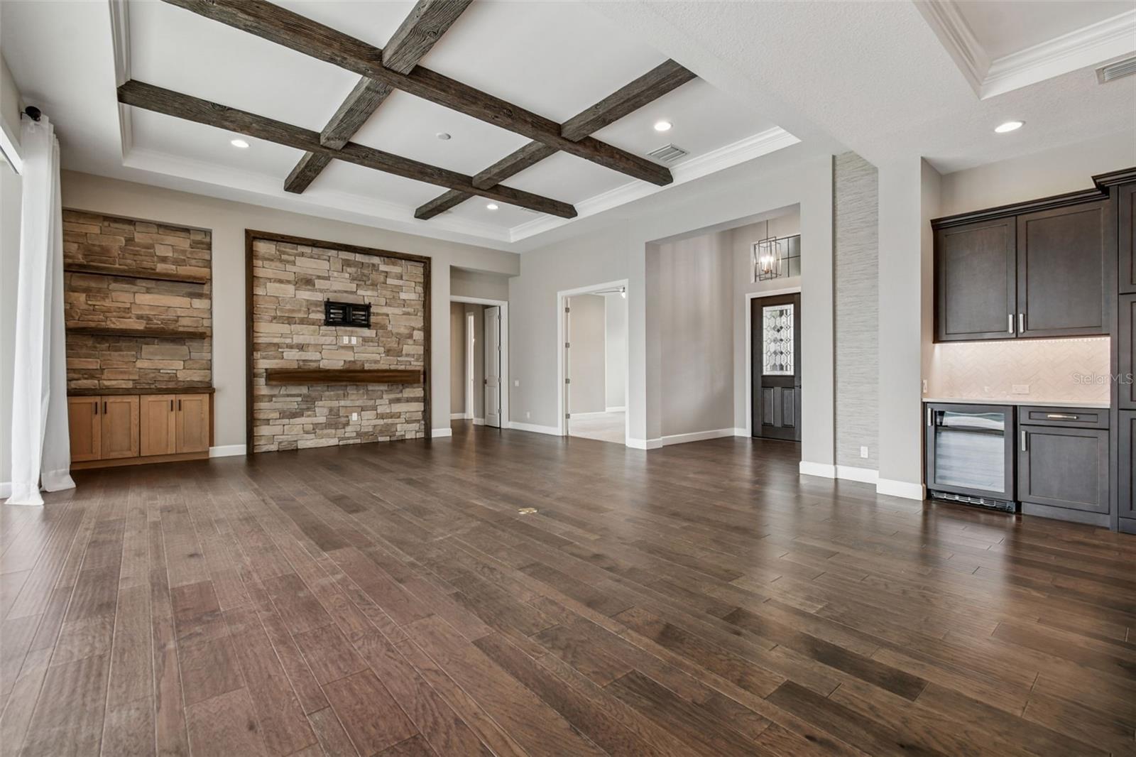 Step into sophistication with this exquisite Arthur Rutenberg-built residence in the highly desirable Mirasol Champions Club gated community! Built in 2019, this newer construction, single story custom home boasts 4 bedrooms, 3 full bathrooms PLUS two oversized bonus rooms for office, playroom or 5th bedroom. All thoughtfully designed for comfortable, modern living. Upon entry, discover a spacious open floorplan with abundant natural light and elevated architectural details. The living room impresses with coffered ceilings, wood beams, and a brick feature, creating an inviting atmosphere for family life and entertaining. The gourmet kitchen features a large center island with Cambria Quartz countertops, tray ceilings, solid wood cabinets, Monogram appliances including a six-burner gas range with a dual oven and griddle, wine refrigerator, built in microwave, and a hidden walk in pantry, perfect for culinary enthusiasts and everyday living alike. The primary suite occupies a private wing of the home, providing a serene retreat with two walk in closets and spa inspired ensuite bath complete with his and her vanities, a luxurious soaking tub, and a sizable walk in shower. On the opposite side of the home you will find three additional bedrooms, a large mud room, and spacious laundry room, adding to the home’s exceptional functionality. Seamlessly blend your indoor and outdoor spaces by opening your pocket sliding glass doors and step outside to your private backyard oasis featuring a refreshing pool and spa, and covered outdoor kitchen, perfect for entertaining, family gatherings, or evening relaxation. The two outdoor sitting areas have new tongue and groove ceilings. Additional upgrades include hardwood floors, plantation shutters in every room, natural gas grill, pool/spa heater and tankless water heater, outside receptacles in soffits for easy install of holiday decorations, and A/C with dehumidifying units to operate more efficiently. Also notable are the double-paned windows, motorized window shades in living and dining room, and three-car garage with paver turnaround driveway. All on an oversized .39-acre corner lot with lush landscaping. Located in one of Trinity’s most sought after communities, residents enjoy Champions Club amenities including a clubhouse, fitness center, tennis and pickleball courts, resort style heated pool, and the convenience of Fox Hallow Golf Club right next door. Close to top rated schools, shopping, dining, major roadways, and the Gulf Coast beaches, this home offers the ideal blend of luxury, lifestyle, and convenience.