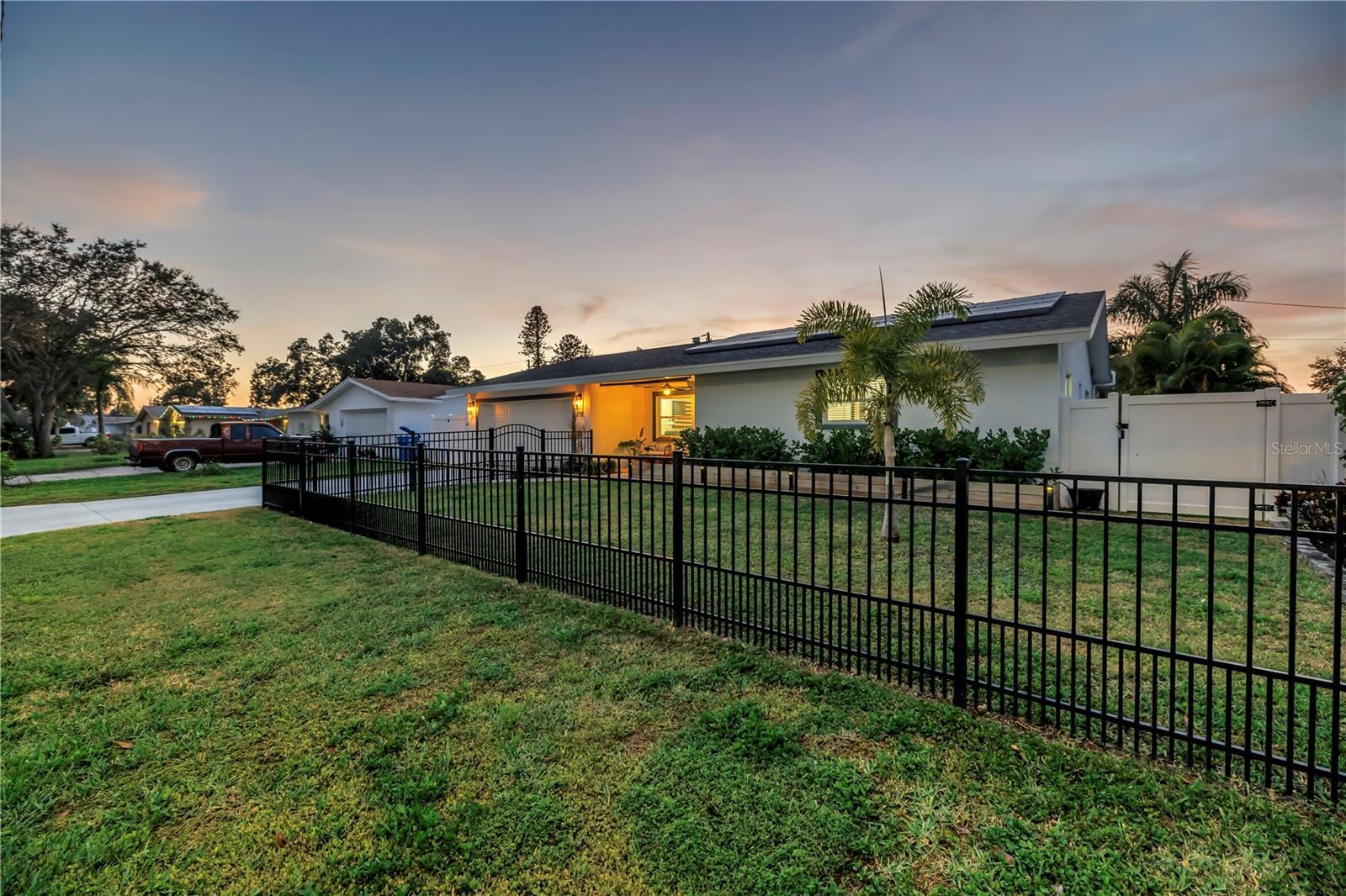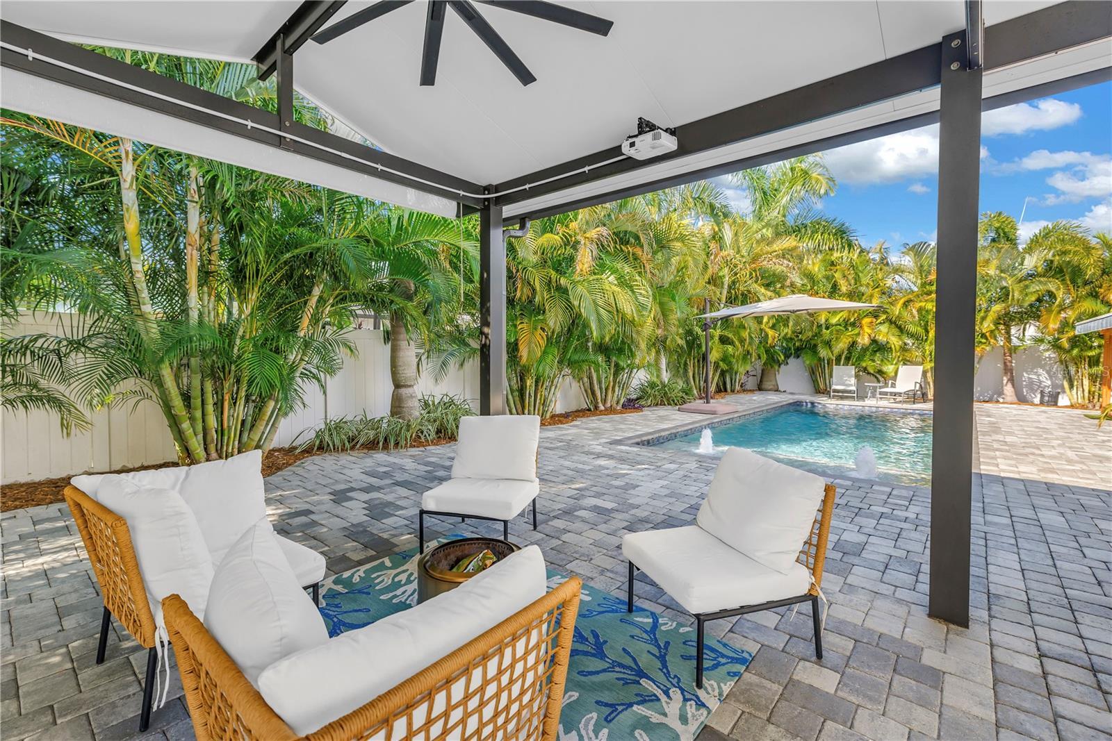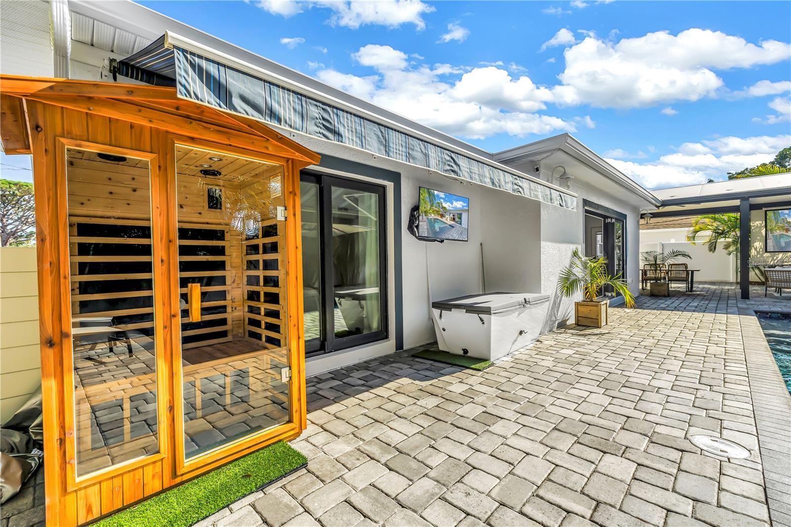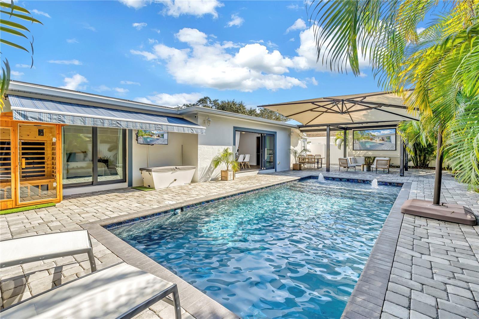 Under contract-accepting backup offers. This home is truly resort living! Located just minutes from vibrant downtown St. Petersburg, this beautifully renovated home has so much to offer! Situated in desirable Flood Zone X, the property was fully renovated between 2019–2020 and is truly move-in ready. The open, split-bedroom floor plan is perfect for entertaining and easy living. The stunning kitchen features Samsung stainless steel appliances, granite countertops, skylights, and a seamless flow into the living and dining areas. A custom dry bar with wine refrigerator adds the perfect touch for hosting. The family/dining room features a sleek electric fireplace and opens through sliding doors to the expansive outdoor patio. Both bathrooms have been thoughtfully updated and include Bluetooth speaker/light features. All four bedrooms are generously sized. This home is packed with high-value upgrades, including a new roof (2019), hurricane-impact windows and doors, a hurricane-rated garage door, natural gas connection, NEST thermostat, solar panels (paid in full) for low electric bills, a workshop, and a well pump for irrigation. The two-car garage includes two EV charging plugs and a freshly painted floor. Step outside to your fully fenced, private backyard oasis with large palm trees that offer full privacy, pavers, and turf ideal for a dog run. The show-stopping solar-heated pool features a sun shelf, deep-water bench, iridescent tile accents, and two water features. Outdoor amenities continue with a pergola equipped with a projector and screen, a retractable awning, and a dedicated sauna and cold plunge, making this the place for perfect for year round entertaining and enjoyment. With its unbeatable location, extensive upgrades, and resort-style amenities, this exceptional home offers the best of Florida living—just unpack and enjoy.