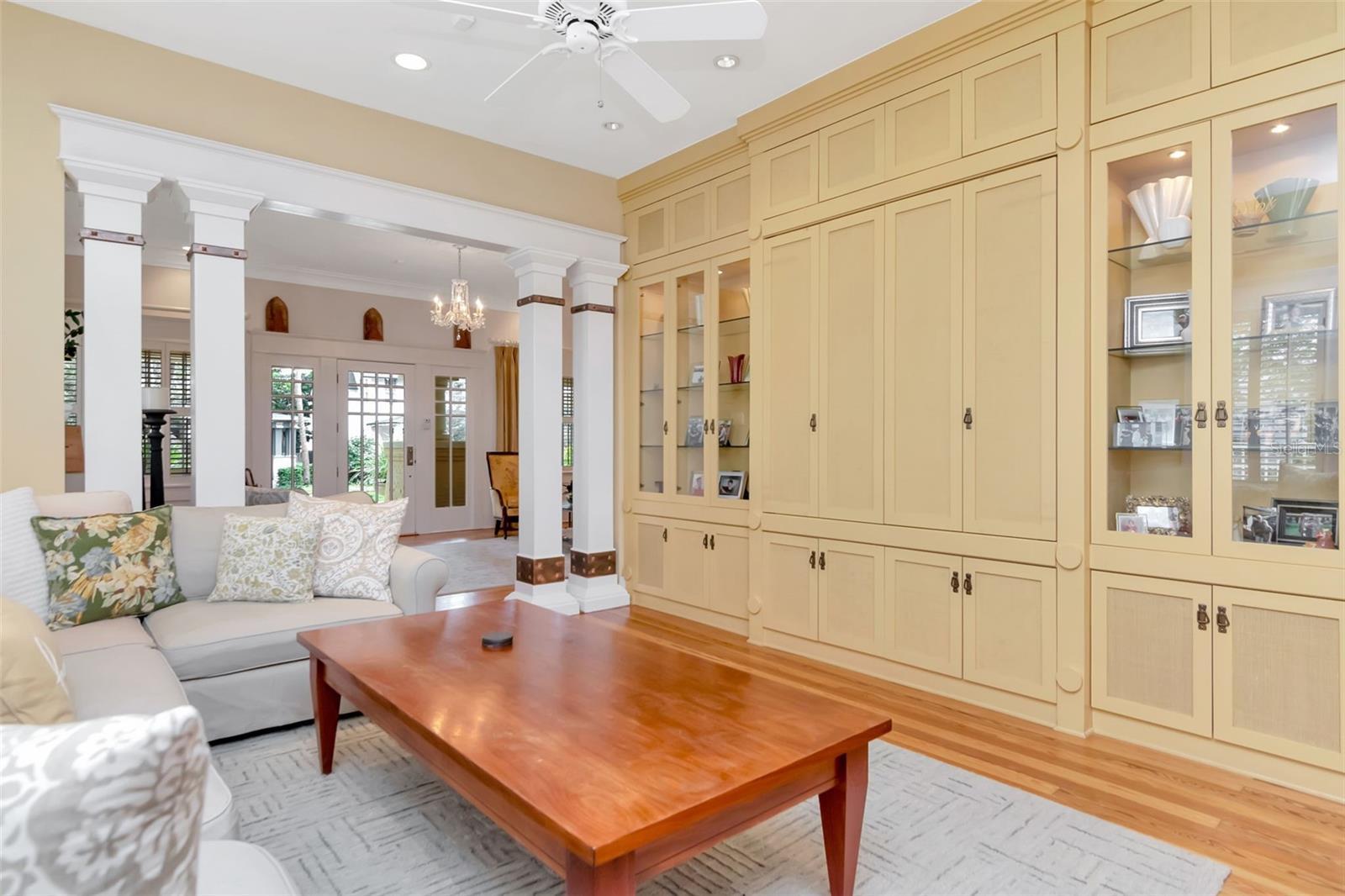 - Built-in Features, Ceiling Fans(s), Central Vaccum, Crown Molding, Eat-in Kitchen, High Ceilings, Kitchen/Family Room Combo, Primary Bedroom Main Floor, Solid Wood Cabinets, Stone Counters, Thermostat, Walk-In Closet(s), Window Treatments