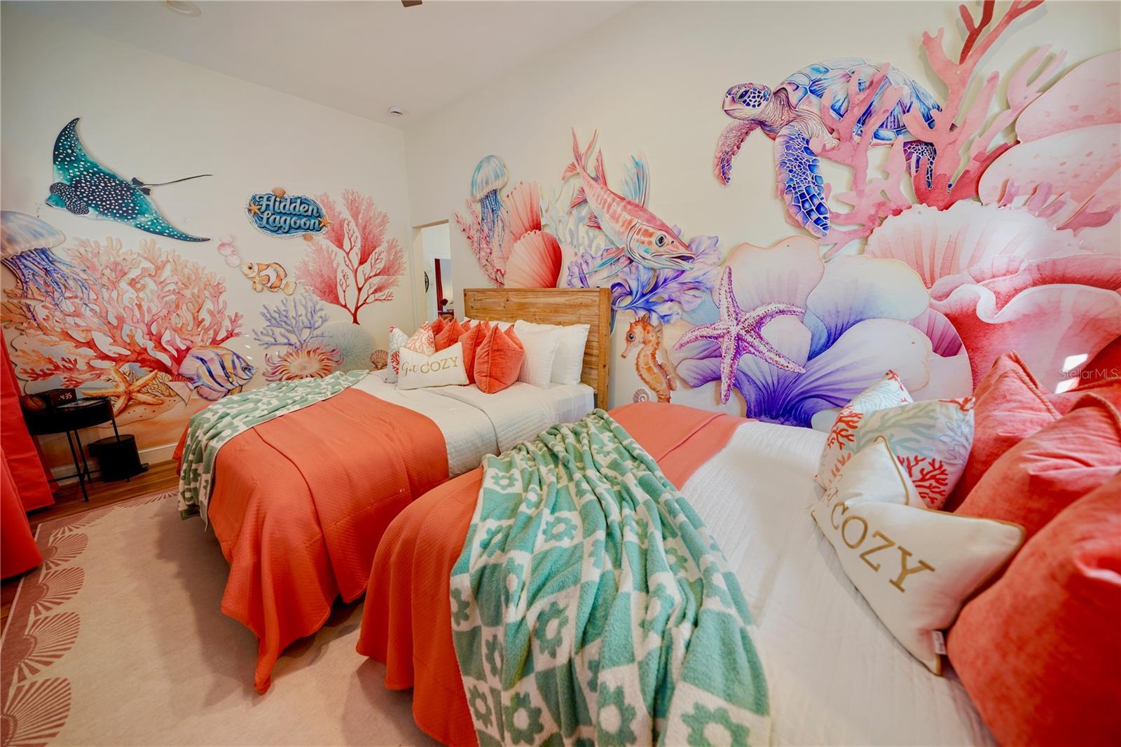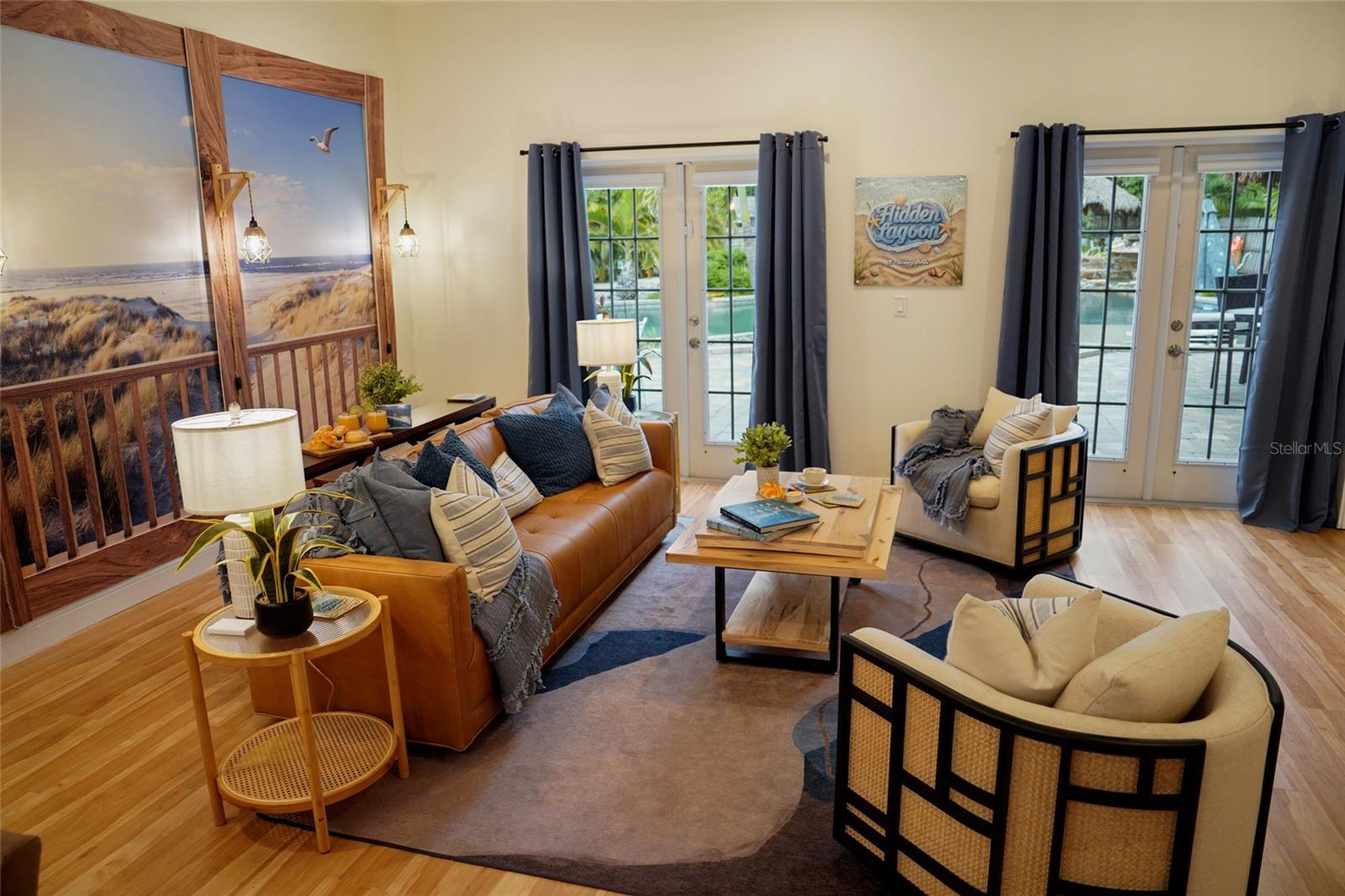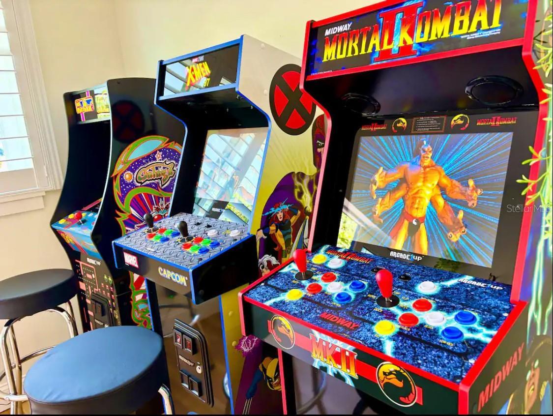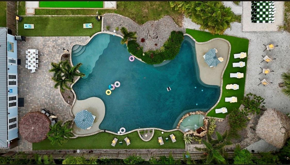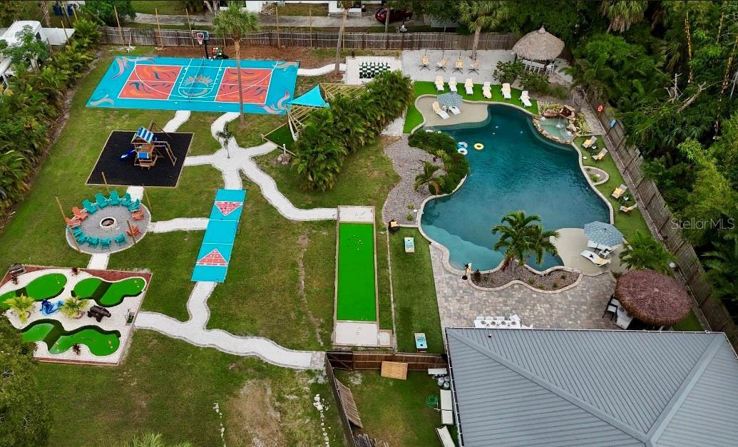 Hidden Lagoon is a one-of-a-kind tropical oasis tucked into a quiet St. Petersburg neighborhood, just minutes from world-class beaches, downtown dining, shopping, and entertainment. This exceptional five-bedroom, three-bath residence is thoughtfully designed to deliver both unforgettable family living and consistent short-term rental success. Step into a private, resort-style backyard anchored by one of the largest lagoon-style pools in Pinellas County, featuring optional seasonal heating, a soothing spa, and dramatic resort lighting for day-to-night enjoyment. The outdoor experience is further elevated by a tiki bar and BBQ pavilion with built-in gas grill and griddle, flat-screen TV, and Bluetooth sound system, creating an ideal setting for entertaining or relaxed poolside afternoons. Exterior amenities rival a true vacation destination and include a full sports court for pickleball and basketball, a custom mini-golf course, firepit lounge, bocce ball court, giant outdoor chess, a playground, and expansive patios with string lighting and multiple lounge areas, all intentionally designed to maximize guest enjoyment and rental appeal. Inside, the home features a gourmet chef’s kitchen with quartz countertops and premium stainless steel appliances, open-concept living spaces filled with natural light and designer finishes, and a dedicated arcade game nook that keeps guests of all ages entertained year-round.