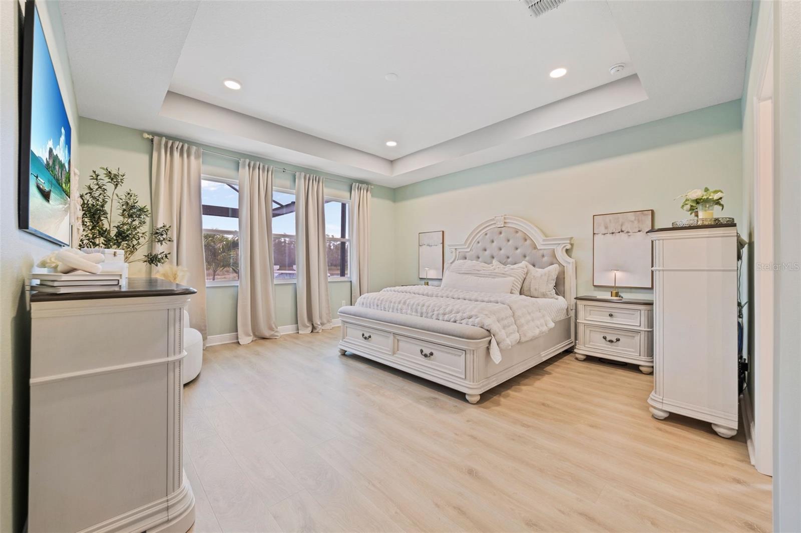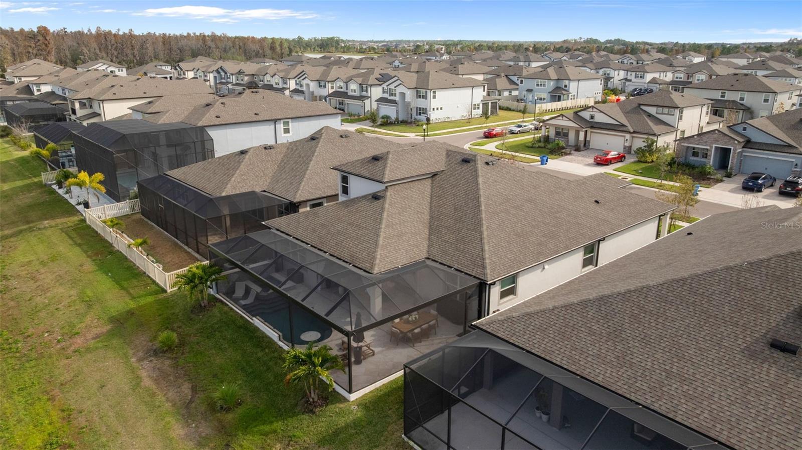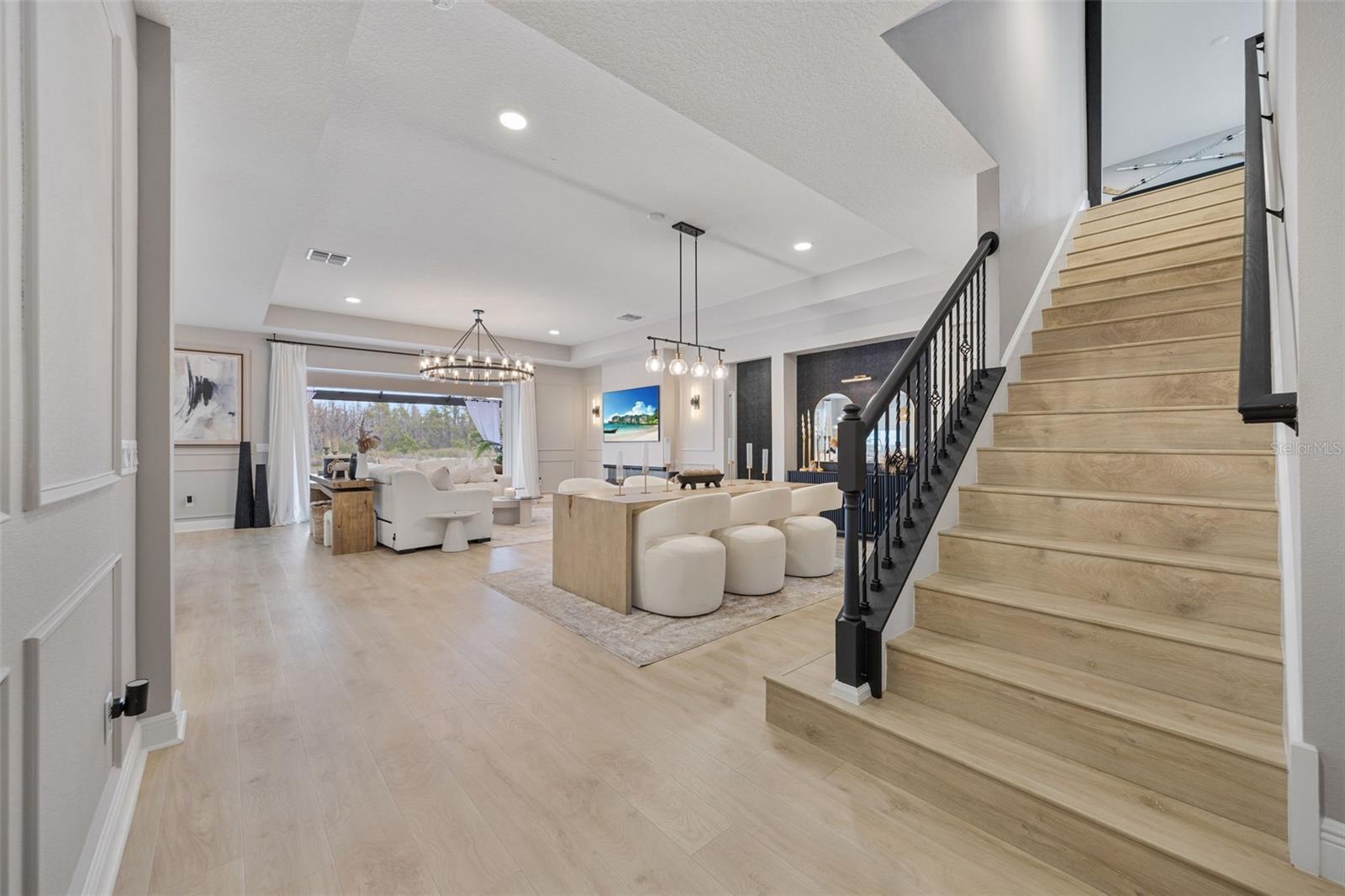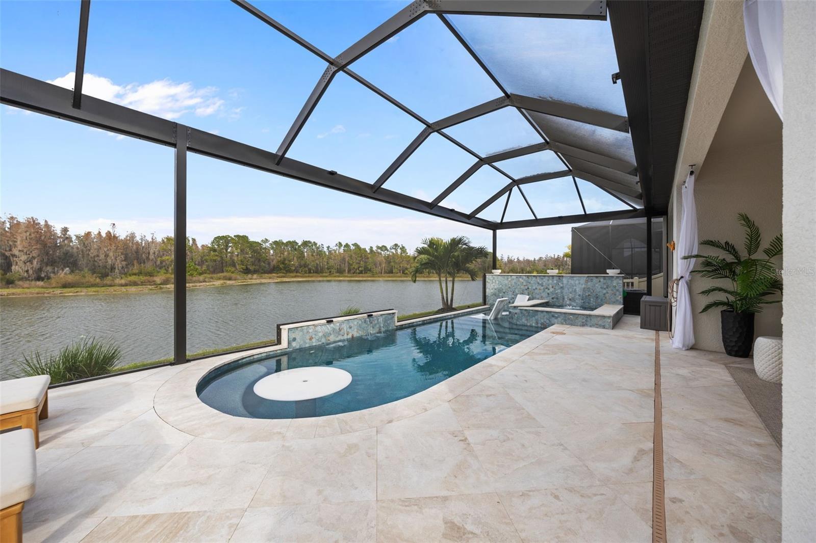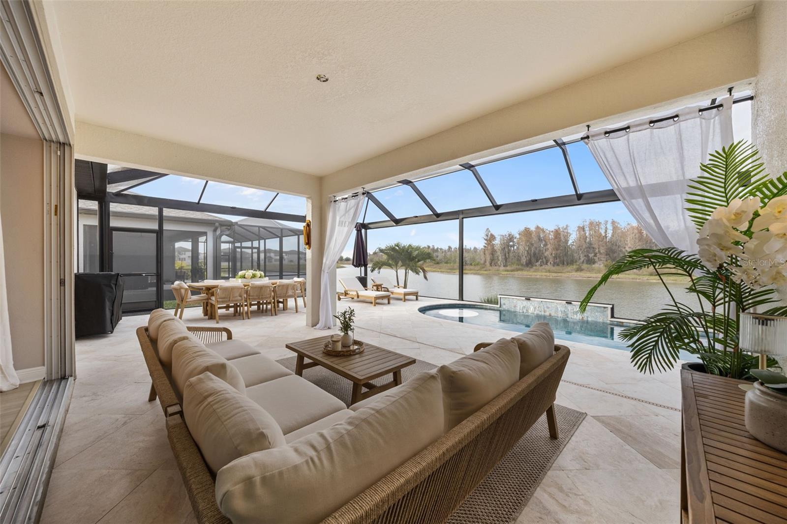 Under contract-accepting backup offers. This future home of yours is proof that you can really have it all! Welcome Home to 7741 Notched Pine Bend, Wesley Chapel, FL 33545. Whether you are looking for a primary home, investor home, or a 1031 exchange, this home is for you! This master planned community is regulated by a pass code secured 24/7 entry gate. Built in 2024 and extensively upgraded and personalized by the current owner, this home is simply breathtaking. There are no CDD or Master Association fees! HOA dues are currently only $98 a month! Over $100k in upgrades and design were invested into this house and it shows. Before you enter the home, you'll notice plenty of driveway space and a cozy front porch area. A grand foyer entry greets all who enter the front door. The spacious primary bedroom, 2.5 bathrooms and a bonus/gym/office room are located downstairs. The downstairs primary bedroom has an en suite bathroom with dual sinks, garden tub, spacious glass and tile shower stall suite, and a custom magnificent walk-in closet (you must see the pictures)! There is a family room/bonus room/loft upstairs, along with another upstairs 1 bedroom and 1 bathroom. The three car garage is incredibly spacious with storage spaces abounding. The under-stair area has been transformed into a separately glass-enclosed wine cellar, and can easily shift to another creative use. The downstairs bonus room is currently a gym and can switch easily to become your own home office suite, playroom, or many other uses. The laundry room is downstairs. Separate living, dining, and breakfast areas rest in a open layout. The kitchen is quart-adorned, full of cabinets, and has a pantry room. The custom electric fireplace brings the hearth of home with a modern flare. There is no carpet flooring in this home. Gigantic sliding glass doors can completely open the home to the vast lighted screened-in porch and a pool deck with a phenomenal vista view. This pool is amazing! It's heated, saltwater, lighted, and has sitting areas with an in-pool table! The day and night views from the outdoor deck are incomparable. Once exiting the screened in pool deck area, you are welcomed to a grassy back yard opening up to a vast private pond. Whispering Oaks Preserve is nestled in a hub easily accessible to the interstate, airport, downtown Tampa, St Petersburg, Clearwater and only 90 minutes from Disney/Orlando. The home is minutes away from Publix, Starbucks, healthcare providers, financial institutions, and shopping. When you come to visit your future home, please drive around this amazing neighborhood and surrounding amenities. This description cannot do the home justice- you simply must see the home portal website and video at: https://listings.textured.media/sites/jggeoje/unbranded and Matterport 3D walk through at: https://my.matterport.com/show/?m=kjMwZTjUqqe&brand=0&mls=1&. The serenity of this space is astounding and requires a personal visit. Please schedule a showing with your agent or contact the listing agent for a showing as soon as possible. This is the one you've been looking for! Don't forget to look through over 100 pictures, video and 3D Matterport so you can plan your future life in this amazing home. They rarely make homes like this and they are not on the market often. Furnishings are negotiable with home sale! Statements and measurements are believed accurate by Seller/Agent, however they cannot be guaranteed. Buyer and Buyer's agent must confirm all statements and measurements for themselves.