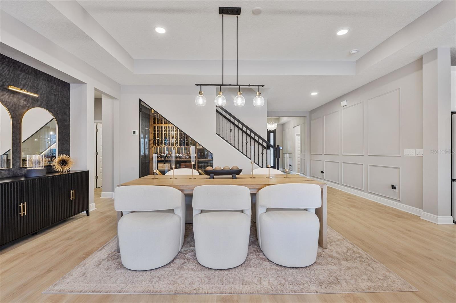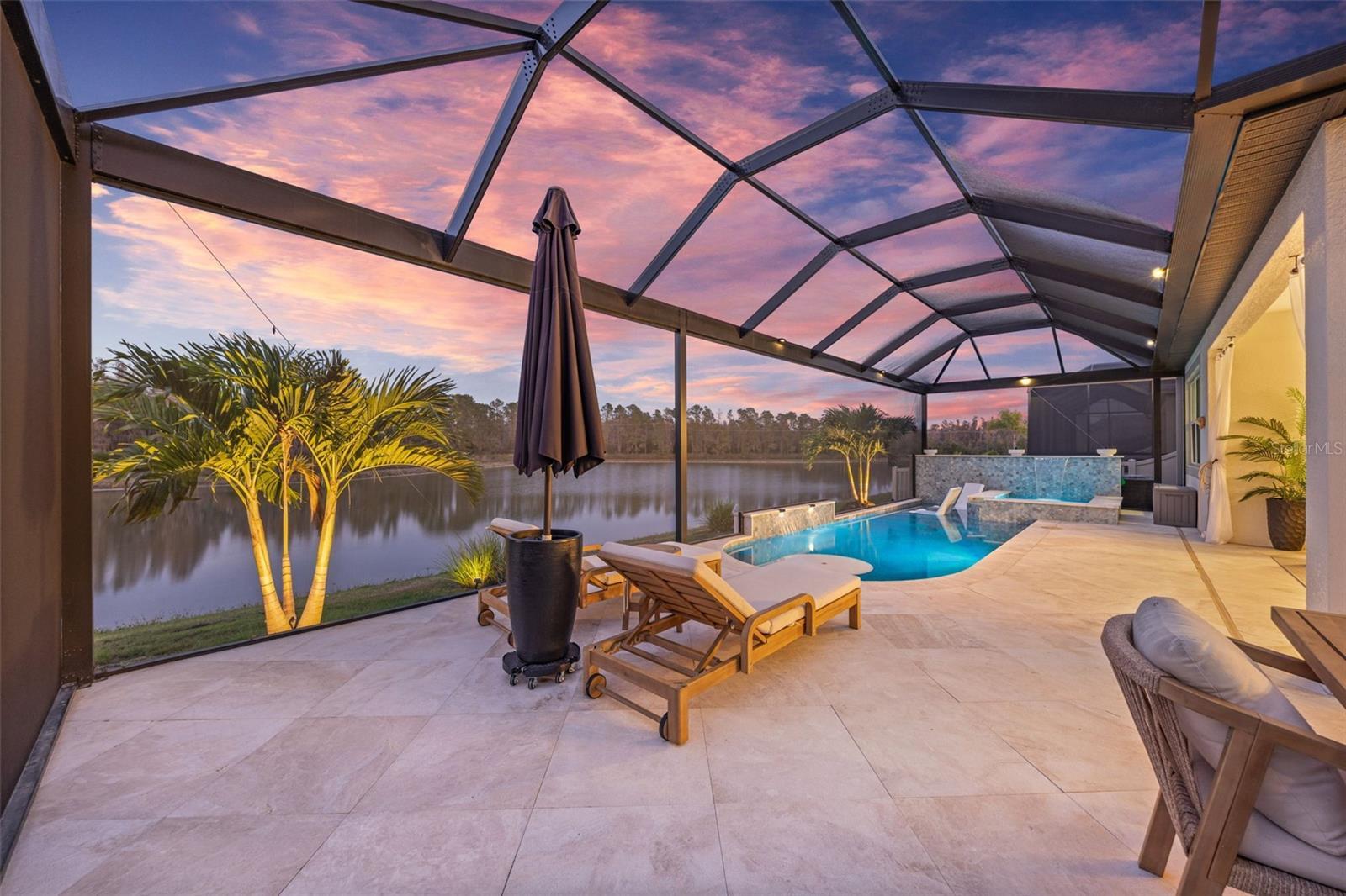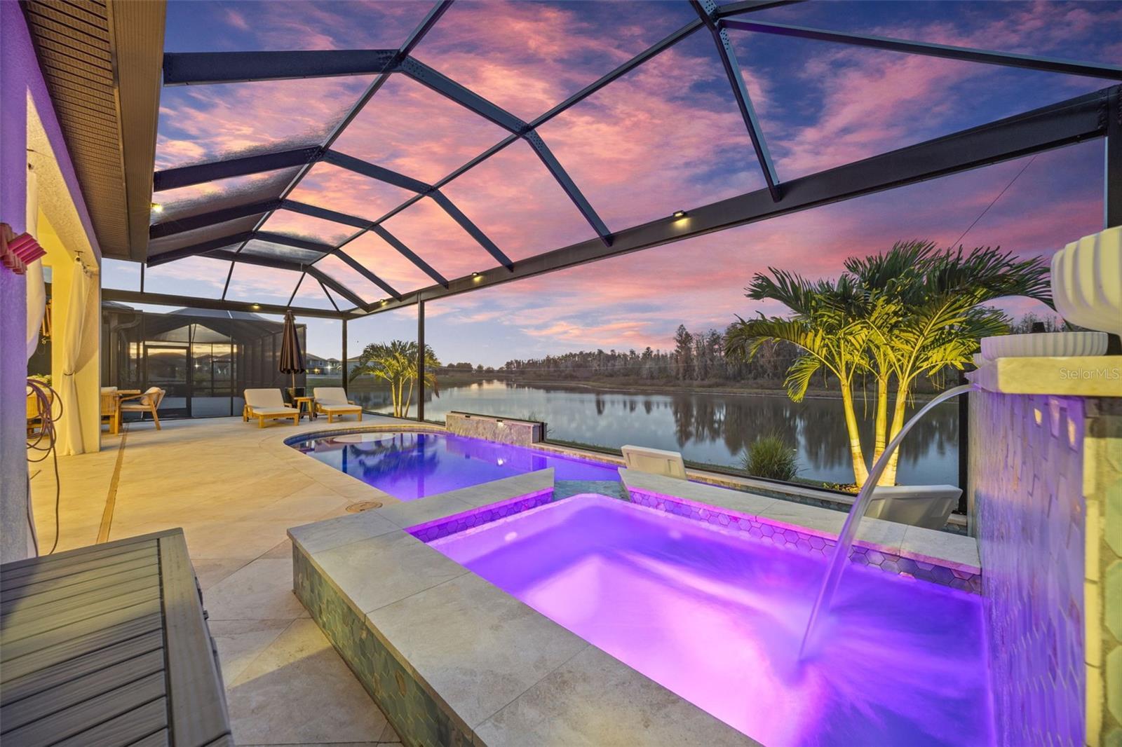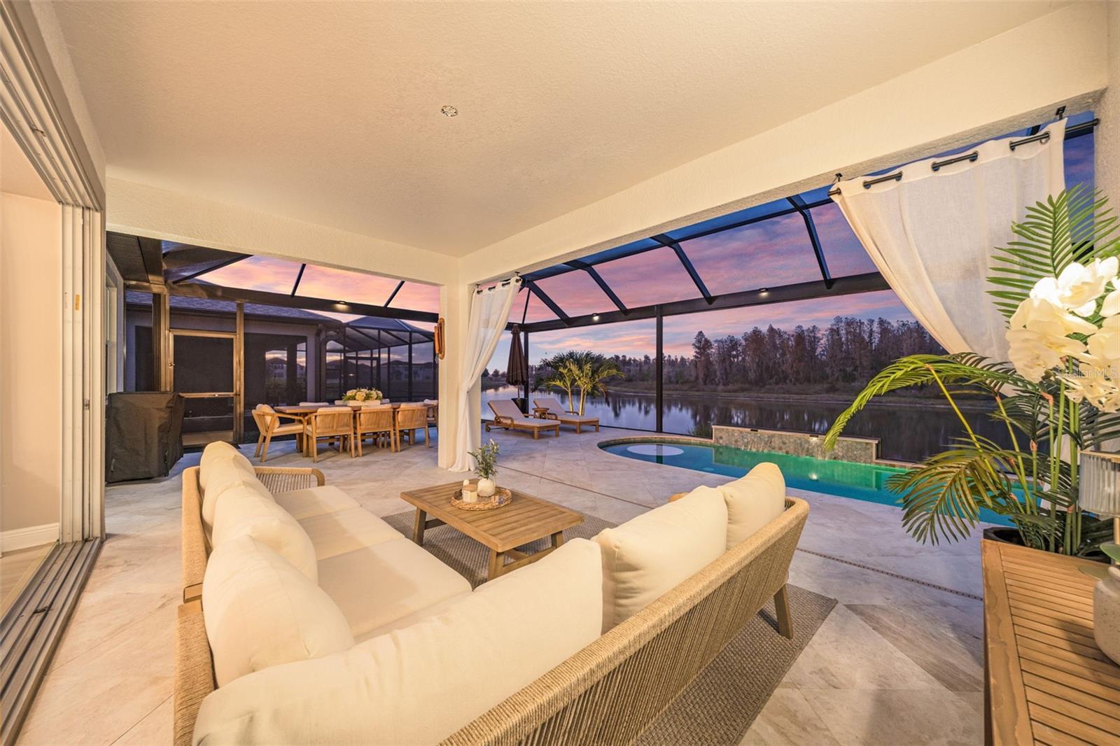 Under contract-accepting backup offers. This future home of yours is proof that you can really have it all! Welcome Home to 7741 Notched Pine Bend, Wesley Chapel, FL 33545. Whether you are looking for a primary home, investor home, or a 1031 exchange, this home is for you! This master planned community is regulated by a pass code secured 24/7 entry gate. Built in 2024 and extensively upgraded and personalized by the current owner, this home is simply breathtaking. There are no CDD or Master Association fees! HOA dues are currently only $98 a month! Over $100k in upgrades and design were invested into this house and it shows. Before you enter the home, you'll notice plenty of driveway space and a cozy front porch area. A grand foyer entry greets all who enter the front door. The spacious primary bedroom, 2.5 bathrooms and a bonus/gym/office room are located downstairs. The downstairs primary bedroom has an en suite bathroom with dual sinks, garden tub, spacious glass and tile shower stall suite, and a custom magnificent walk-in closet (you must see the pictures)! There is a family room/bonus room/loft upstairs, along with another upstairs 1 bedroom and 1 bathroom. The three car garage is incredibly spacious with storage spaces abounding. The under-stair area has been transformed into a separately glass-enclosed wine cellar, and can easily shift to another creative use. The downstairs bonus room is currently a gym and can switch easily to become your own home office suite, playroom, or many other uses. The laundry room is downstairs. Separate living, dining, and breakfast areas rest in a open layout. The kitchen is quart-adorned, full of cabinets, and has a pantry room. The custom electric fireplace brings the hearth of home with a modern flare. There is no carpet flooring in this home. Gigantic sliding glass doors can completely open the home to the vast lighted screened-in porch and a pool deck with a phenomenal vista view. This pool is amazing! It's heated, saltwater, lighted, and has sitting areas with an in-pool table! The day and night views from the outdoor deck are incomparable. Once exiting the screened in pool deck area, you are welcomed to a grassy back yard opening up to a vast private pond. Whispering Oaks Preserve is nestled in a hub easily accessible to the interstate, airport, downtown Tampa, St Petersburg, Clearwater and only 90 minutes from Disney/Orlando. The home is minutes away from Publix, Starbucks, healthcare providers, financial institutions, and shopping. When you come to visit your future home, please drive around this amazing neighborhood and surrounding amenities. This description cannot do the home justice- you simply must see the home portal website and video at: https://listings.textured.media/sites/jggeoje/unbranded and Matterport 3D walk through at: https://my.matterport.com/show/?m=kjMwZTjUqqe&brand=0&mls=1&. The serenity of this space is astounding and requires a personal visit. Please schedule a showing with your agent or contact the listing agent for a showing as soon as possible. This is the one you've been looking for! Don't forget to look through over 100 pictures, video and 3D Matterport so you can plan your future life in this amazing home. They rarely make homes like this and they are not on the market often. Furnishings are negotiable with home sale! Statements and measurements are believed accurate by Seller/Agent, however they cannot be guaranteed. Buyer and Buyer's agent must confirm all statements and measurements for themselves.