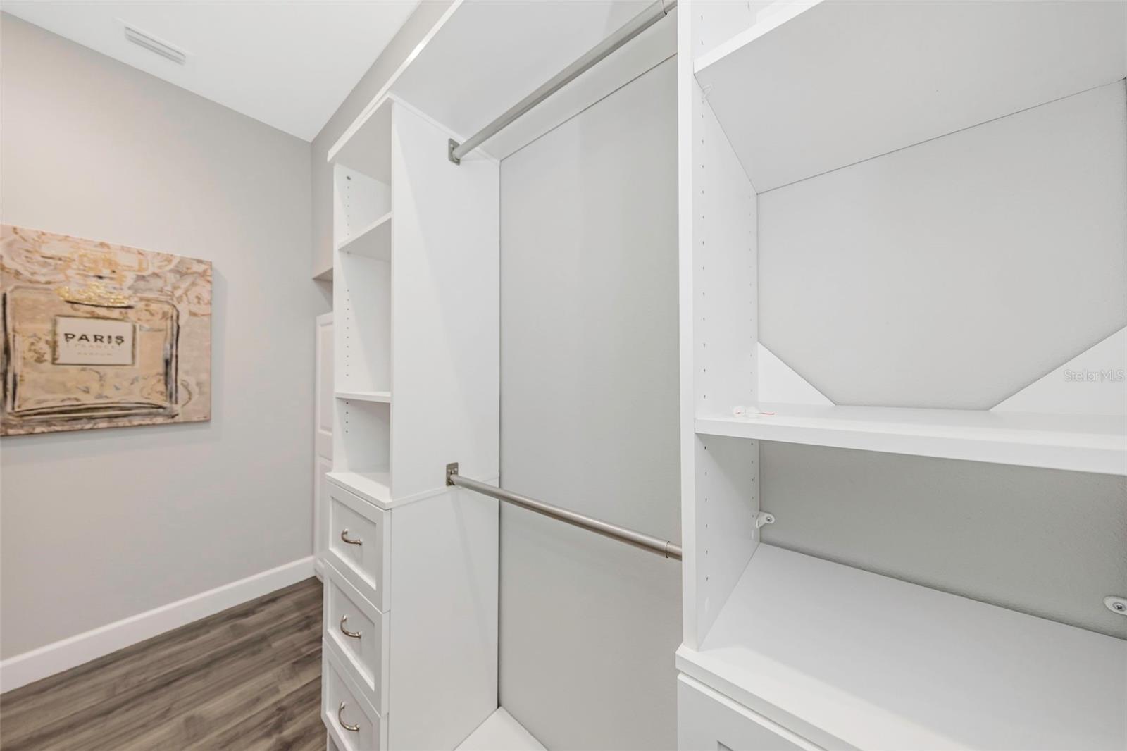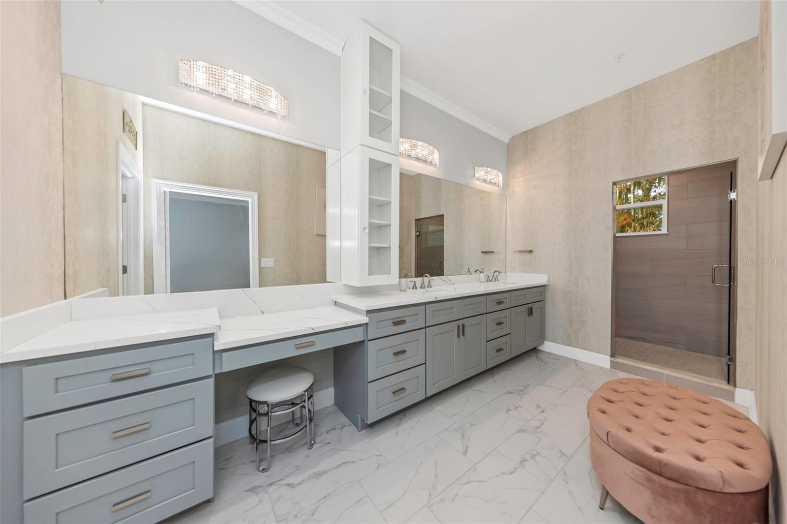 - Ceiling Fans(s), Crown Molding, Eat-in Kitchen, High Ceilings, Kitchen/Family Room Combo, Living Room/Dining Room Combo, PrimaryBedroom Upstairs, Solid Surface Counters, Solid Wood Cabinets, Split Bedroom, Stone Counters, Thermostat, Walk-In Closet(s), Window Treatments