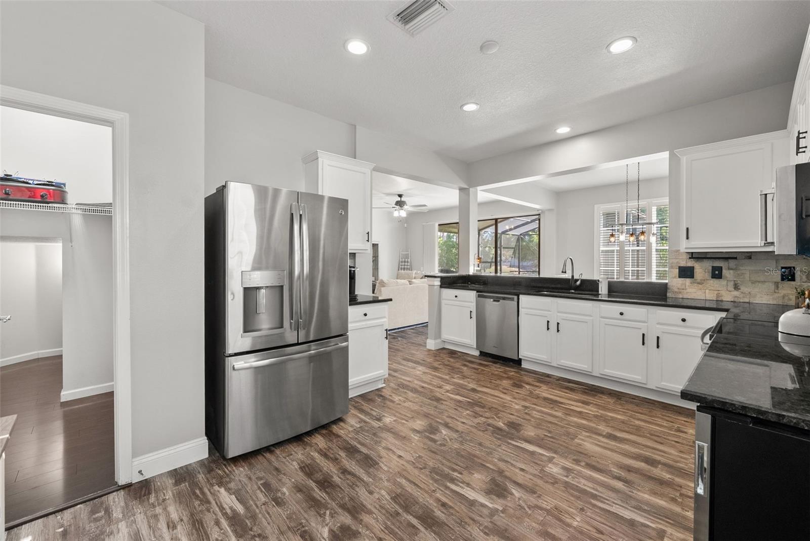Furnished option: This waterfront retreat blends elegance with everyday ease, offering a lifestyle that feels both elevated and effortless. Sunlight pours through the soaring foyer entry, highlighting fresh designer finishes and new flooring that flows seamlessly throughout the home. At its heart, the modern kitchen is as stylish as it is functional, with granite counters, stainless steel appliances, and plenty of storage. Its open design connects beautifully to the spacious living and dining areas, creating the perfect setting for cozy nights in or lively gatherings. Step through the expansive sliding glass doors and discover your private sanctuary: a screened lanai complete with a hot tub, dining space, and tranquil water views that make every day feel like a getaway. Upstairs, the primary suite offers spa-like luxury with a soaking tub, double vanity, walk-in shower, and massive walk-in closet. Every detail has been designed for comfort and peace of mind—from the newer water heater and softener system to the garage door privacy screen that brings added year-round convenience. With fresh paint, no carpet, and a serene waterfront backdrop, this home invites you to relax, entertain, and live beautifully each day. Great properties don’t last long—schedule your private tour today!