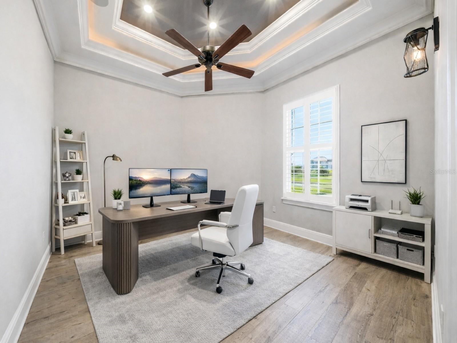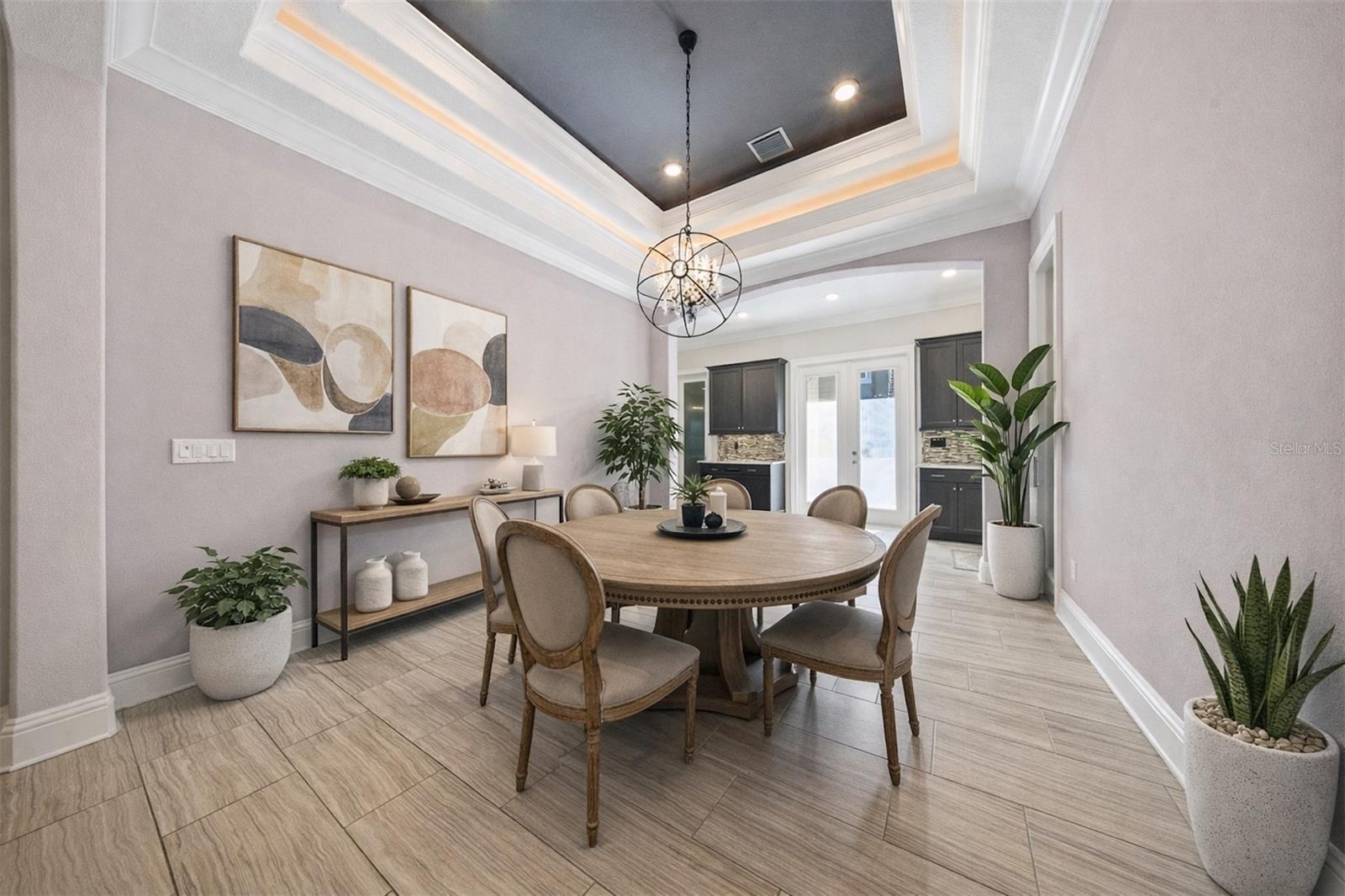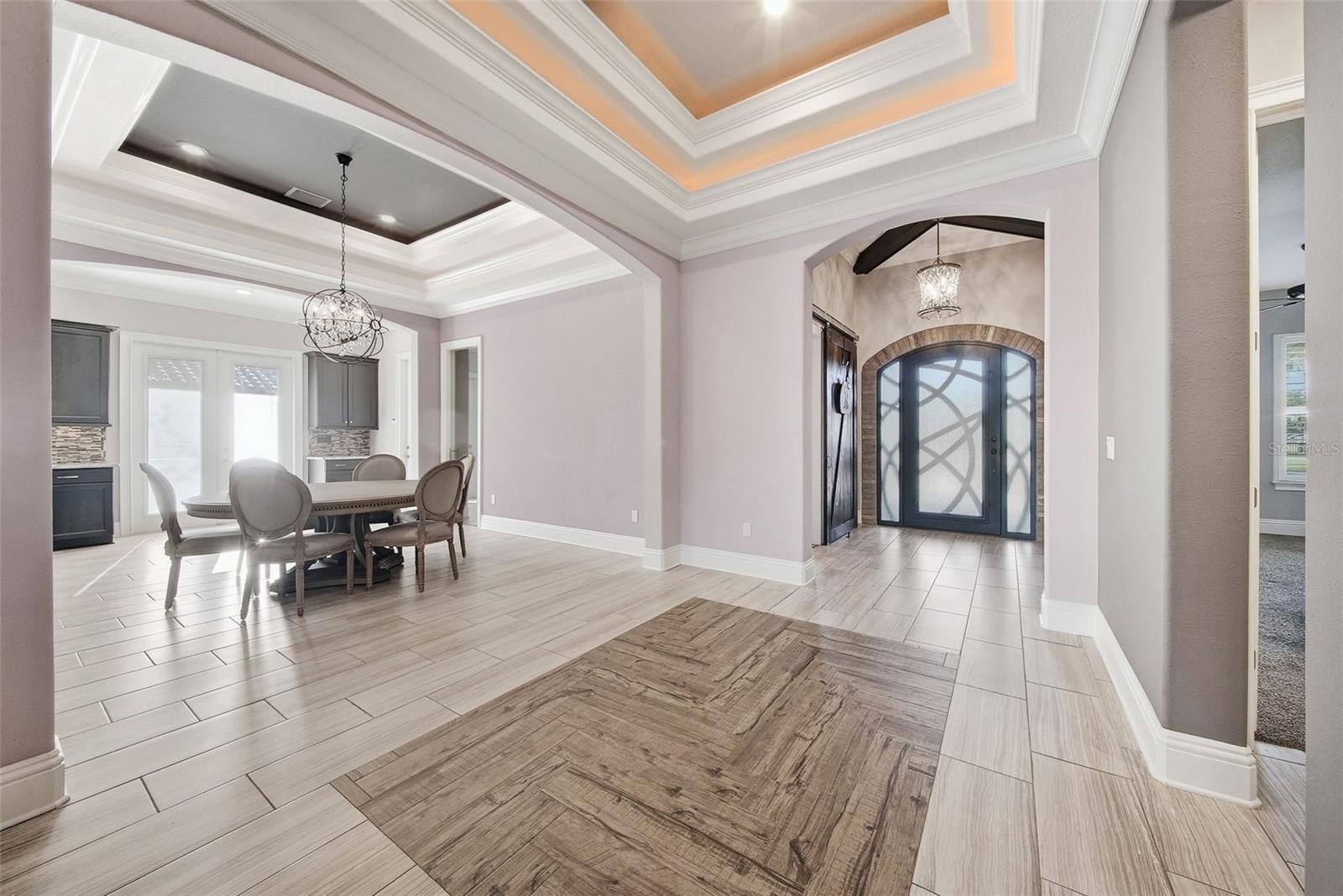 - Ceiling Fans(s), Crown Molding, Dry Bar, Eat-in Kitchen, High Ceilings, Kitchen/Family Room Combo, Open Floorplan, Primary Bedroom Main Floor, Thermostat, Tray Ceiling(s), Walk-In Closet(s), Window Treatments