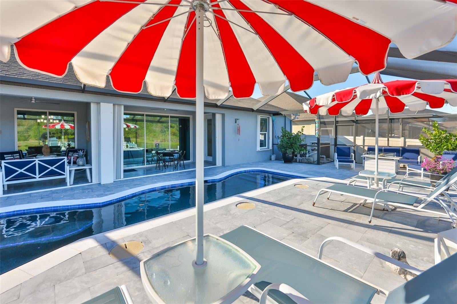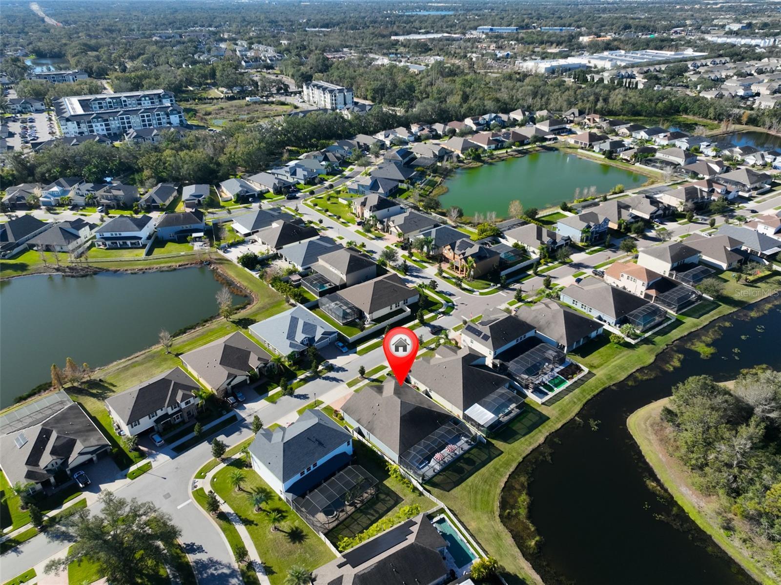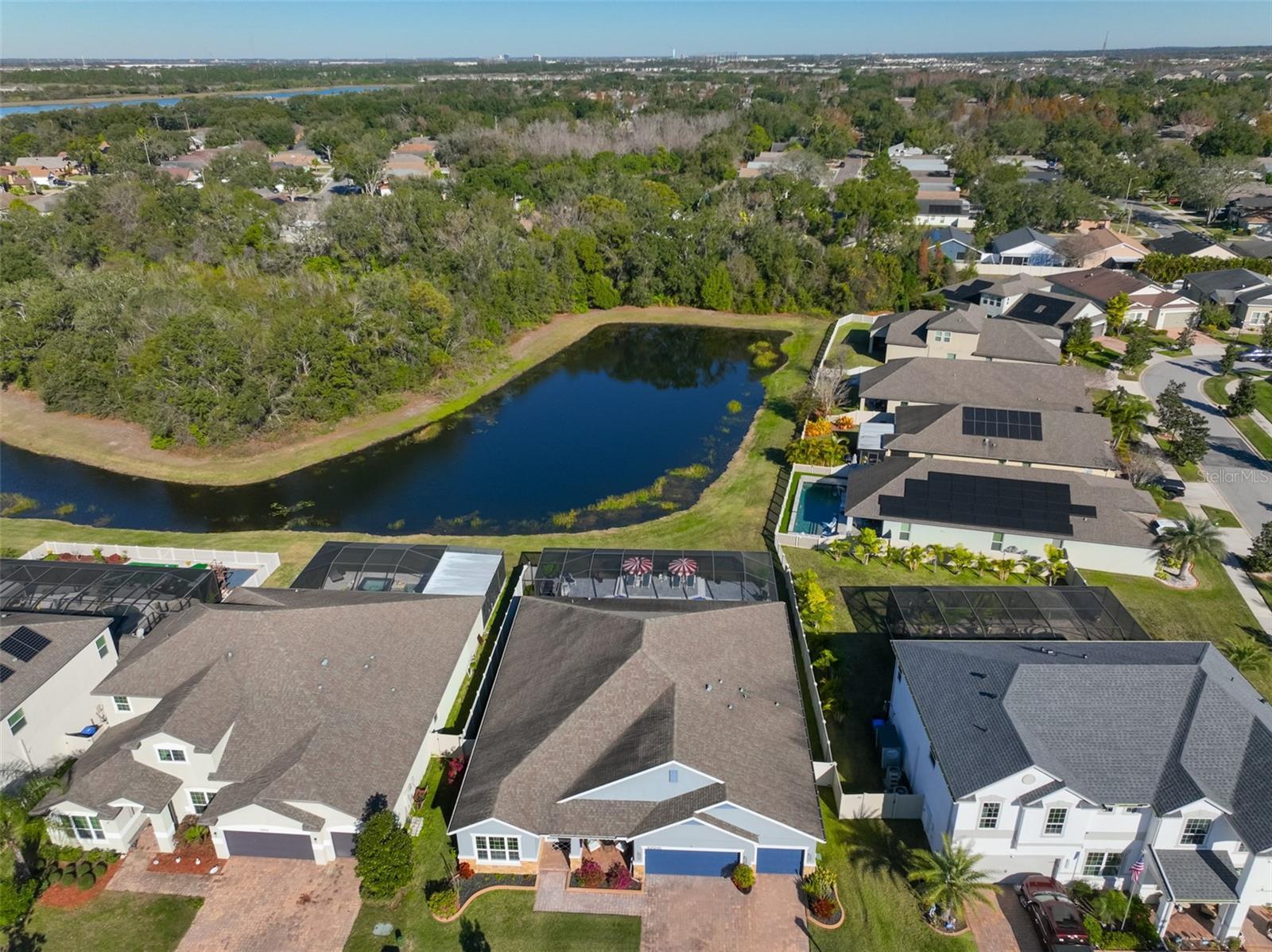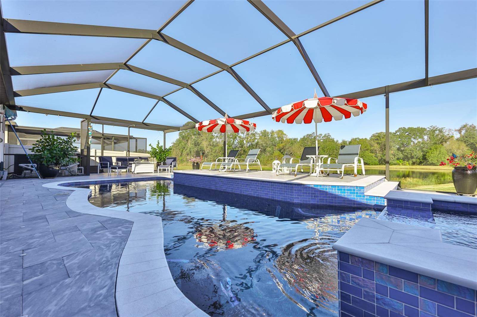 This extensively upgraded 4-bedroom, 3-bath, 3-car garage home with a den/office/study offers a refined blend of luxury, technology, and thoughtful design, ideal for both everyday living and upscale entertaining. Located in a highly desirable gated community with NO CDD. Click VIRTUAL TOUR 1 to watch the full video walkthrough. Home is situated on a premium pond homesite with conservation views and NO BACKYARD neighbors. The home features luxury plank ceramic tile flooring throughout. The gourmet kitchen showcases granite countertops, a full tile backsplash, custom 42" upper cabinets, under-cabinet lighting, a large center island, and four pendant lights positioned above the breakfast bar. A spacious walk-in pantry with an etched-glass door and a butler’s pantry with a wine rack add both style and functionality. Built-in stainless steel appliances include a flat-surface cooktop with designer range hood, plus a built-in microwave and oven. A bright dinette opens to the lanai, while the kitchen flows seamlessly into the expansive family room. Floor outlets in both the family and living rooms provide added flexibility. At the front of the home, a private office/den behind French glass doors offers a quiet workspace and features BOSE ceiling speakers for surround sound, which extend throughout the family room, primary bedroom, primary bathroom, and lanai. A secluded guest bedroom and full bath with linen closet provide an ideal setup for guests or multigenerational living. The primary suite is privately situated with serene pond and conservation views and features a well-appointed primary bathroom with a custom California-style walk-in closet with built-in shelving, dual vanities, a standalone soaking tub, and a walk-in shower with rain showerhead. Outdoor Living Upgrades: The home offers a covered lanai with travertine pavers, three ceiling fans, and plumbing in place for an outdoor kitchen and sink, along with an extended screened lanai with travertine paver decking. Enjoy a heated SALTWATER pool and spa, fully app-controlled, with lighting in both the pool and spa, three water fountains, two in-pool stools, and spa jets, all enhanced by a panoramic screen enclosure that maximizes unobstructed pond views. Pool safety alarms and a removable safety fence provide added peace of mind. Additional features include motorized window shades throughout, crown molding throughout, easy-close accordion hurricane shutters, a thoughtfully added front porch enhancing curb appeal, rain gutters, and a partially fenced yard. The laundry room includes granite countertops, extra cabinetry, a utility sink, and an etched-glass door. The garage is equipped with LED lighting, a security camera, keypad entry, and dedicated circuit breakers for both the AC system and refrigerator. Major updates include a new AC/HVAC system and refrigerator (2025) and ductwork replaced in 2022. Community amenities include a pool, clubhouse, and playground. Situated in a PRIME LOCATION, this home is just minutes from schools, daycares, gyms, hospitals, shopping, and dining, with easy access to the Crosstown Expressway and I-75 for a convenient commute. Tampa, Orlando, Disney, and Florida’s top-rated beaches are all within a comfortable drive. Meticulously maintained, this home offers exceptional privacy, extensive upgrades, and the ideal balance of suburban tranquility and urban convenience. Schedule your private showing today—this one is not to be missed.