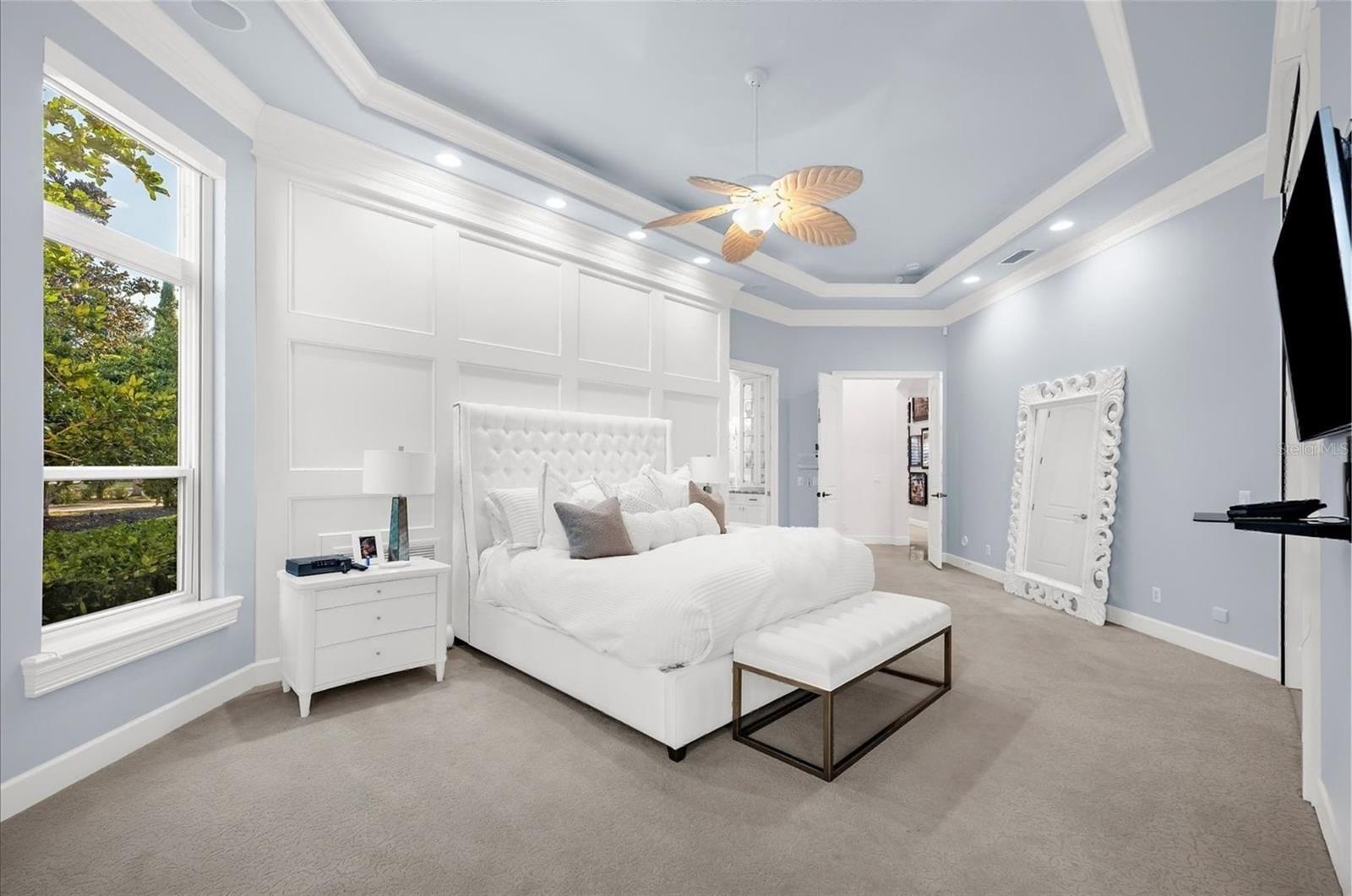 - Built-in Features, Ceiling Fans(s), Central Vaccum, Crown Molding, Dry Bar, Eat-in Kitchen, High Ceilings, Kitchen/Family Room Combo, L Dining, Living Room/Dining Room Combo, Open Floorplan, Primary Bedroom Main Floor, Solid Surface Counters, Solid Wood Cabinets, Stone Counters, Thermostat, Tray Ceiling(s), Walk-In Closet(s), Wet Bar, Window Treatments