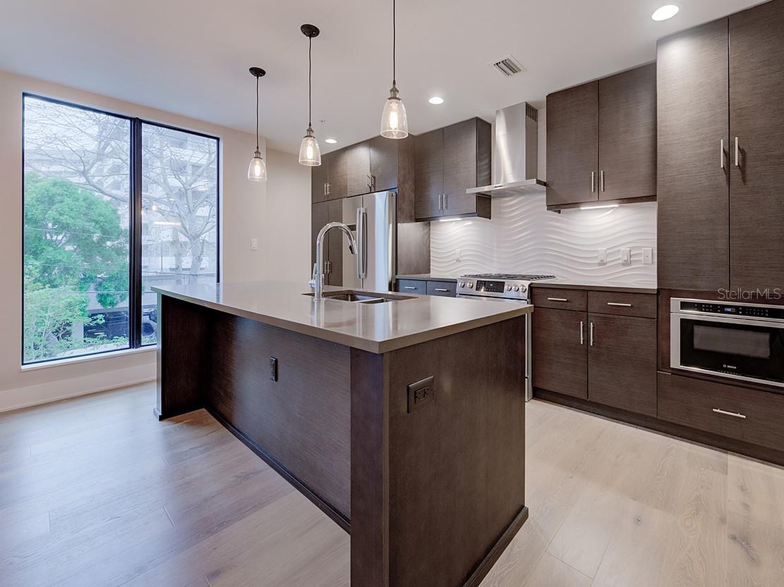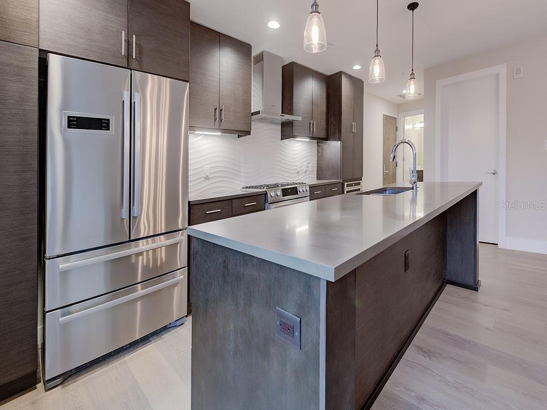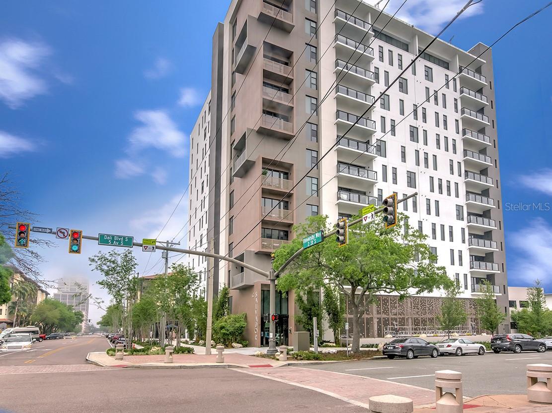 The Salvador, high-end modern condominium in Downtown St. Petersburg. This corner home has tons of large windows (7 ft) for natural light, and a large open layout from the kitchen to the great room for dining and living room, with a spacious bedroom that fits a king size bed & additional furniture. A half bath, laundry area, and private balcony are all a part of this floorplan. The home is equipped with Bosch SS appliances, including a gas range, as well as a GE wine cooler. The entire home has wide plank distressed engineered wood flooring, with durability and clean lines. The countertops in both the kitchen and bathrooms are a solid quartz solid top. Beautiful modern tile backsplash, and undermount sinks are just some of the luxurious finishes in the home. The community features a 3rd floor amenity deck with a saltwater, heated pool. A state of the art fitness center, clubroom, grilling station, gated dog park area with cleaning station, sculpture garden, & outdoor fire pit area all make the Salvador first class. The 2 story, 1st floor lobby will feature a concierge & a beautiful sitting area with secured access to community. Located within a walk to Publix, Starbucks, USFSP, Dali, & Mahaffey; you will find convenience at every corner.