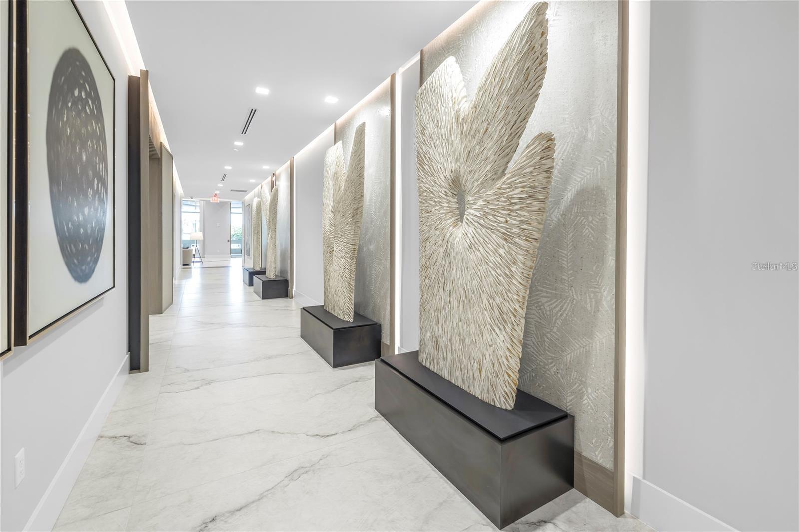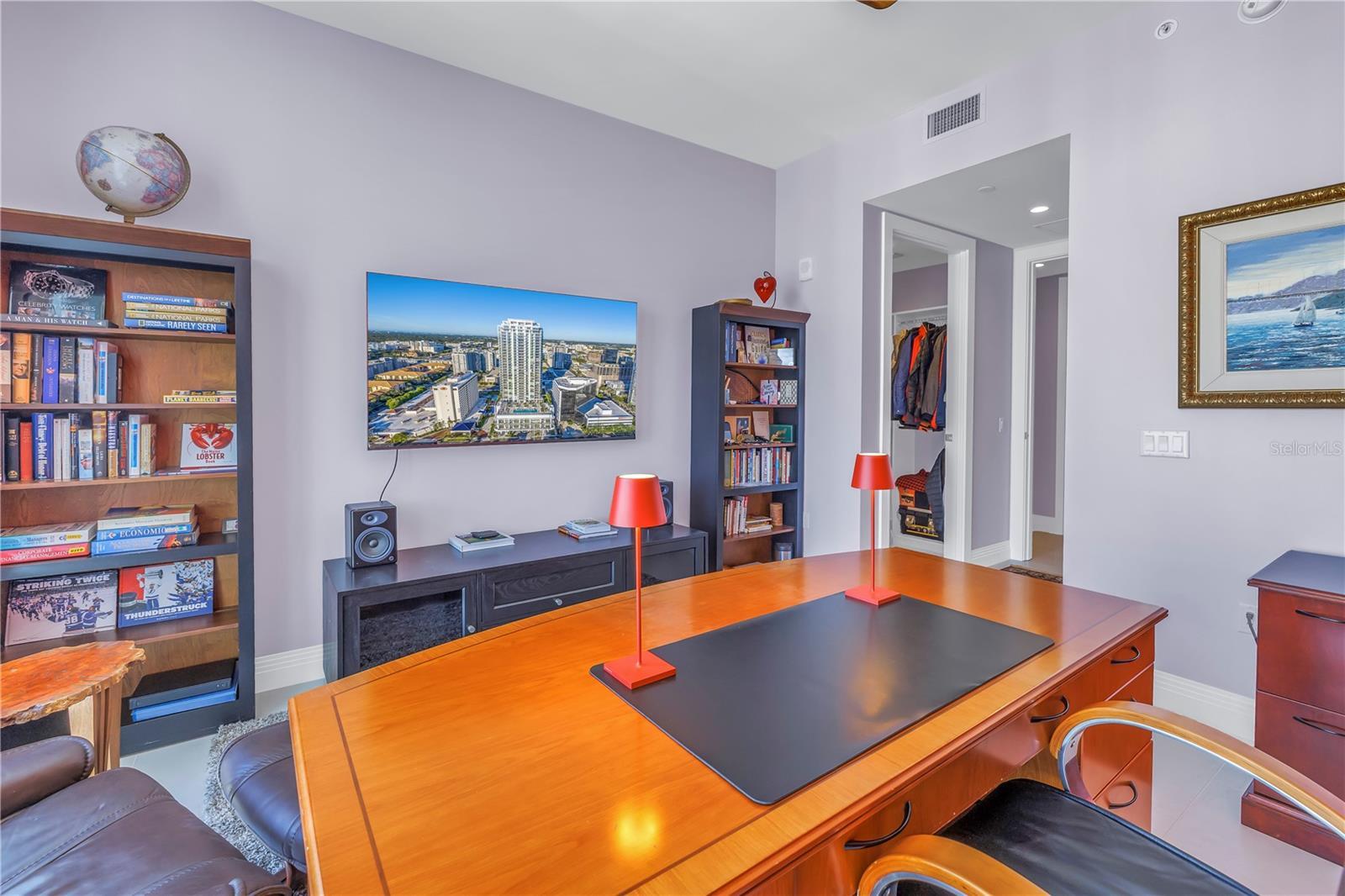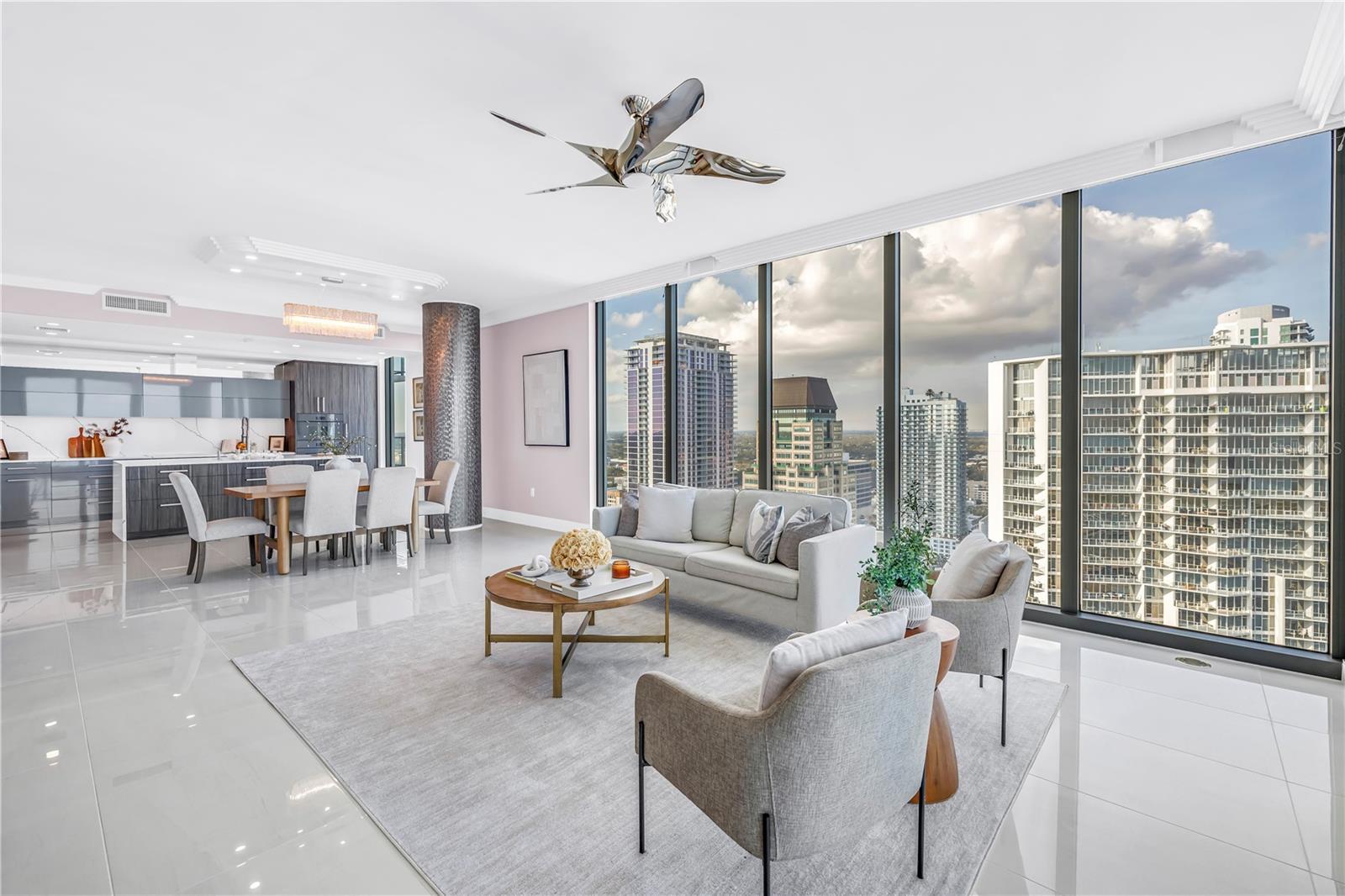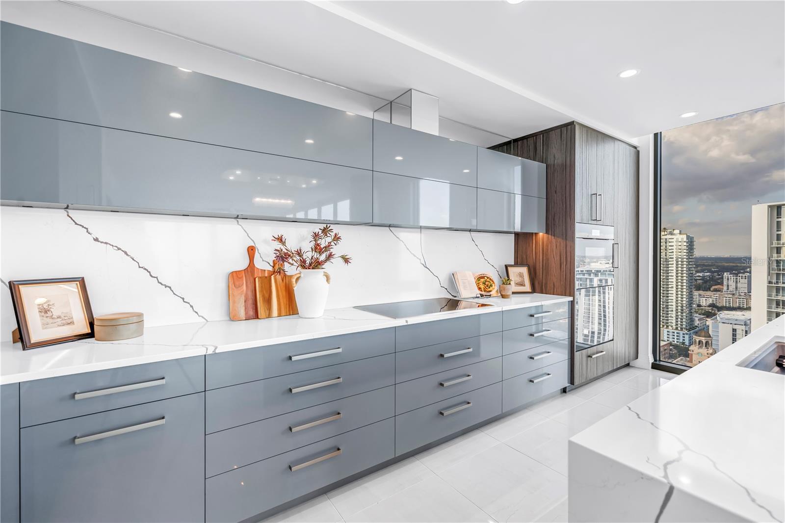 This 3 bedroom, 4 full bath, 2712 SF Azure unit at Saltaire features custom and luxurious upgrades with floor to ceiling, unobstructed views from the NE corner of St. Petersburg's premier luxury condo building. Step into a bright entry & open living room, with high ceilings, recessed LED lighting, & gorgeous large format porcelain tile floors. Follow the light into the custom chef's kitchen, thoughtfully redesigned by Michael Bright of Bright Wood Works, in coordination w/ Exceptional Granite Tile and Marble. The original island was made wider to accommodate more storage, & is covered with a waterfall edge Pompeii Greylac Book Match quartz that effortlessly transitions to the adjacent countertops & backsplash. A Jenn-Air fridge was custom outfitted to blend in with the cabinetry, & top of the line Miele cook top, microwave, oven, dishwasher, & coffee maker are just a few upgrades. Custom details like hidden outlets & charging stations, hydraulic openers on upper cabinetry, specialty trash opener, paper towel dispenser, Franke sink, & more make this kitchen an entertainer's dream! For ultimate entertaining, the kitchen is open to expansive dining space, featuring a custom tray ceiling with changeable LED lighting to highlight the most spectacular of chandeliers. Bright Wood Works also designed a fabulous wet bar, complete with lighted displays, Sub-Zero wine cooler, beverage refrigerator & ice maker, & more hidden storage for all your party supplies. The kitchen, dining room, & family room are one expansive, light filled space with floor to ceiling impact windows, automated roll down shades from the Blind & Shutter Gallery, custom built-in home theater featuring a 78” Sony TV w/ Definitive Technology towers & Denon surround sound, lighted display case, & sliding doors that open to a large outside covered balcony. From your living space & master bedroom, you have spectacular views of Tampa Bay, Albert Whitted Airport, multiple yacht basins, the Pier & Downtown St. Petersburg. Continue through the family room to your master suite, w/ floor to ceiling windows, automated roll down shades, custom crown molding, Artemis lighted ceiling fan, two walk in closets customized by Closets By Design, & a gorgeous master bath re-imagined by Michael Bright. Custom floating double vanity features lighting above & below, w/ extra storage & custom under mount porcelain sinks. Toilet closet features frosted glass enclosure hiding a top of the line Toto toilet, & generous glassed walk in shower features a built in bench & soap niche. The Azure plan features a split bedrooms, so your guests can enjoy private guest rooms off the living room. Two guest bedrooms feature high ceilings, Artemis lighted ceiling fans, walk in closets customized by Closets By Design, & en-suite bathrooms w/ custom vanities, porcelain under mount sinks, Toto toilets, & walk in showers. There is a large laundry room w/ Whirlpool washer & dryer, utility sink, & extra wine cooler. A fourth full bathroom is in the hallway for convenience, w/ Toto toilet & shower that has been converted to a storage closet. This unit also has a deeded storage unit in the common area hallway, & two deeded parking spots together on the 3rd Parking Floor. Saltaire is a fabulous building w/ covered drive in entry, grand lobby with 24 hour concierge, resort style pool and spa, cozy cabanas, social & club rooms, fitness center, dog run, and more. Make your private appointment today!