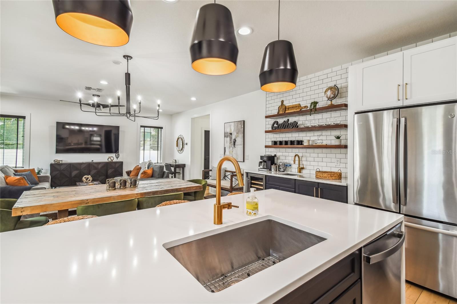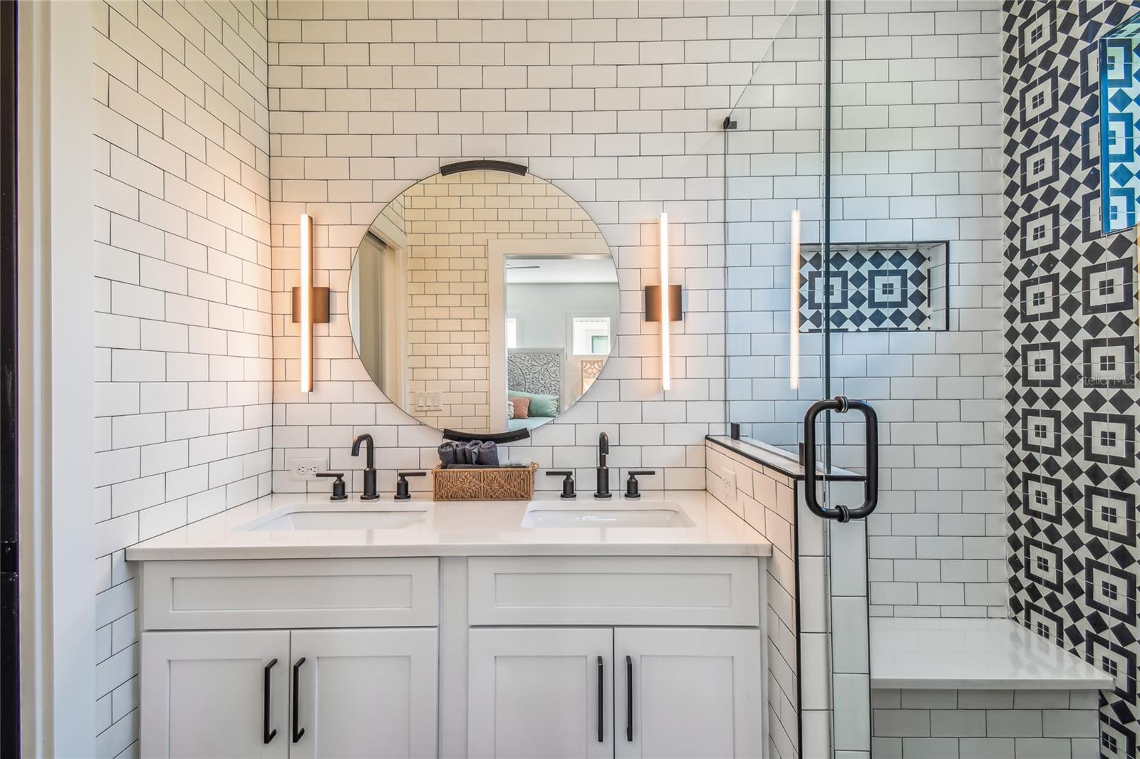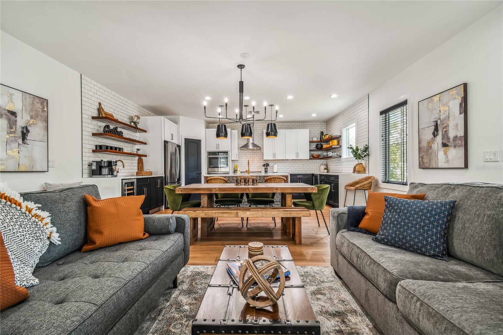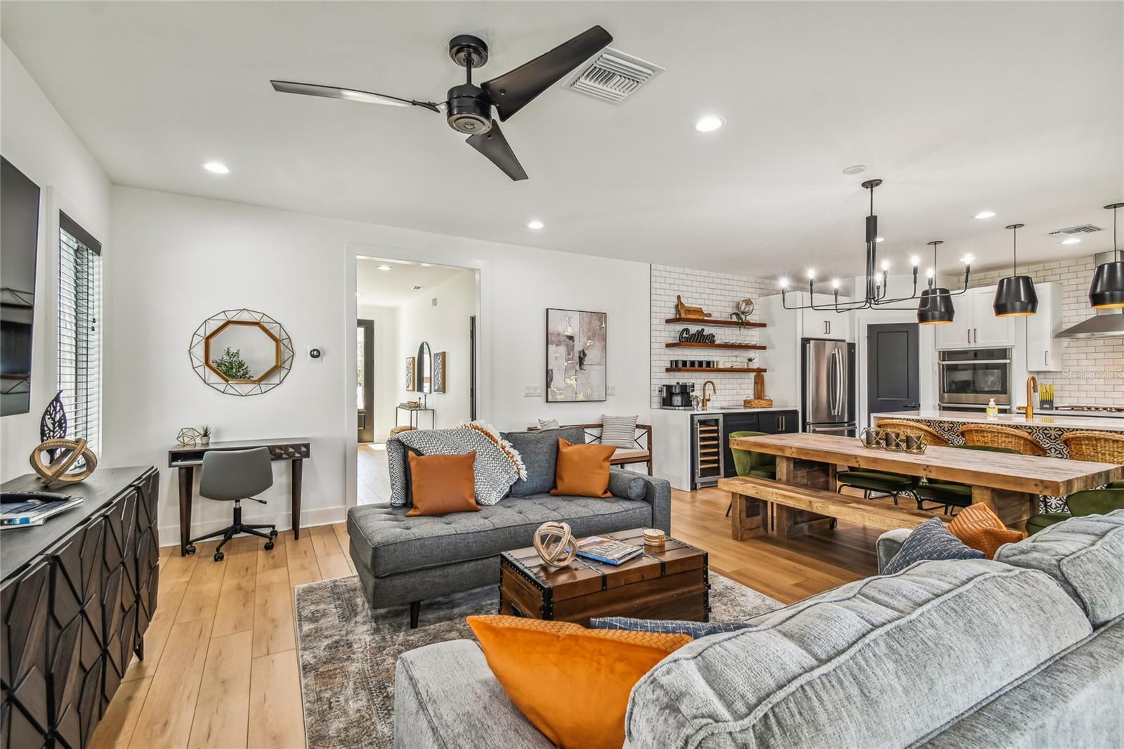 Under contract-accepting backup offers. Tucked away in the heart of South Seminole Heights, this impeccably maintained and thoughtfully designed four-bedroom, two-and-a-half-bath residence is truly move-in ready. Eye-catching curb appeal sets the tone with a Spanish-inspired façade and an inviting covered front porch. Step inside to an abundance of natural light and beautiful Coretec luxury vinyl plank flooring that flows seamlessly throughout the home. The open-concept first floor is ideal for both everyday living and entertaining, with the kitchen perfectly positioned to overlook the living and dining areas. Straight from the pages of a design magazine, the kitchen features an oversized island with seating, quartz countertops, a ceiling-height subway tile backsplash, 42” wood cabinetry, a walk-in pantry, and stainless steel appliances. Just off the kitchen, a stylish wet bar complete with a wine cooler and beer taps adds an unexpected touch of luxury. French doors from the living area open to a covered rear patio and a low-maintenance, fully turfed backyard with a hot tub, creating a private outdoor retreat and a seamless indoor-outdoor living experience. The main level is completed by a convenient half bath and interior access to the two-car garage. Upstairs, the spacious owner’s suite offers a true retreat, featuring a spa-inspired en suite with a dual-sink vanity and a glass-enclosed walk-in shower—making every day feel like a luxury getaway. Three additional guest bedrooms, a full hall bath with a tub/shower combination, and a dedicated laundry room complete the second floor. Additional highlights include recessed lighting throughout, custom interior finishes, casement windows, 5¼” baseboards, and 3½” trim and casing. Built with energy efficiency in mind, the home features insulated panel construction, impact-rated windows, spray foam insulation, an energy-efficient water heater, and more. Perfectly positioned with easy access to Seminole Heights and Armature Works/Riverwalk—just 1.6 miles south with a straight shot—the very best of Tampa is right at your doorstep. This is a rare opportunity to own a turnkey, design-forward home in a premier location.