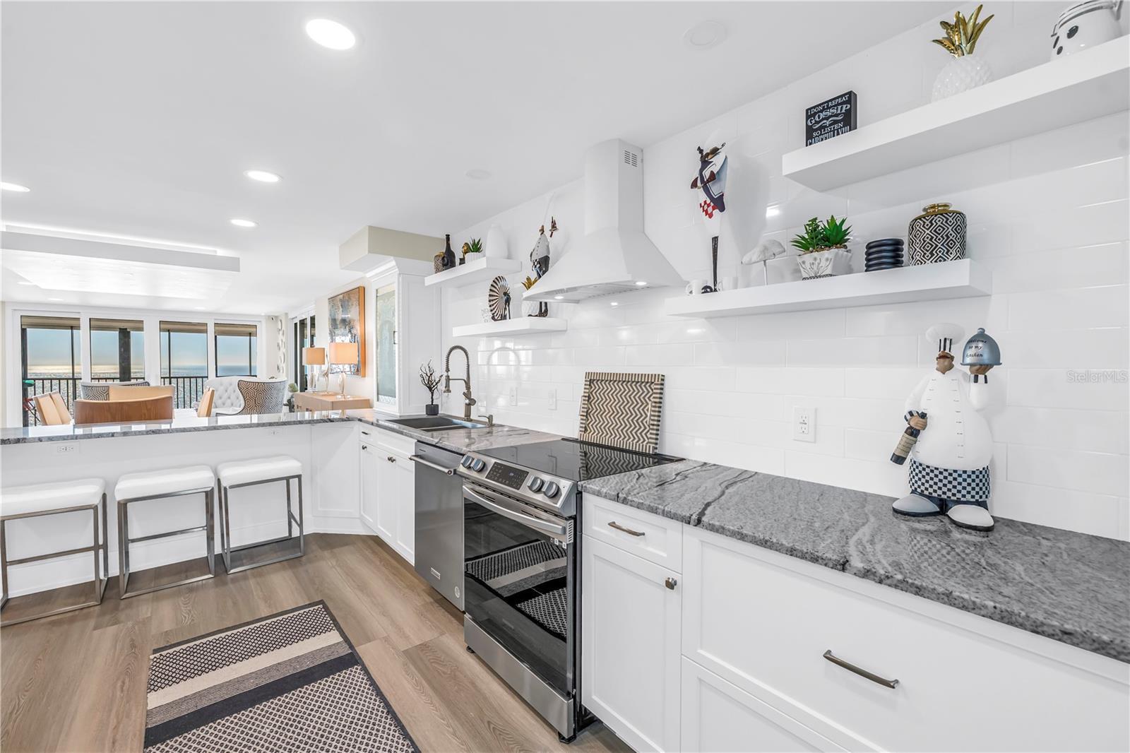 Perched atop the 10th floor, this exceptional penthouse has been masterfully reimagined with every detail perfected and no expense spared, offering a truly unparalleled beachfront lifestyle. Floor-to-ceiling impact-rated sliding doors showcase sweeping Gulf views from the kitchen, dining area, living room, and primary suite, seamlessly connecting to an expansive 60-foot wraparound balcony with new screening and electric hurricane shutters. The two guest bedrooms and the luminous, window-lined laundry room are graced with serene Intracoastal Waterway vistas, ensuring every space is infused with natural light and tranquility from sunrise to sunset. Every inch of this three-bedroom, two-bath residence speaks to refined design and uncompromising quality. Luxury plank flooring flows throughout, while the chef-inspired kitchen features quartz countertops, premium stainless-steel appliances, and custom cabinetry. Each bedroom is fitted with bespoke California Closets, and the primary suite offers direct balcony access and a spa-caliber en-suite bath with quartz counters and a glass-enclosed shower. The guest bath reflects the same elevated finishes. Behind the scenes, extensive upgrades include all new impact doors and windows, all-new plumbing and ductwork, a new relocated HVAC system optimized for comfort, a new electrical panel, wiring and lighting, and a new tankless water heater, combining technical perfection with aesthetic refinement. The penthouse lifestyle extends beyond the residence, with a curated suite of beachfront amenities including a heated pool and spa, convenient lounge and entertaining spaces, a beachfront fitness center, library, game room, whole-building water softener, secured lobby and under-building parking. Ideally situated in Madeira Beach, moments from premier dining, boutique shopping, and the iconic John's Pass Village, this penthouse also provides effortless access to Clearwater Beach, Downtown St. Petersburg, world-class sporting venues, and multiple international airports. This is a rare opportunity to acquire a residence crafted for discerning buyers who seek the pinnacle of luxury, comfort, convenience and coastal elegance.
