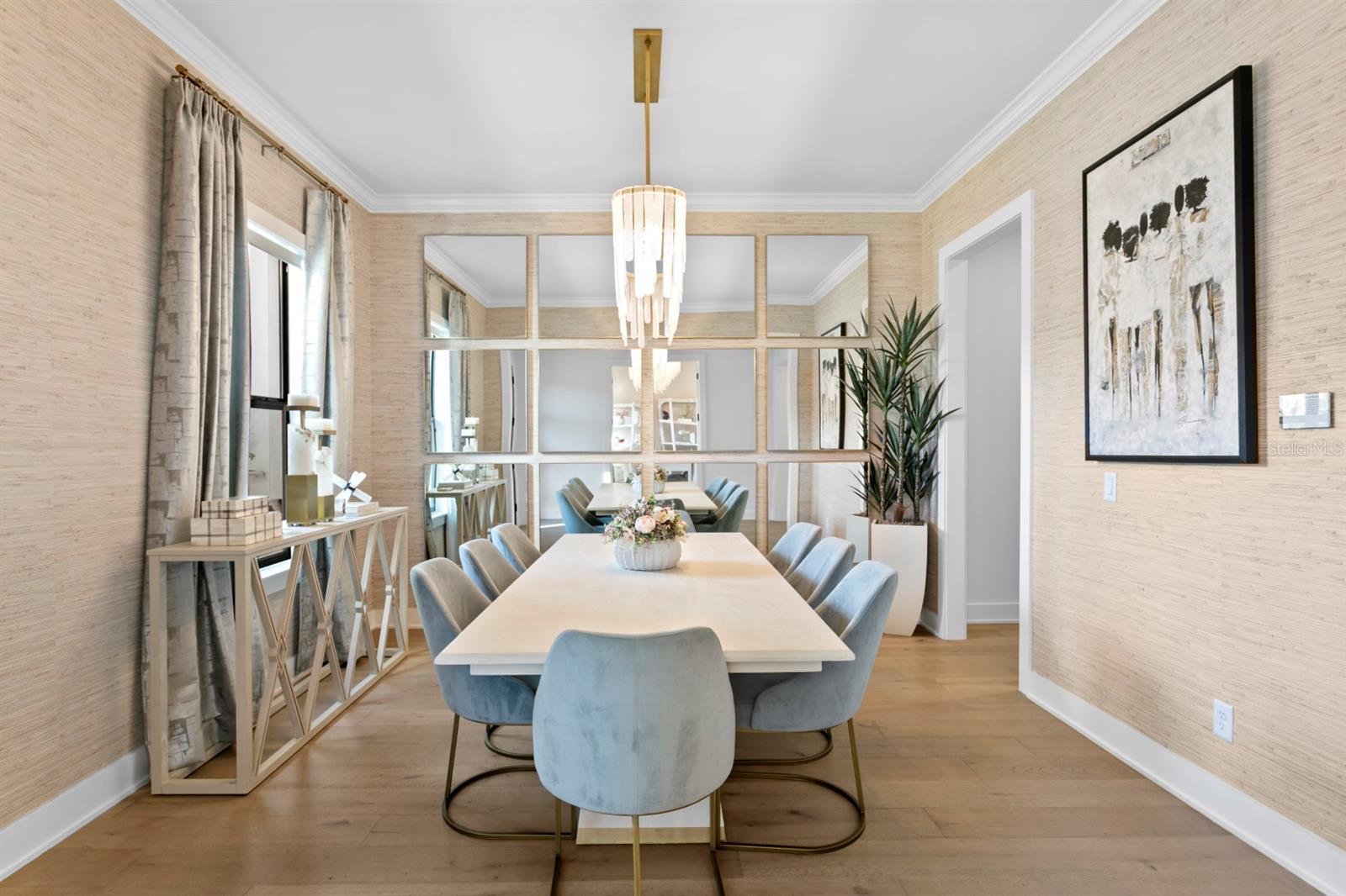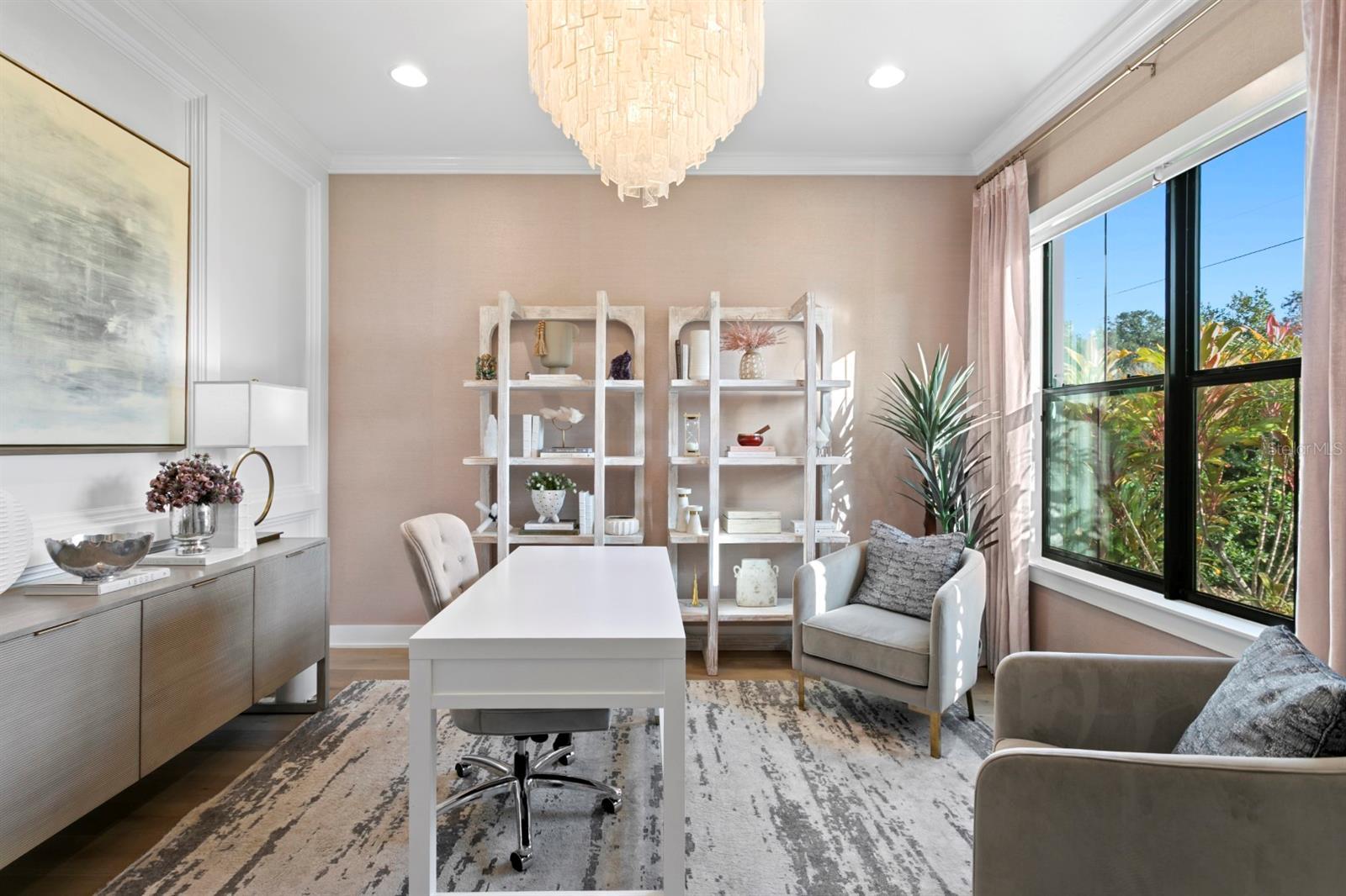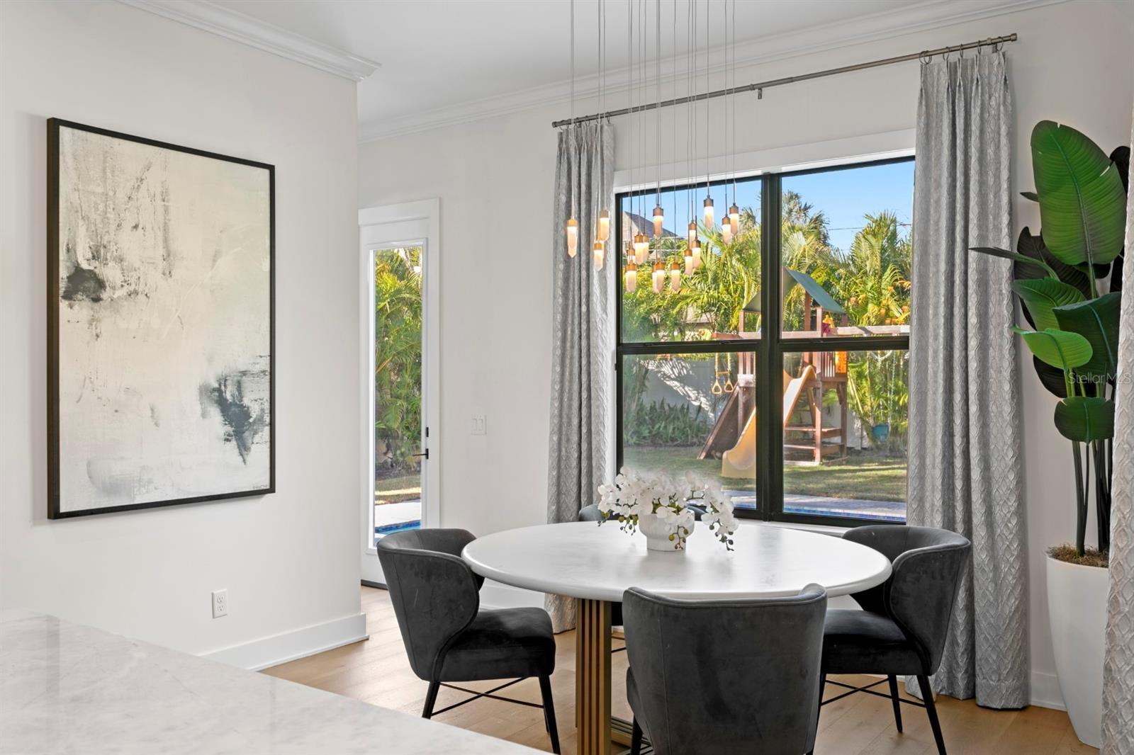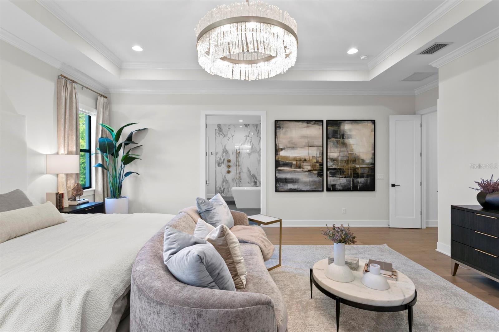 Built in 2022 by Momentum Homes, this residence is ideally located in highly sought-after Swann Estates on a 71 x 134 lot in Flood Zone X (no flood insurance required) and zoned for A-rated Grady, Coleman, and Plant schools. A professional interior designer thoughtfully curated the first floor and primary suite, creating elevated, cohesive spaces that are both beautiful and functional - offering a significant upgrade and sparing buyers the time and expense of designing and furnishing these key living areas. Custom wallpaper, designer lighting, millwork, and carefully selected finishes are seamlessly integrated throughout. This thoughtfully designed, all-block home with impact glass throughout offers 5 bedrooms, 4.5 bathrooms, and 4,532 square feet, including a first-floor bedroom and a dedicated home office. The open-concept living spaces are anchored by a gas fireplace and flow seamlessly into the chef's kitchen, showcasing upgraded Thermador appliances, quartzite countertops and backsplash, custom cabinetry, and a butler's pantry, with direct connection to the formal dining room. A sun-filled breakfast nook provides an inviting space for casual dining. The primary suite is a true retreat, highlighted by a spectacular custom walk-in closet with a large center island. The spa-inspired en suite features a large walk-in shower, separate soaking tub, dual sinks, and LED touch mirrors. Outdoor living is exceptional, featuring a covered lanai with a fully equipped outdoor kitchen, resort-style pool, and a private backyard framed by mature landscaping. Additional highlights include a functional mudroom, thoughtful storage throughout, and a layout that reflects exceptional build quality and attention to detail. Beautifully built and impeccably finished.