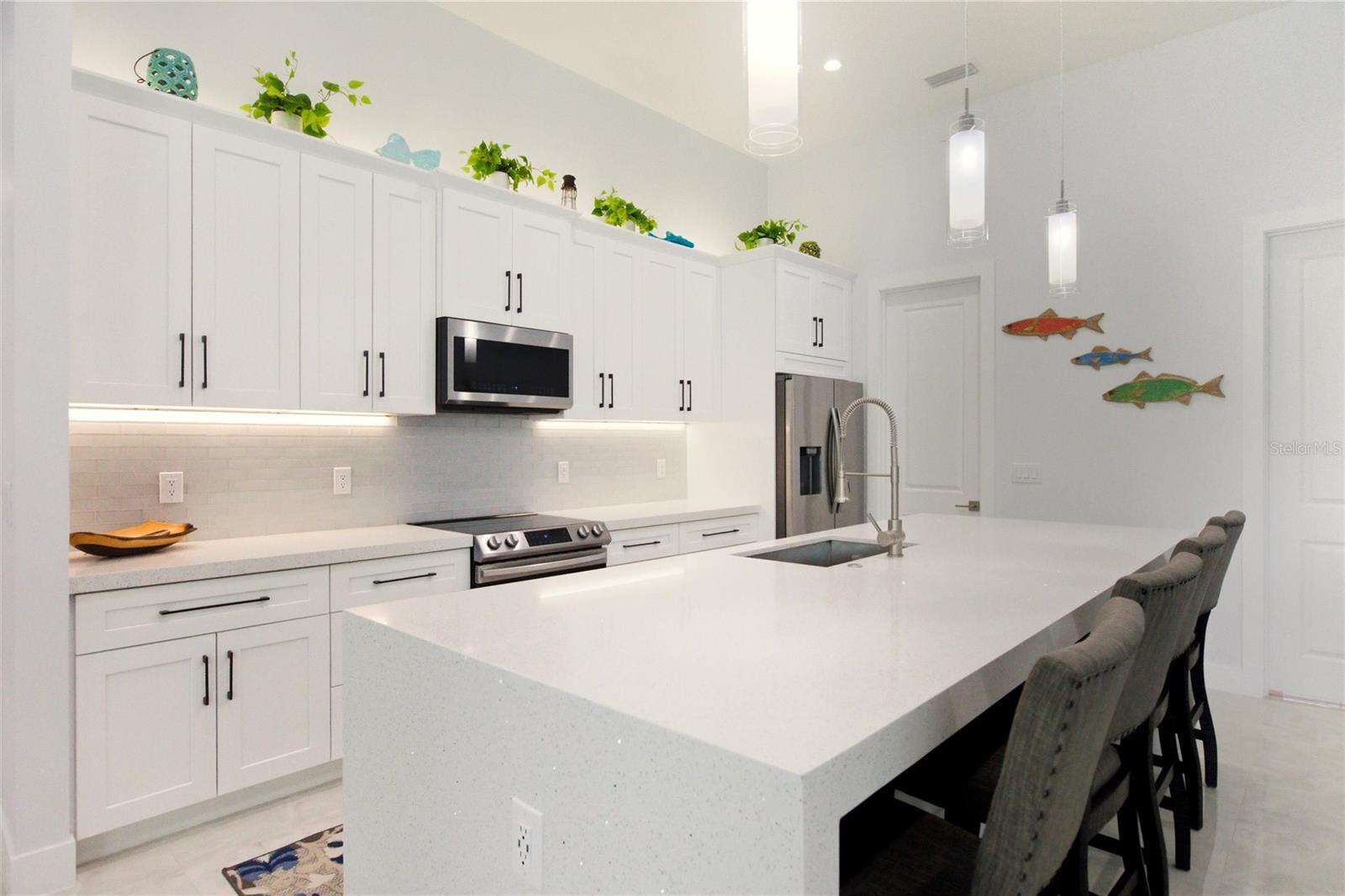 Set within the highly sought-after Pelican Community of Cape Coral, this one-owner luxury pool home blends modern elegance with relaxed Florida living. Built in 2022 and meticulously maintained, the residence offers 2,134 square feet of heated living space and 2,589 total square feet, thoughtfully designed to maximize light, flow, and functionality. A striking double-door entry opens to a dramatic foyer with soaring ceilings and immediate views of the private pool, creating a memorable first impression. The home is light and airy throughout, featuring an open-concept living room and kitchen ideal for both everyday living and entertaining. Triple sliding glass doors extend the living space outdoors, providing seamless access to the screened lanai and tranquil pool views. The kitchen is generously sized and well appointed with quartz countertops, soft-close cabinetry, and a large walk-in pantry. Adjacent to the kitchen, the dining area includes a built-in bar with wine refrigerator and sliding doors leading directly to the pool and patio, making it perfect for gatherings. The primary suite is privately positioned off the main living area and overlooks the pool. It offers dual walk-in closets with custom storage systems and a spacious en-suite bath featuring dramatic tilework, dual vanities, a soaking tub, walk-in shower, and private water closet. A split floor plan provides privacy for guests or family members, with two additional bedrooms and a full bathroom offering convenient pool access. The fourth bedroom, currently used as an office, features double doors and flexibility for a guest suite, office or library. All bedrooms include walk-in closets with built-in storage systems, and plantation shutters are installed throughout the home. Outdoor living is exceptional, with a heated pool and spa enclosed within a screened lanai. The outdoor space includes paver decking, countertops, sink, gas grill, beverage refrigerator, and ample room for lounging and dining. Over $15,000 in recent improvements (pool heater, plantation shutters, and grill exhaust system) enhance both comfort and functionality. Located just minutes from Cape Coral’s premier waterfront destinations, this turnkey home offers an exceptional lifestyle opportunity for full-time living, seasonal enjoyment, or investment use. Enjoy quick access to Cape Harbour Marina and Tarpon Point Marina with boating, dining, and entertainment, along with convenient access to Gulf waterways. Everyday shopping and services are nearby, beaches and parks are a short drive away, and the home is well positioned near local schools and major roadways for easy travel throughout Cape Coral and Fort Myers.