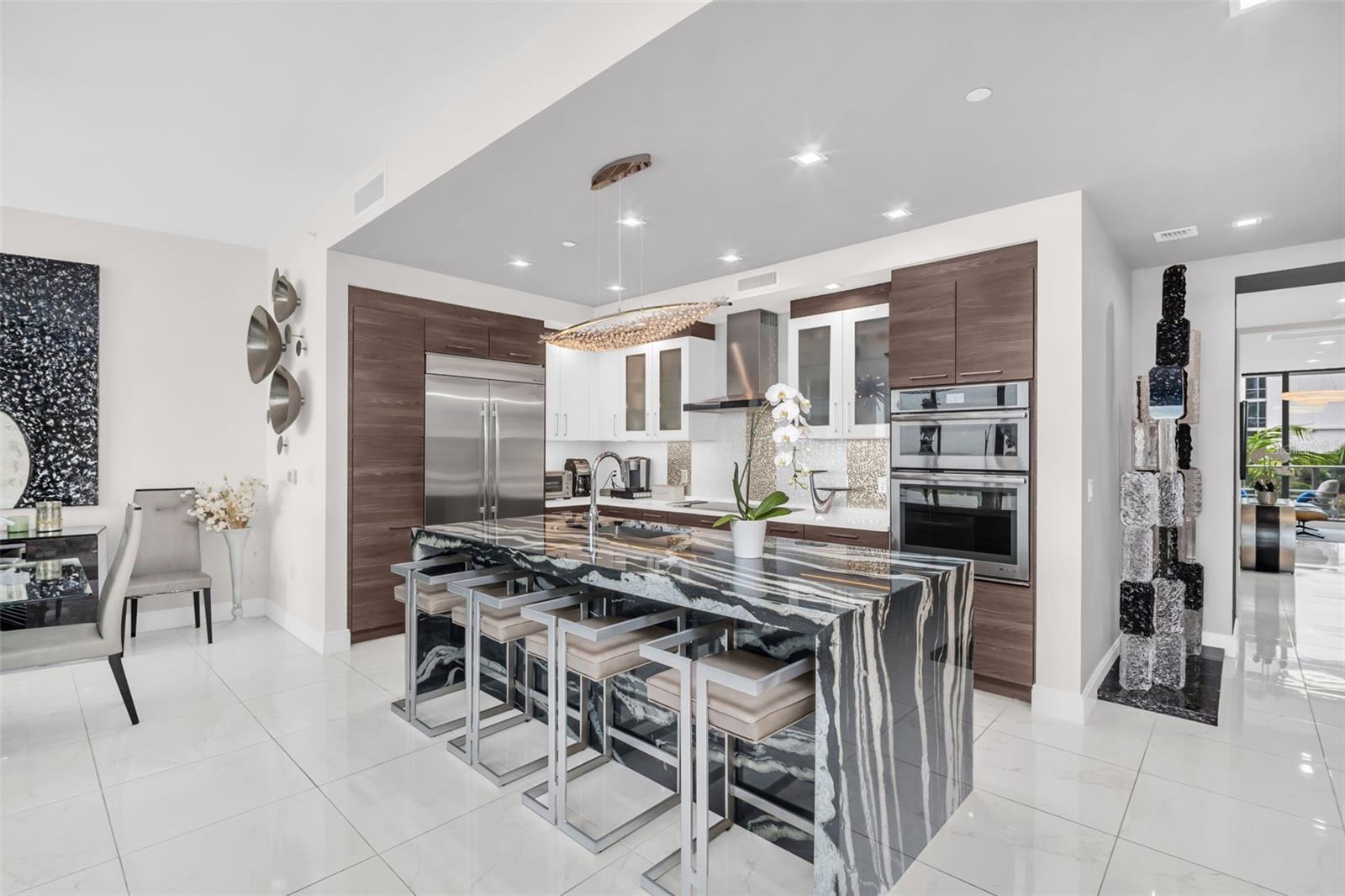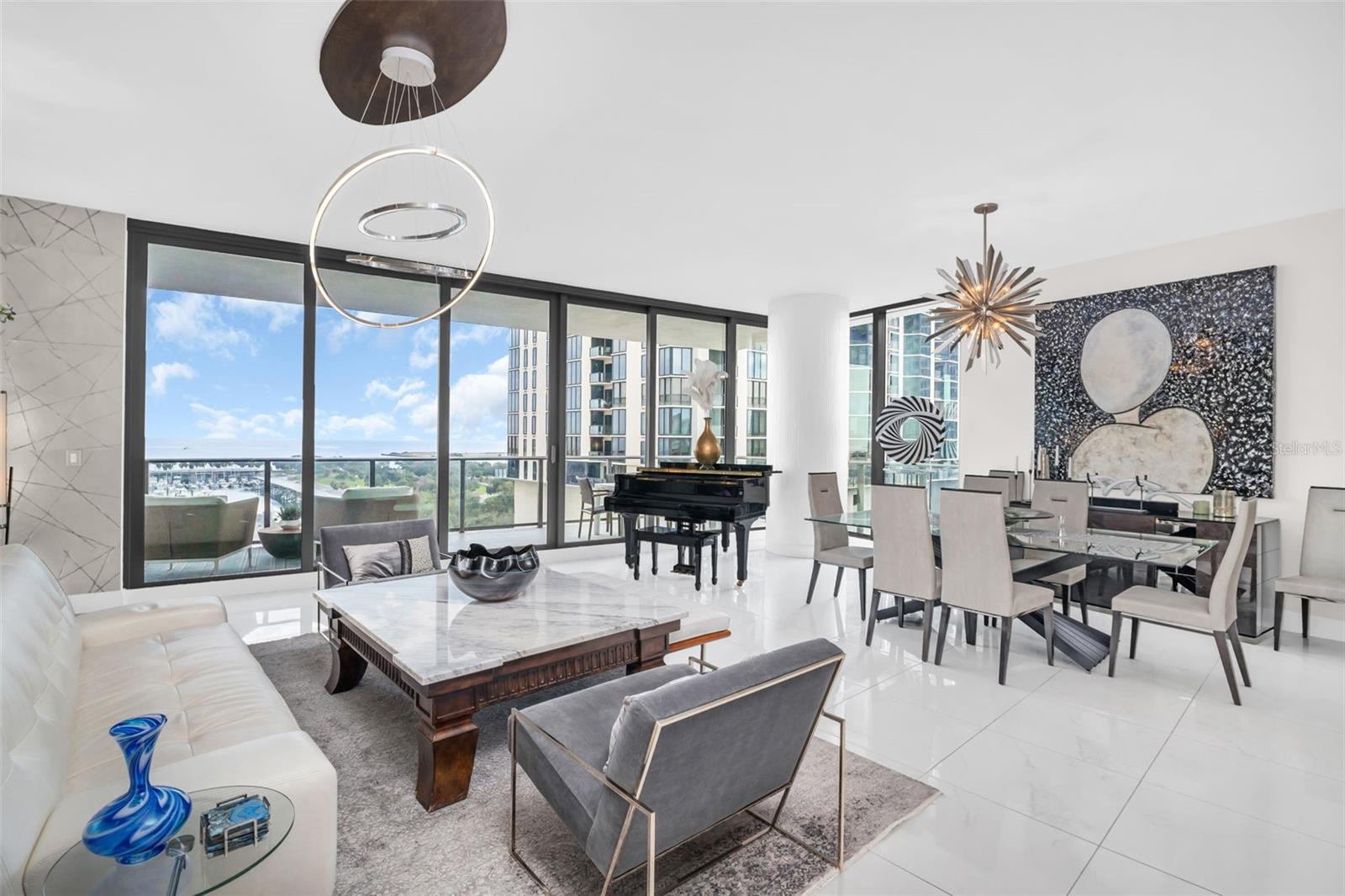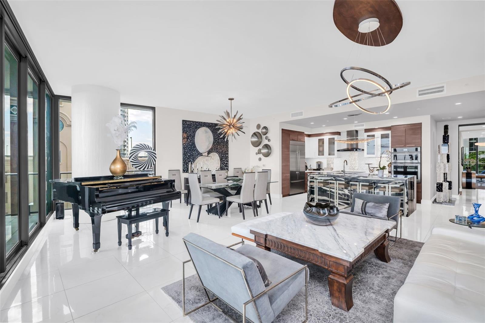 Beyond exquisite, this fully furnished downtown luxury residence at One St. Petersburg was an expansive 3-bed, 3.5-bath + den home with 2,475 interior square feet and three private terraces offering unobstructed views of city and water was reimagined by opening up a guest bedroom to the den and creating an unbelievably large bonus room with views. This bonus room adds so much to the livability of the condo. While the great room offers a perfect place for entertainment, the bonus room adds a more serene environment. Picture yourself stepping into a world of refined urban living where light and design converge. The open-plan living space is beautifully composed with porcelain tile flooring and soaring ceilings that create a bright, airy ambiance - perfect for entertaining or relaxed everyday living experiencing some of the most gorgeous sunrises. The floor-to-ceiling windows frame dramatic views that spill onto the generous terraces, expanding your living space and delivering indoor-outdoor Florida lifestyle at its best. The bonus room, opposite the great room, truly provides a secondary living space where comfort and relaxation merge while enjoying sunsets and the pool view. The gourmet kitchen features sleek, contemporary cabinetry contrasted with luxe countertops and designer tile backsplashes. High-end stainless appliances and a spacious island provide both function and a striking focal point for culinary experiences. Elegant lighting fixtures and refined finishes throughout elevate every room with a sense of sophistication and warmth. The primary suite is a private retreat with abundant natural light, generous closet space, and a spa-inspired bath featuring designer fixtures and clean modern lines. An additional ensuite bedroom created as a versatile den offers guests a comfortable sleeping option. Unwind on not just one, but three private terraces - perfect for morning coffee, evening sunsets, or al fresco dining against the backdrop of downtown St. Pete's vibrant skyline and waterfront. You will find one oversized terrace directly off the great room, one of the bonus rooms, and another private terrace off the owner's suite. Residents enjoy the unmatched One St. Petersburg lifestyle with resort-level amenities, including a dramatic 30' lobby, multiple owners' lounges, a private bar, a full fitness center, pool and cabanas, concierge services, and 24/7 security - all just steps from world-class dining, entertainment, and the waterfront.