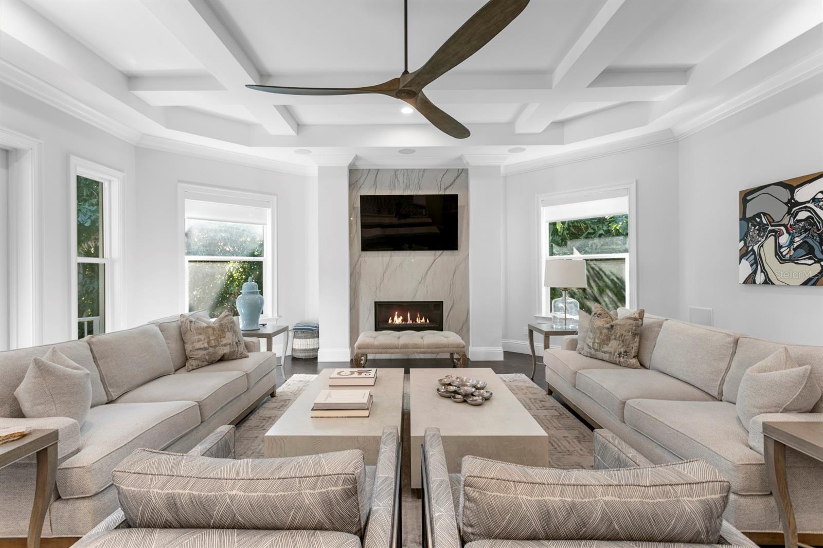 - Ceiling Fans(s), Coffered Ceiling(s), Crown Molding, Eat-in Kitchen, In Wall Pest System, Kitchen/Family Room Combo, Open Floorplan, Solid Wood Cabinets, Stone Counters, Walk-In Closet(s)