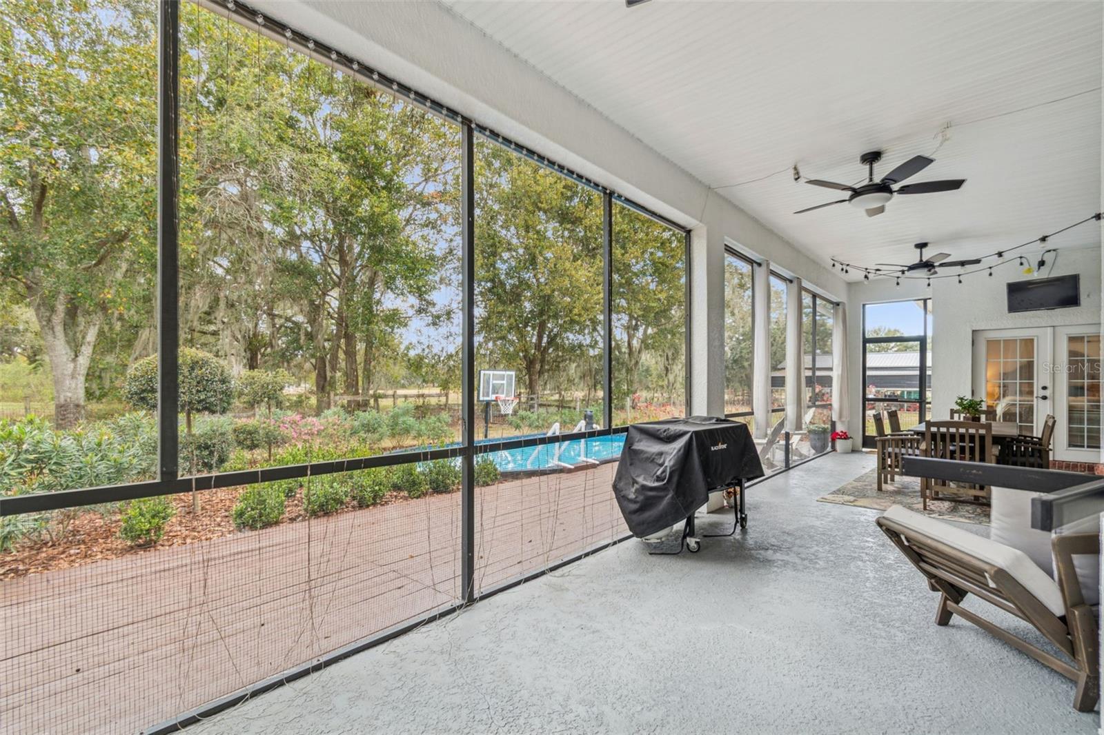 Bring the horses, bring the cows... Enjoy refined country living on nearly 2 acres in this custom 4-bedroom, 3-bath ranch-style pool home, set well back from Cork Rd with a long driveway, side-entry oversized garage, and postcard views of mature trees and a private pond. The approach, landscaping, and fenced yard give the property a true estate feel while still being just minutes to major routes, schools, and everyday conveniences. Inside, high ceilings, crown molding, and a spacious great room anchored by a wood-burning fireplace create a warm, open gathering space that lives larger than the square footage. Large windows and multiple 8' French and sliding glass doors frame serene views and invite natural light throughout the main living areas. The upgraded kitchen features granite counters, slate flooring, solid wood cabinets, stainless appliances, and a generous peninsula that flows into the dining area and great room, making cooking and entertaining effortless. A dedicated dining room provides additional space for hosting, while an interior utility/laundry room with storage keeps daily life organized. The split-bedroom layout offers privacy, with a spacious primary suite that includes dual closets, a tray ceiling, and an en-suite bath finished with travertine flooring, double vanities, soaking tub, and separate shower. Three secondary bedrooms, each with built-in closets, share two additional full baths, giving plenty of flexibility for family, guests, or a home office. Outdoor living is a highlight, with a large screened rear porch overlooking the pool, open deck, fenced yard. A fire pit area gathering area, multiple porches (front and rear, covered and screened) create multiple zones for relaxing, playing, or hosting gatherings. New roof in 2022 A 24x32 former school portable (needs work) with water, electric, and central heat/air plus an attached 24x30 pole barn add tremendous versatility—ideal for a workshop, hobby or craft studio, storage, or an incredible playhouse or entertainment space. Additional outbuildings and sheds, RV parking, chicken coop, and ample driveway and garage space make the property functional for toys, equipment, or small business storage needs. Practical features include a 2022 roof, block and stucco construction on slab, central HVAC, whole-house central vacuum, well and septic, security system, and low-e windows. With no HOA, ASC-1 zoning, and a rare combination of usable land, water frontage with fishing pier, and a well-appointed home, this must-see Plant City property is ready for its next owner to move in and enjoy.