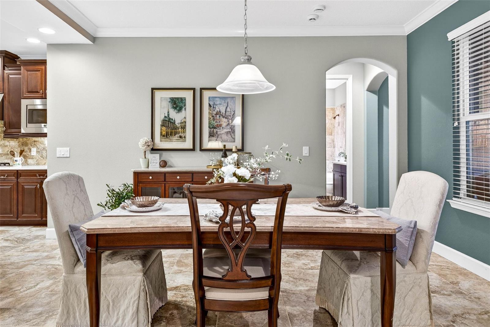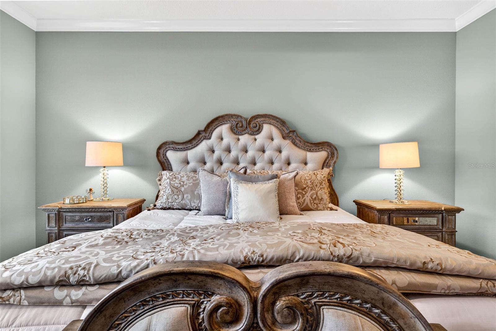 - Built-in Features, Ceiling Fans(s), Coffered Ceiling(s), Crown Molding, High Ceilings, In Wall Pest System, Kitchen/Family Room Combo, Open Floorplan, Primary Bedroom Main Floor, Split Bedroom, Stone Counters, Thermostat, Tray Ceiling(s), Walk-In Closet(s), Window Treatments