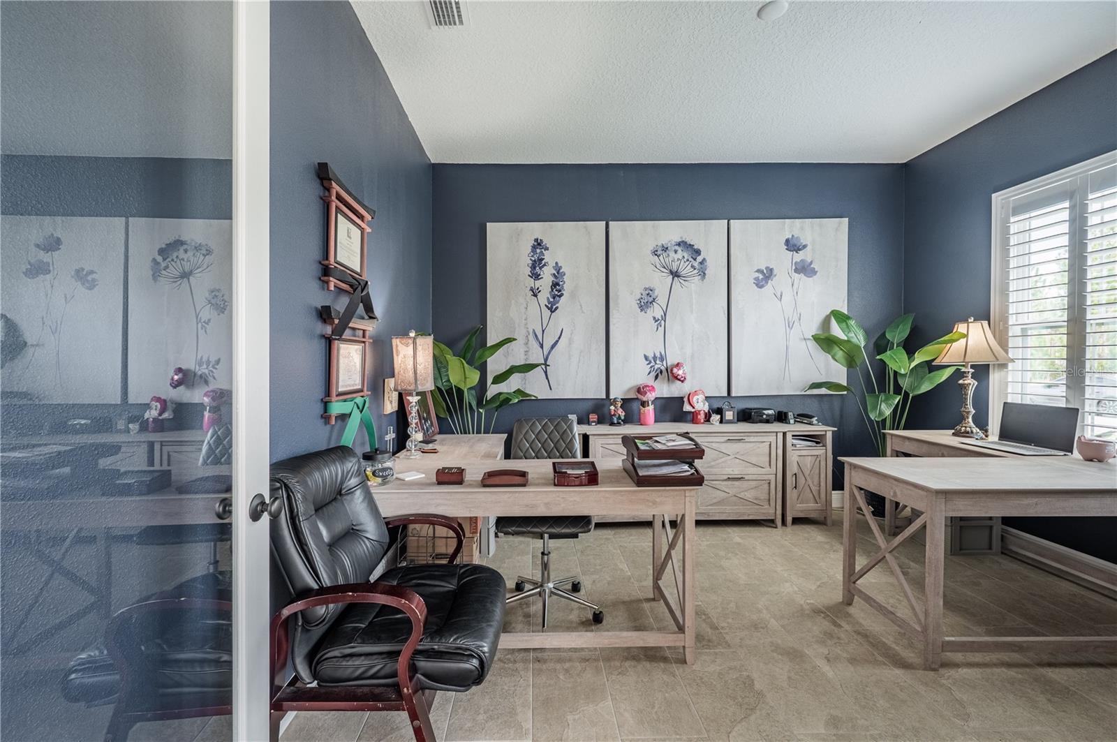 - Ceiling Fans(s), Coffered Ceiling(s), Crown Molding, Eat-in Kitchen, High Ceilings, In Wall Pest System, Open Floorplan, Primary Bedroom Main Floor, Solid Surface Counters, Solid Wood Cabinets, Thermostat, Walk-In Closet(s), Window Treatments