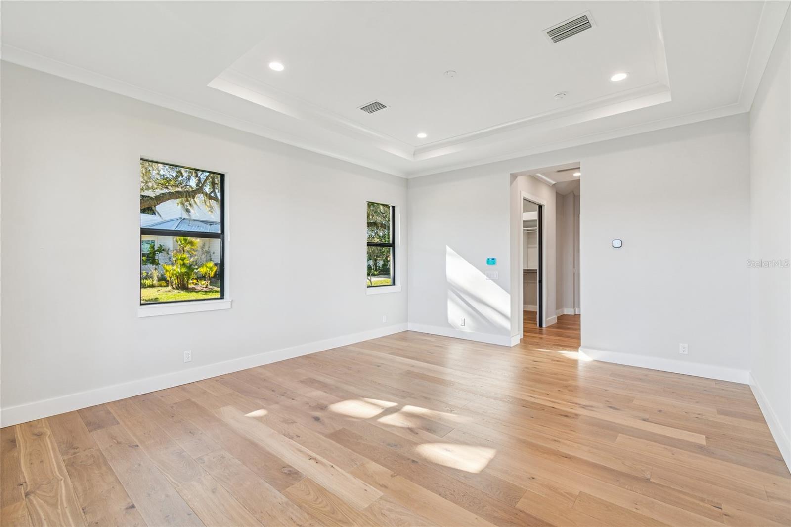- Coffered Ceiling(s), High Ceilings, Kitchen/Family Room Combo, Open Floorplan, Primary Bedroom Main Floor, Solid Surface Counters, Solid Wood Cabinets, Split Bedroom, Thermostat, Walk-In Closet(s)