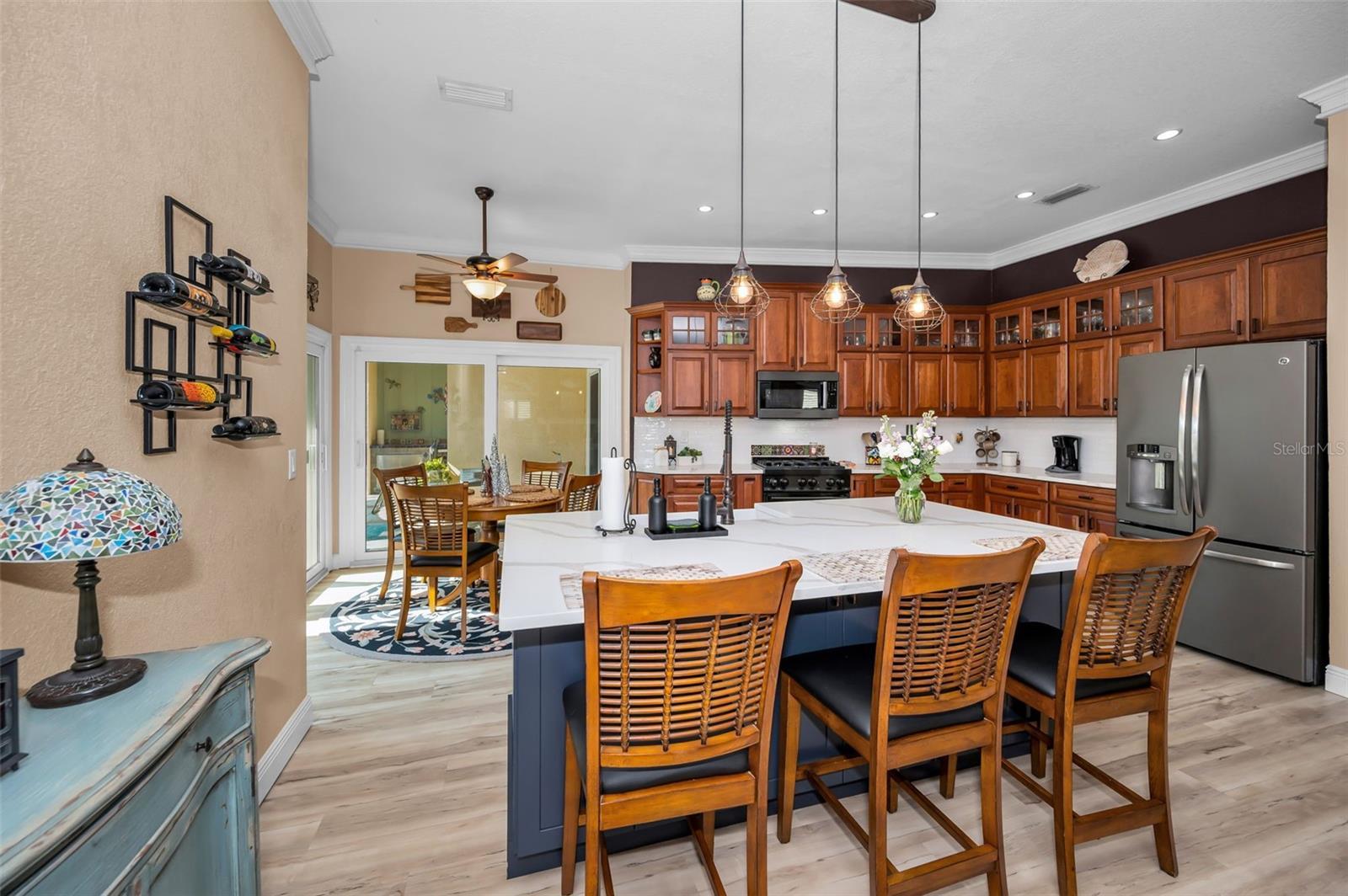 - Ceiling Fans(s), Crown Molding, Eat-in Kitchen, High Ceilings, Kitchen/Family Room Combo, Open Floorplan, Solid Wood Cabinets, Split Bedroom, Stone Counters, Thermostat, Walk-In Closet(s), Window Treatments