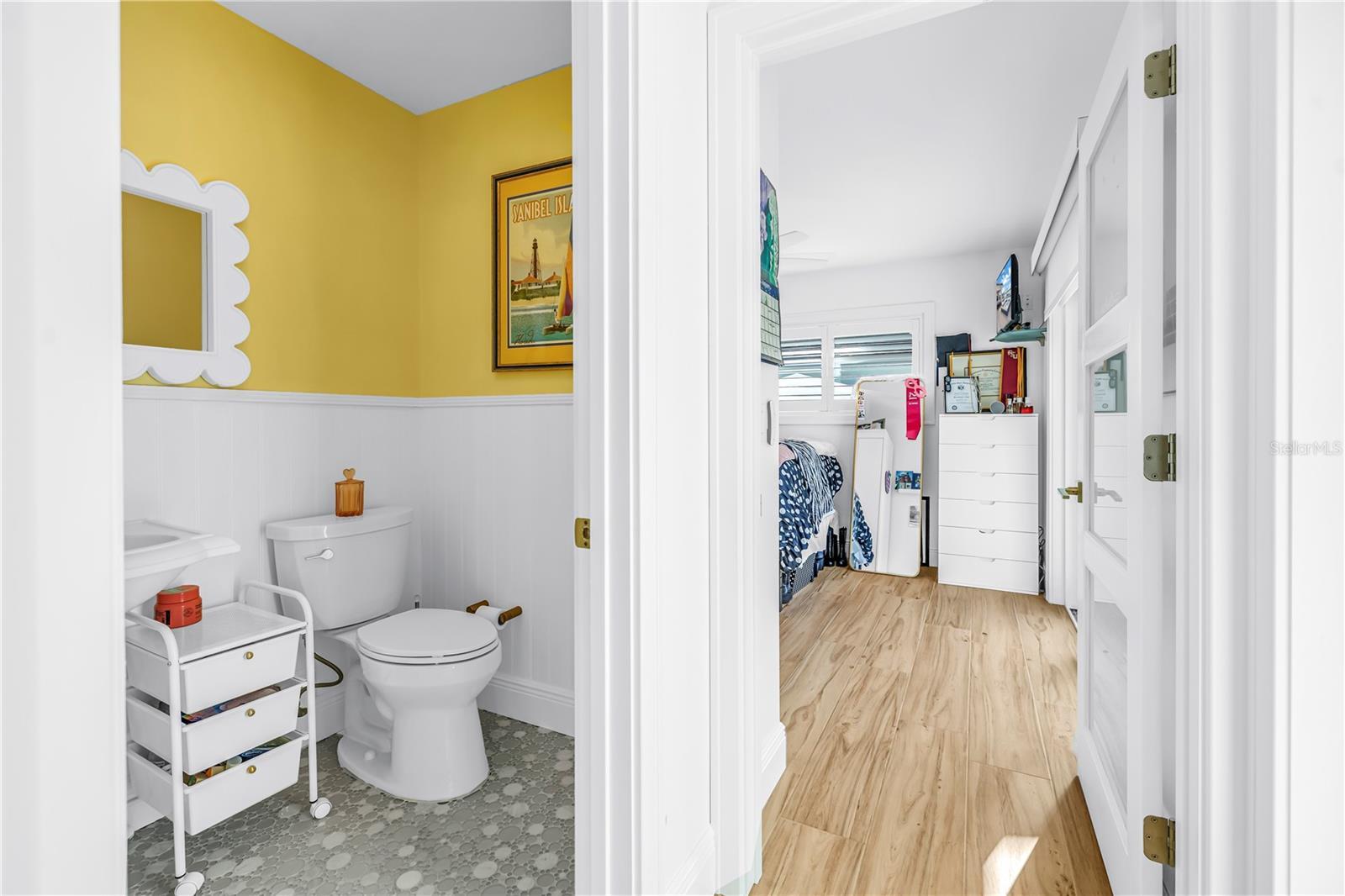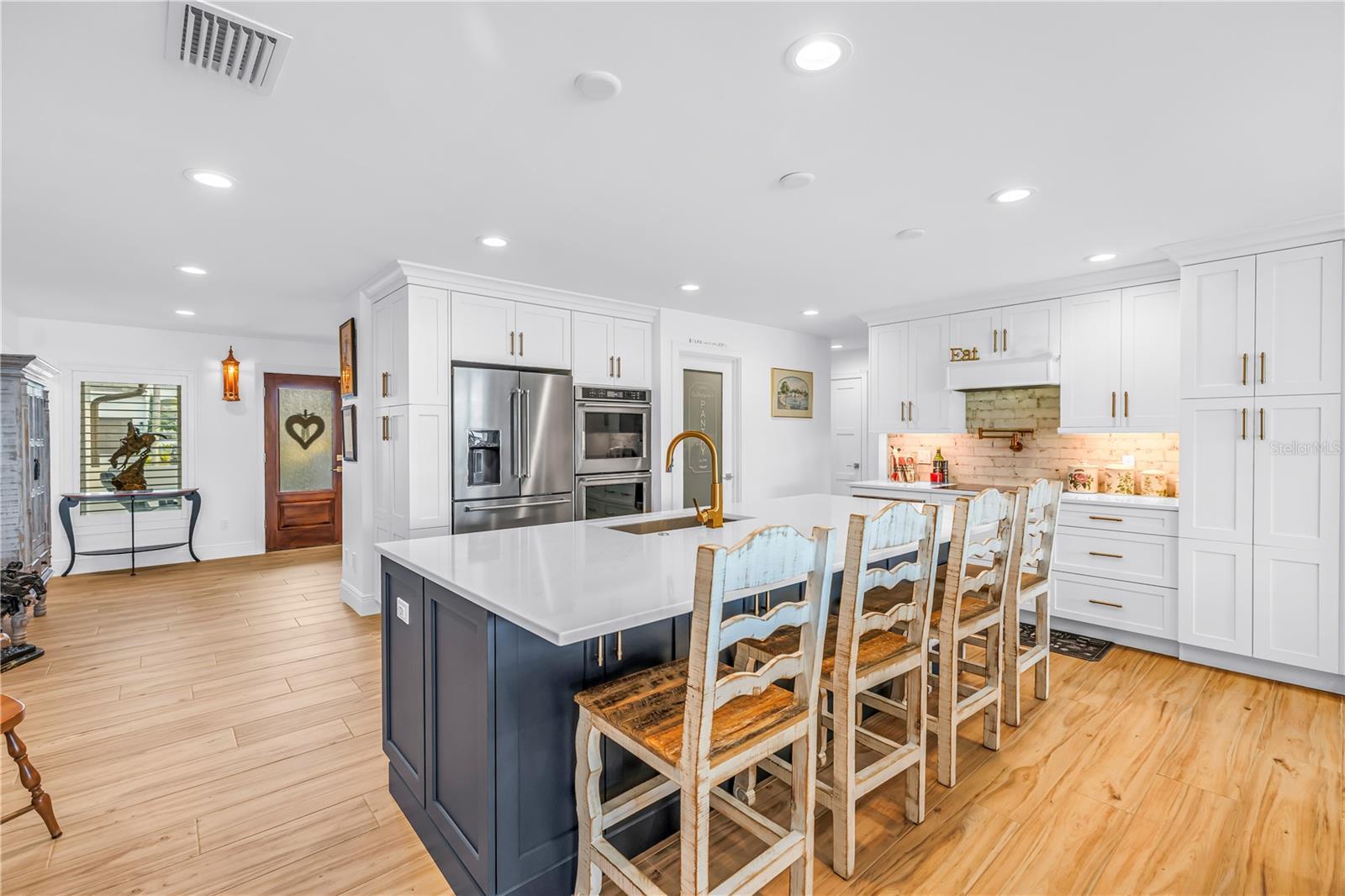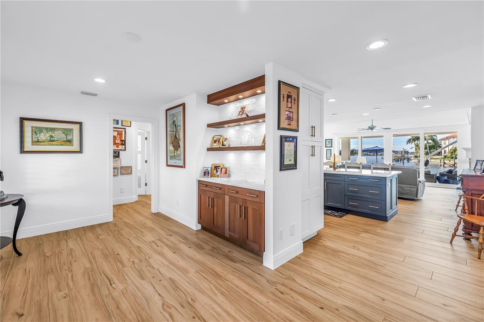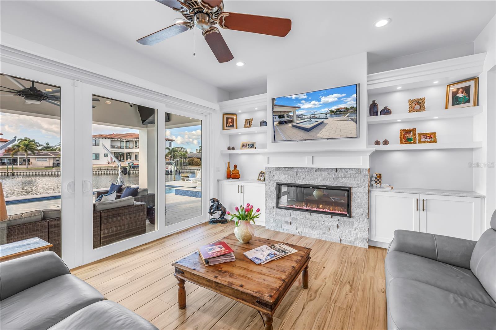 Under contract-accepting backup offers. This fully renovated (2023), waterfront home offers an exceptional blend of luxury, functionality, and modern design. Featuring four bedrooms, two and a half bathrooms, and two flex rooms, the home showcases a split floor plan, enhanced by recessed lighting, new tile flooring throughout, abundant storage, newer impact windows and doors, and elegant plantation shutters. The chef’s kitchen is thoughtfully designed with KitchenAid stainless steel appliances, including a double oven and warming drawer, French-door refrigerator, walk-in pantry, quartz countertops, and a pot filler. A wet bar adds to the home’s entertaining appeal, complete with an additional beverage refrigerator and freezer. The living area is anchored by a striking electric stone fireplace and framed by impact sliding doors that open to the covered rear patio, offering beautiful bayou views. The primary suite is a true retreat also enjoying waterfront views and direct patio access through impact sliding doors. The expansive owner’s walk-in closet and dressing room features custom cabinetry and a built-in island/dresser. The spa-inspired primary bathroom includes custom cabinetry, dual sinks with quartz countertops, and a large, tiled shower with dual shower heads and a rain shower head. A guest bedroom also opens directly to the rear patio, further enhancing the home’s connection to the outdoors. Two other spacious bedrooms share a stunning hall bathroom with a tub/shower combination. Exterior features are equally impressive, with protected open-water frontage, a private dock, a covered patio with tongue-and-groove ceiling, and pavered front and rear outdoor spaces. The custom built salt water lap style pool and spa offers relaxation with a spa completes the resort-style setting. A large open patio space make outdoor entertaining easy. Additional highlights include two outbuildings (a large storage shed and a doll house feel shed that is air conditioned, which could be used as an office, a whole-house generator, a central vacuum system, and an oversized garage with an impact-rated garage door. The well-appointed laundry room offers custom cabinetry, quartz countertops, and a soaking sink. Major system upgrades provide peace of mind, including fully redone electrical and plumbing, newer HVAC, a newer tankless water heater providing instant whole-house hot water, a newer tile roof (2024), and newer front doors, a water softener—making this exceptional waterfront property truly move-in ready. Easy access to downtown by boat or car. Enjoy Florida's lifestyle in this luxury home!
